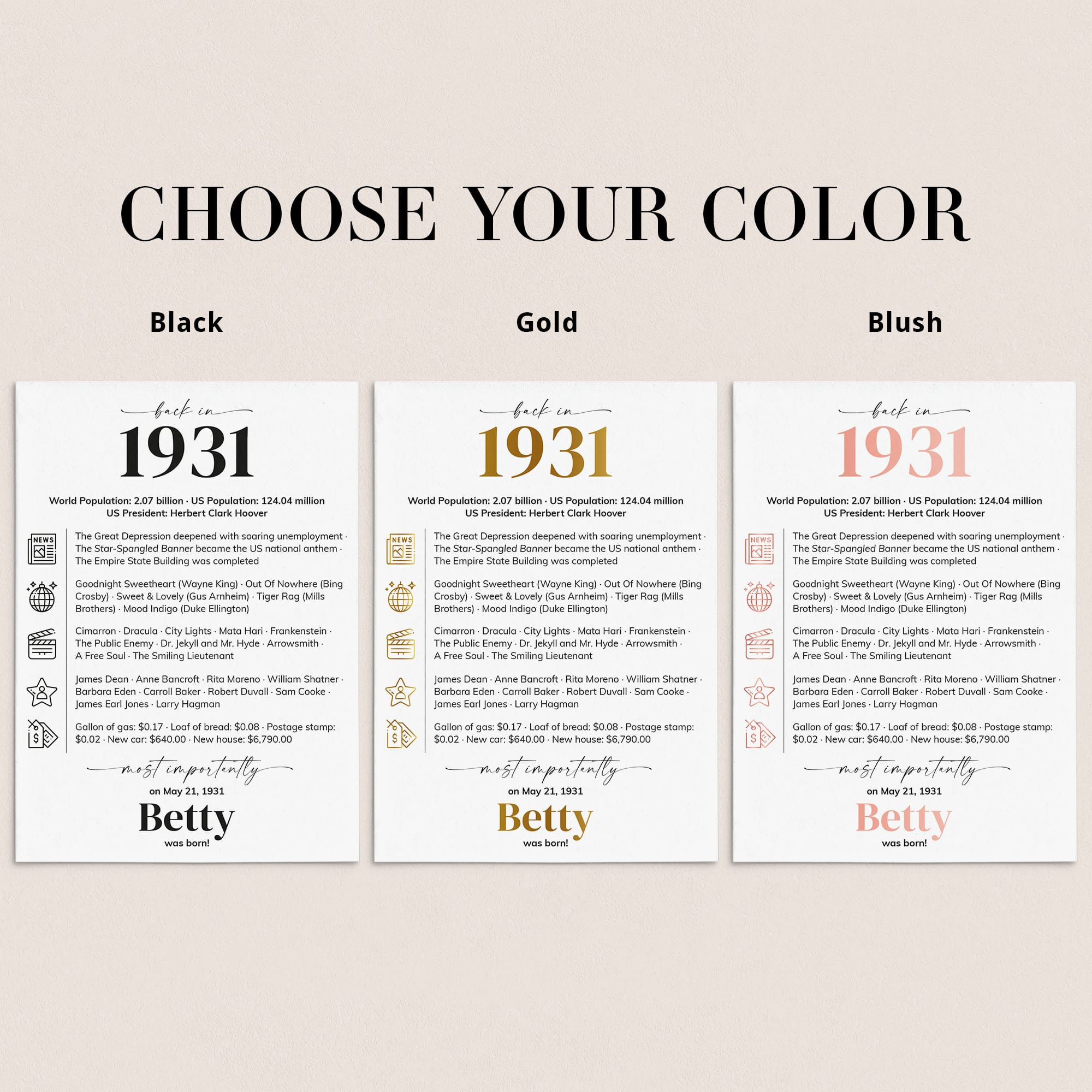 Looking for a stylish way to add a personal touch to a 95th birthday party? Our “Back in 1931” table card is a sleek and modern addition to any 95th birthday celebration in 2026. Personalized with the honoree’s name and birth date, this design combines entertaining facts from 1931 with clean icons for a fresh, contemporary look.