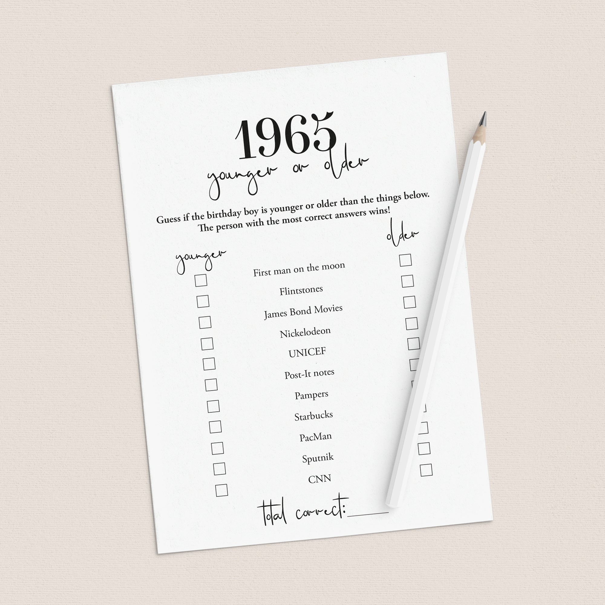 The printable 1965 Birthday Games Bundle is an instant download. After purchase you will receive a download link immediately on screen. Also within minutes of your order and payment, an e-mail will be sent to you with a link for your download.