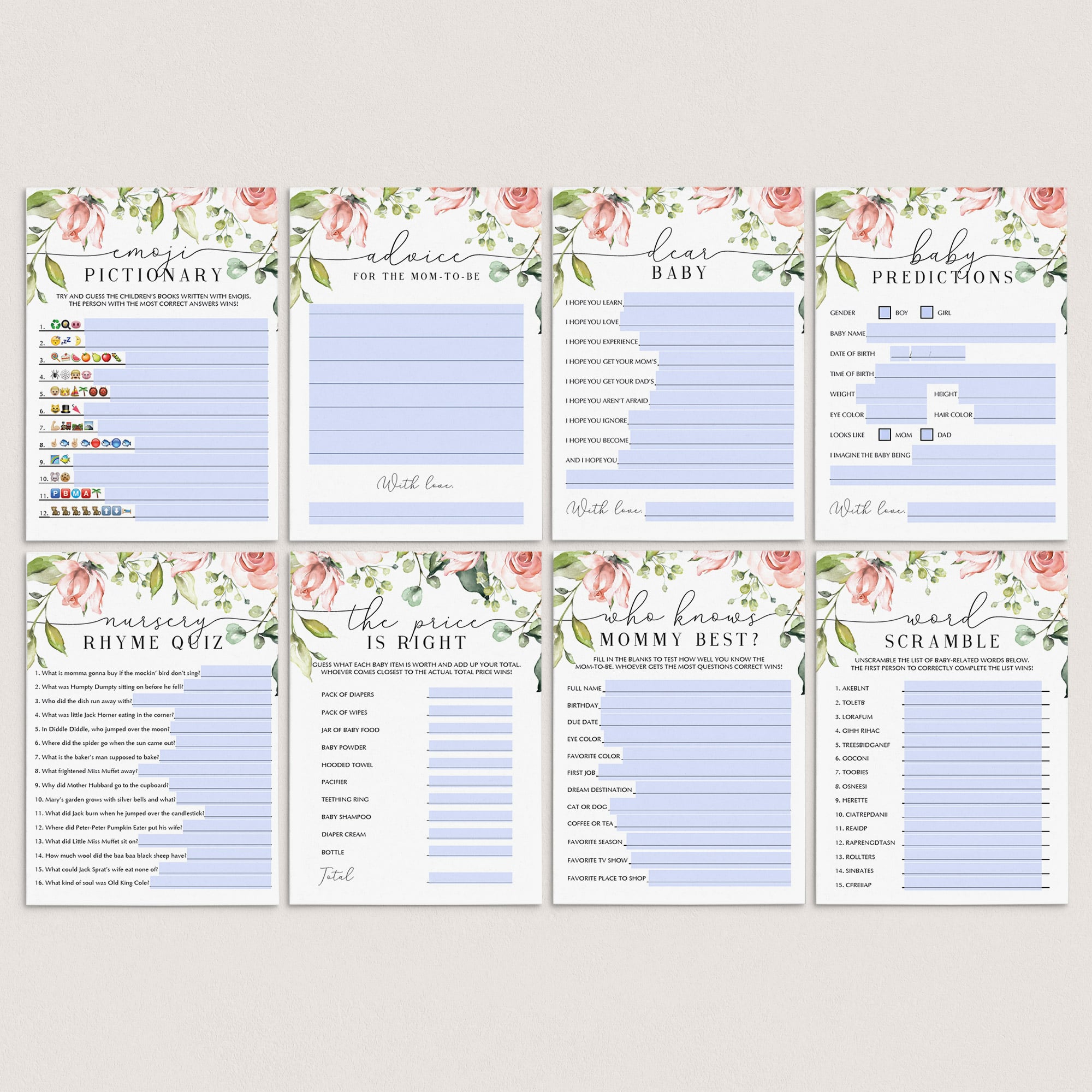 This blush floral baby shower game bundle includes the following 8 zoom baby shower games: