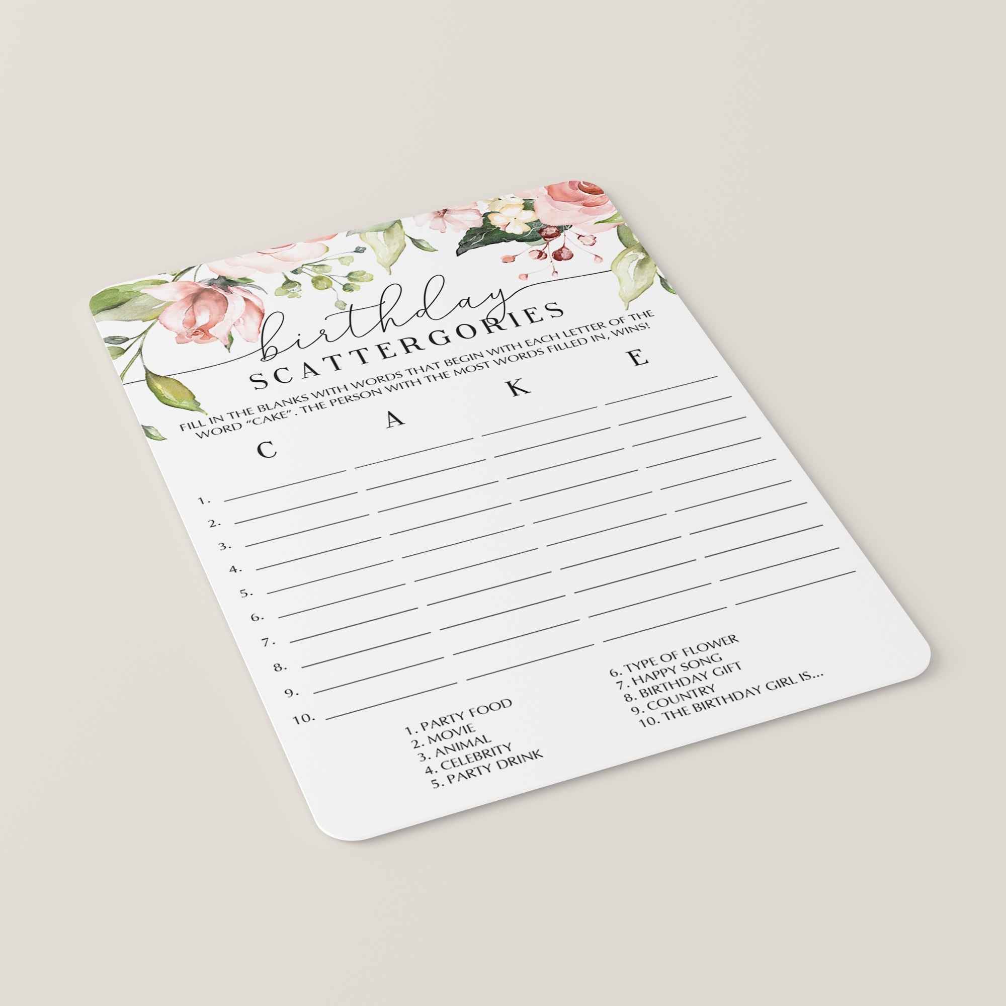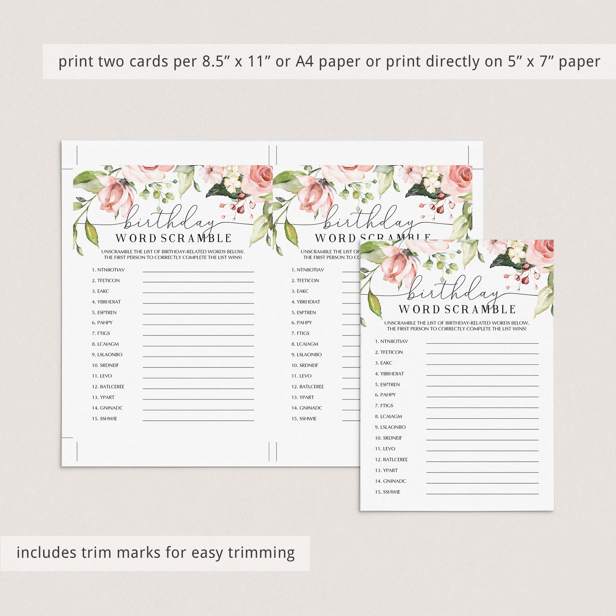 This blush floral birthday party games bundle includes the following fun & easy party games: