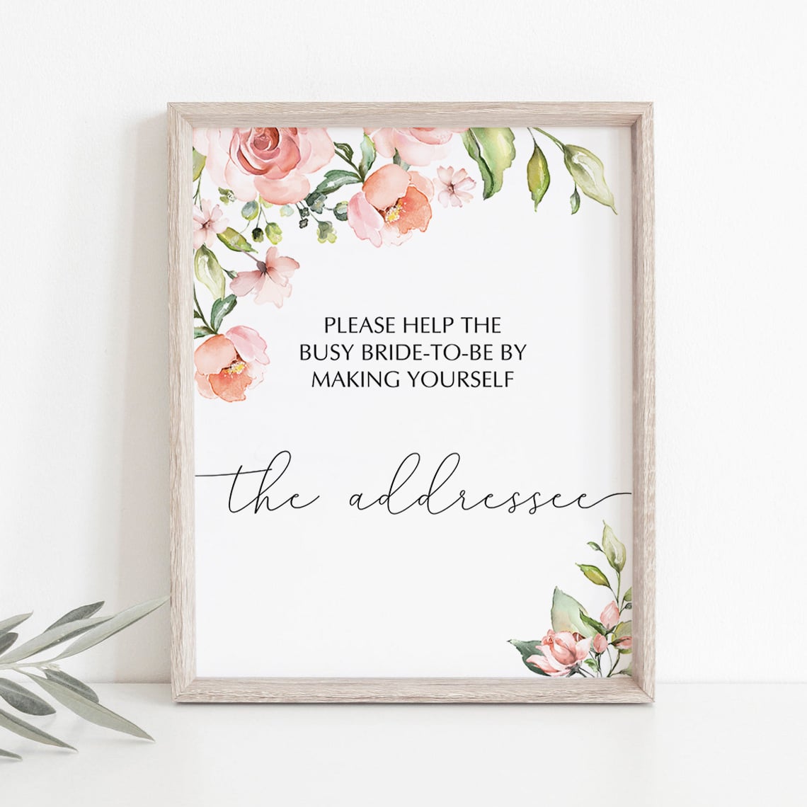 Help the busy bride-to-be send out her thank you cards with this blush floral bridal shower addressee card sign.