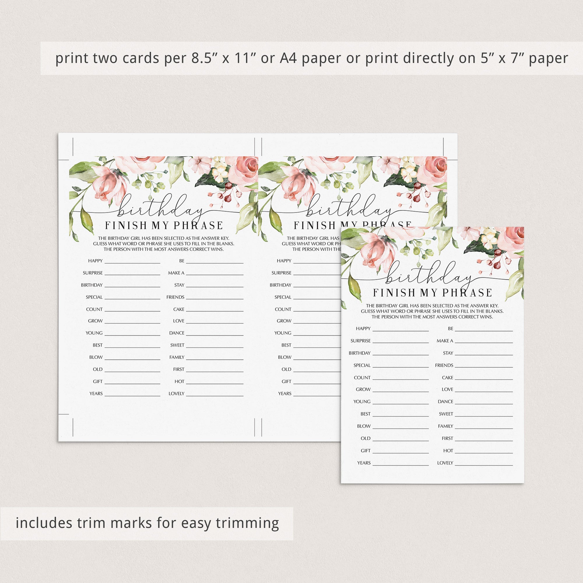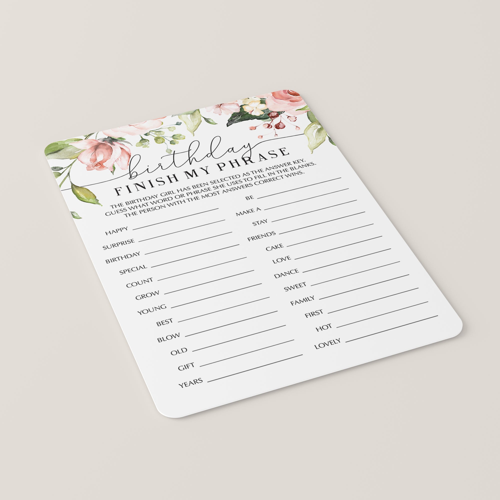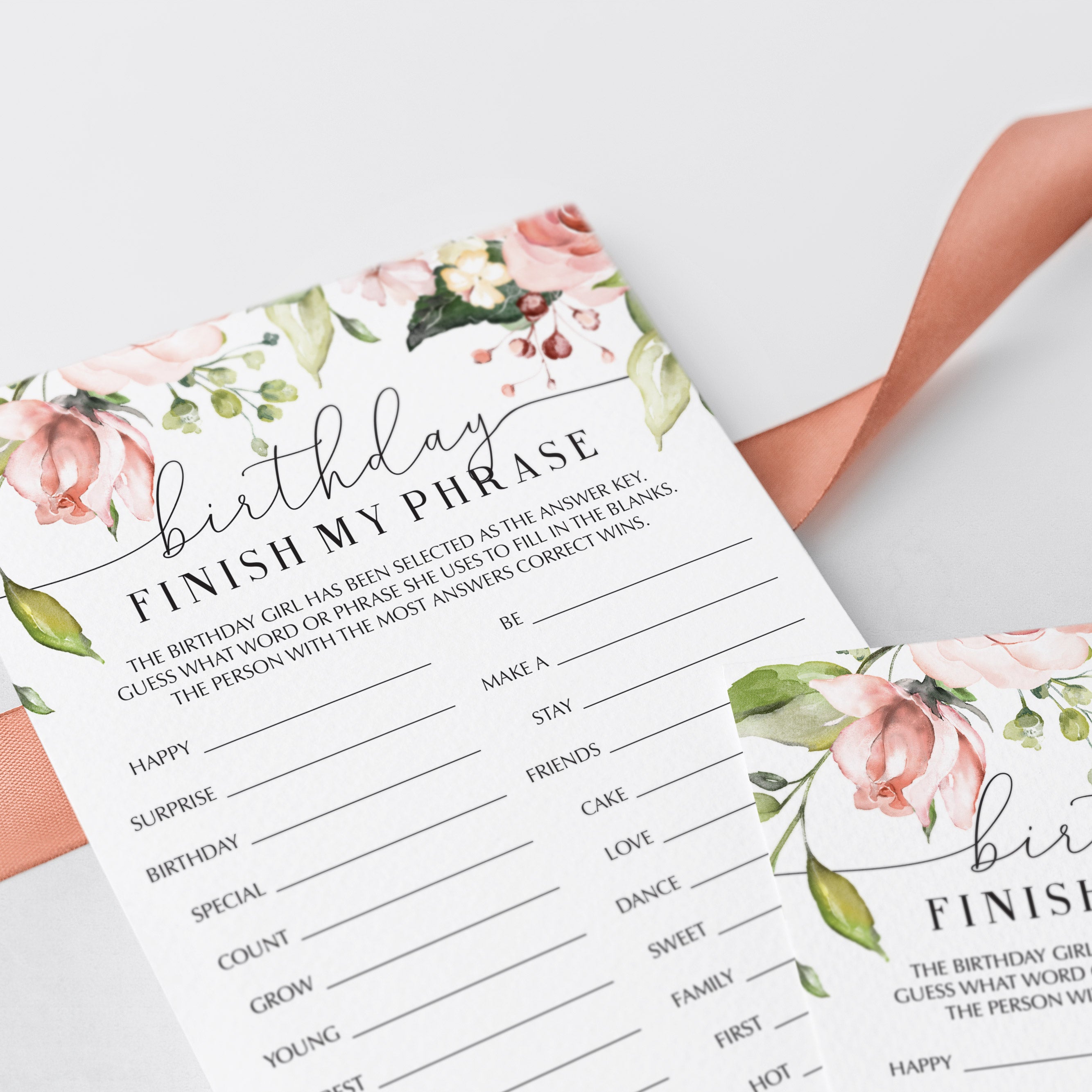 Are you looking for a fun icebreaker game for your women's birthday party? Play Finish My Phrase with these gorgeous blush floral game cards with watercolor flowers. It is the perfect addition to a women's birthday party.