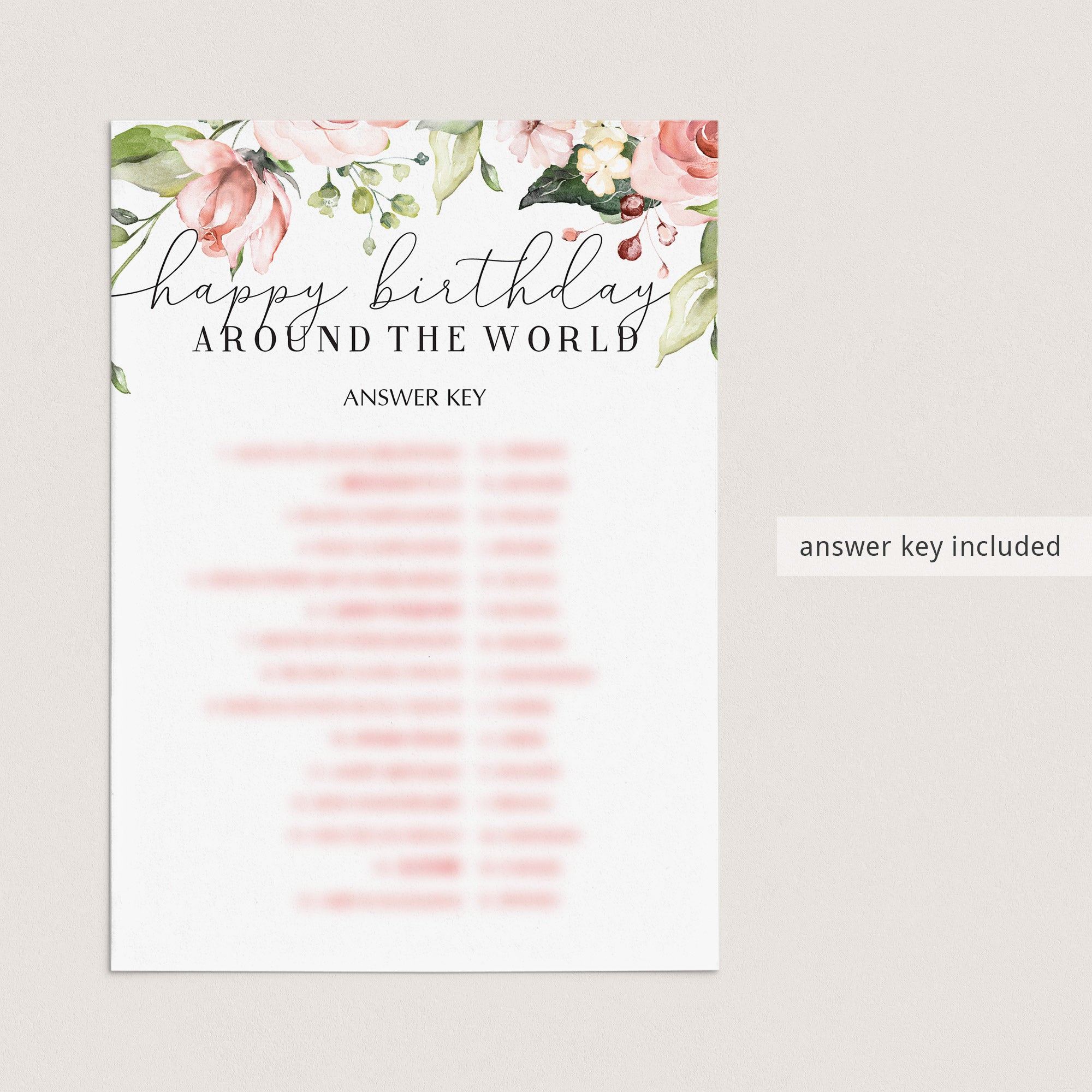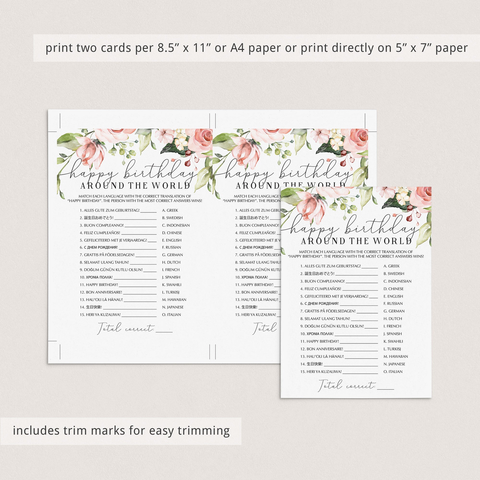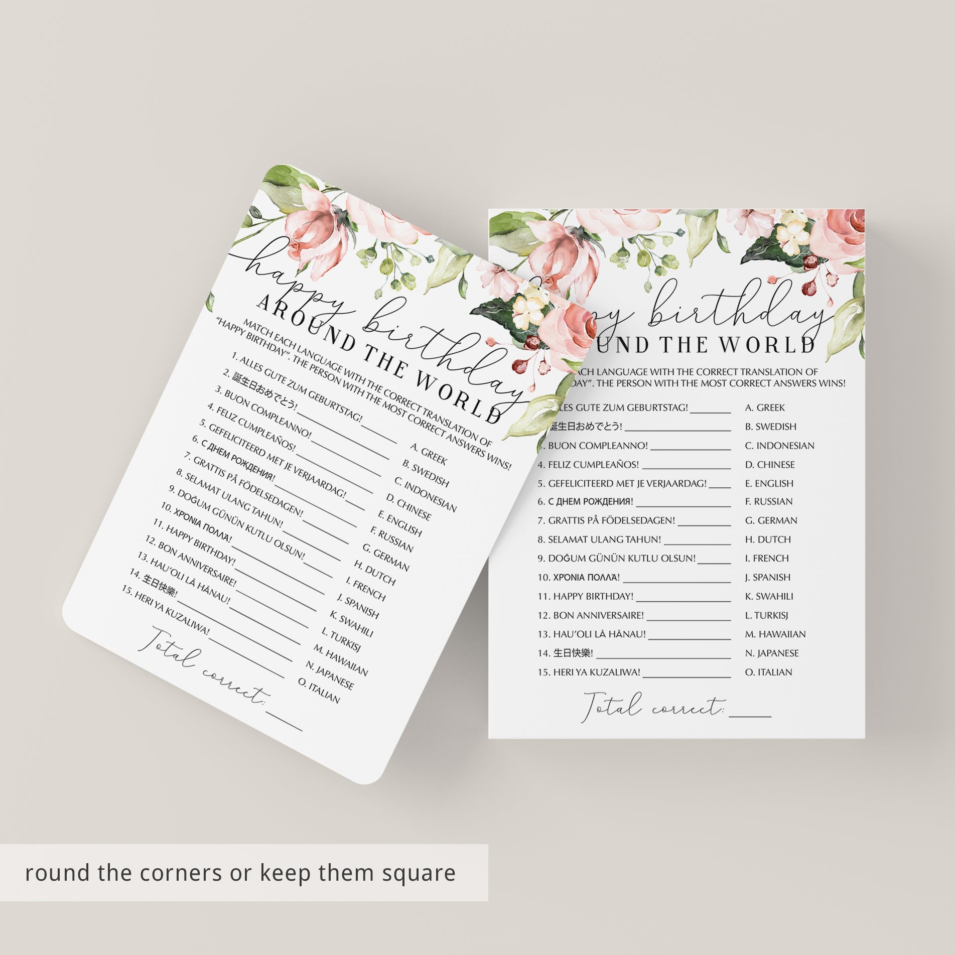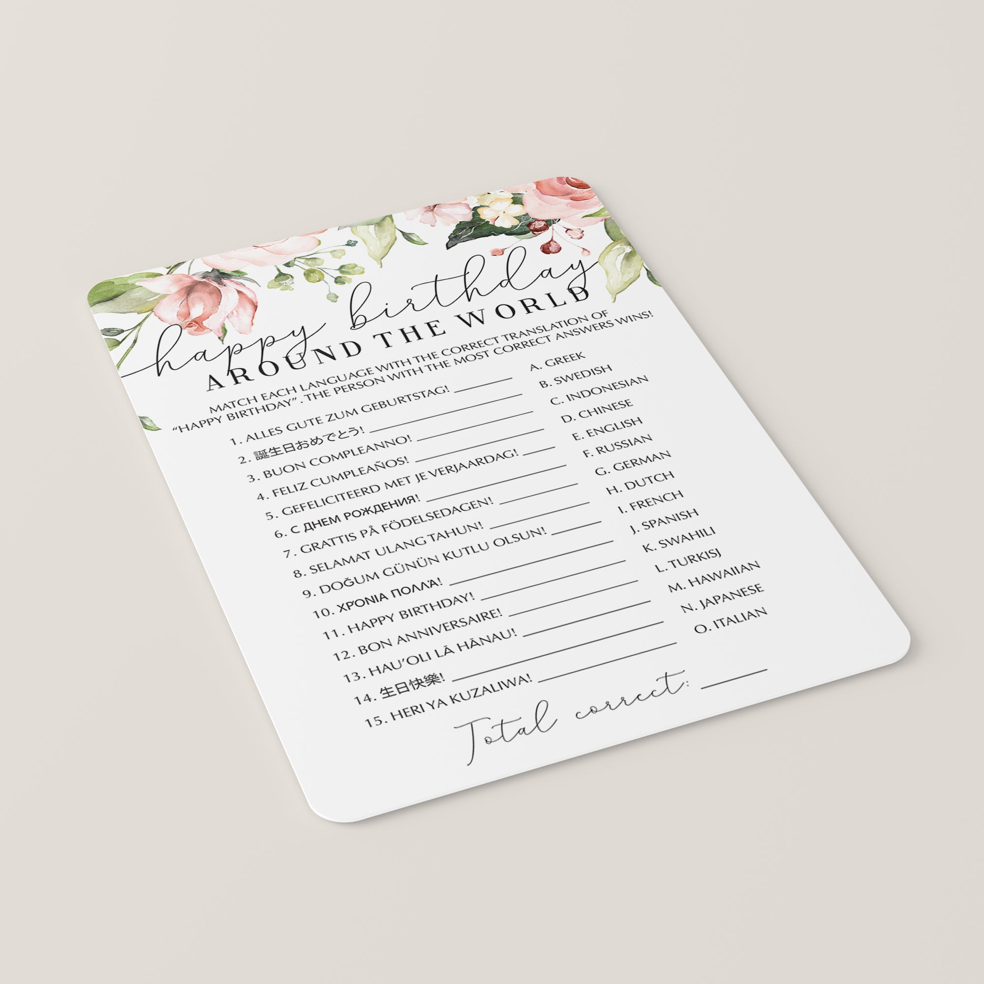 The game is very easy to play. Print and distribute these gorgeous blush floral birthday game cards with watercolor floral arrangements and a pen to each of your guests. They have to match each version of the words “Happy Birthday” with its language of origin. The person with the most correct answers wins. This game is the perfect addition to your ladies birthday brunch.
