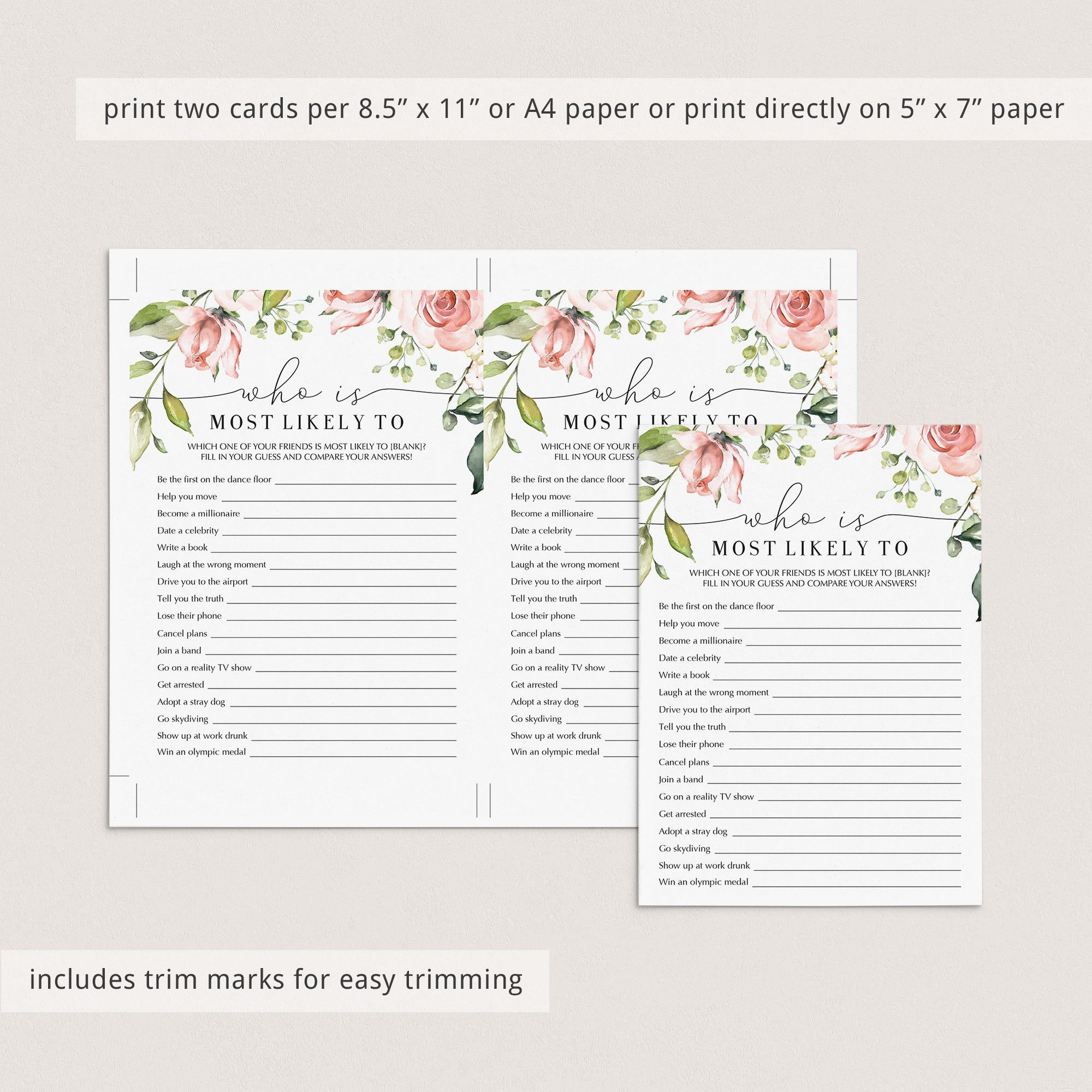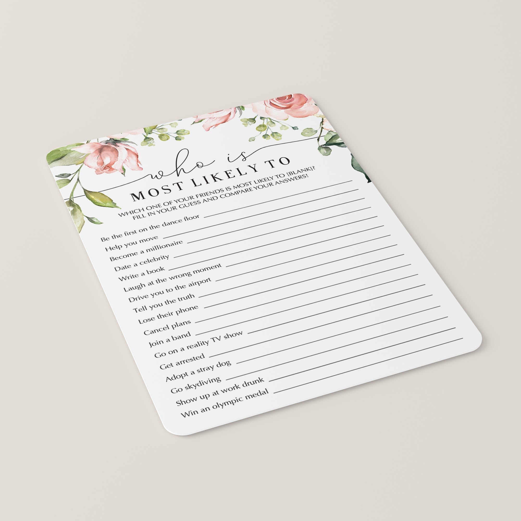 Are you looking for a hilarious game and great conversation starter for your ladies night? Play Who's Most Likely To.... This fun game has 17 Most Likely To questions for friends that will get everyone talking and laughing. You will get to know your friends at some new level.  The watercolor flowers give the game a chic touch and will make everyone excited for the night!