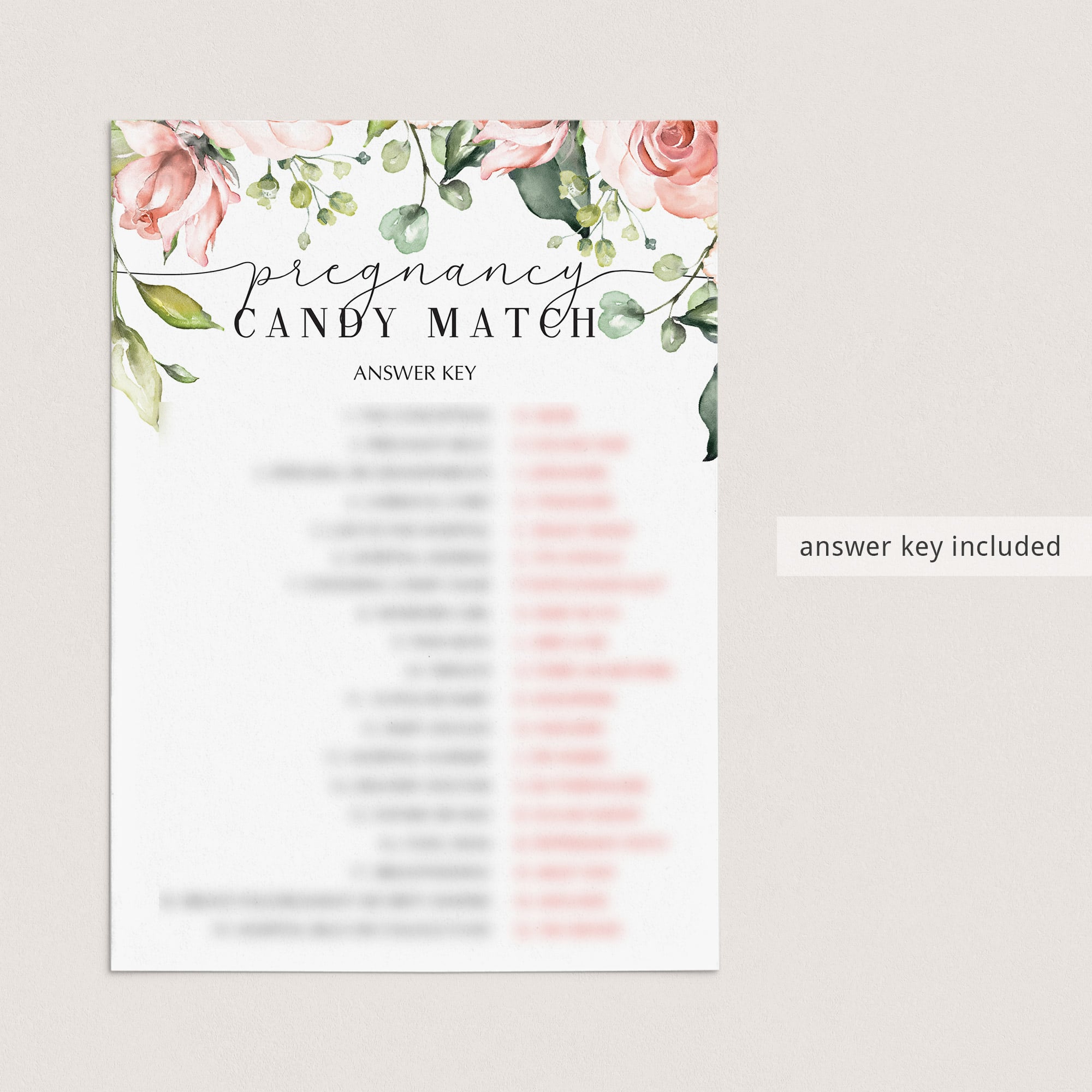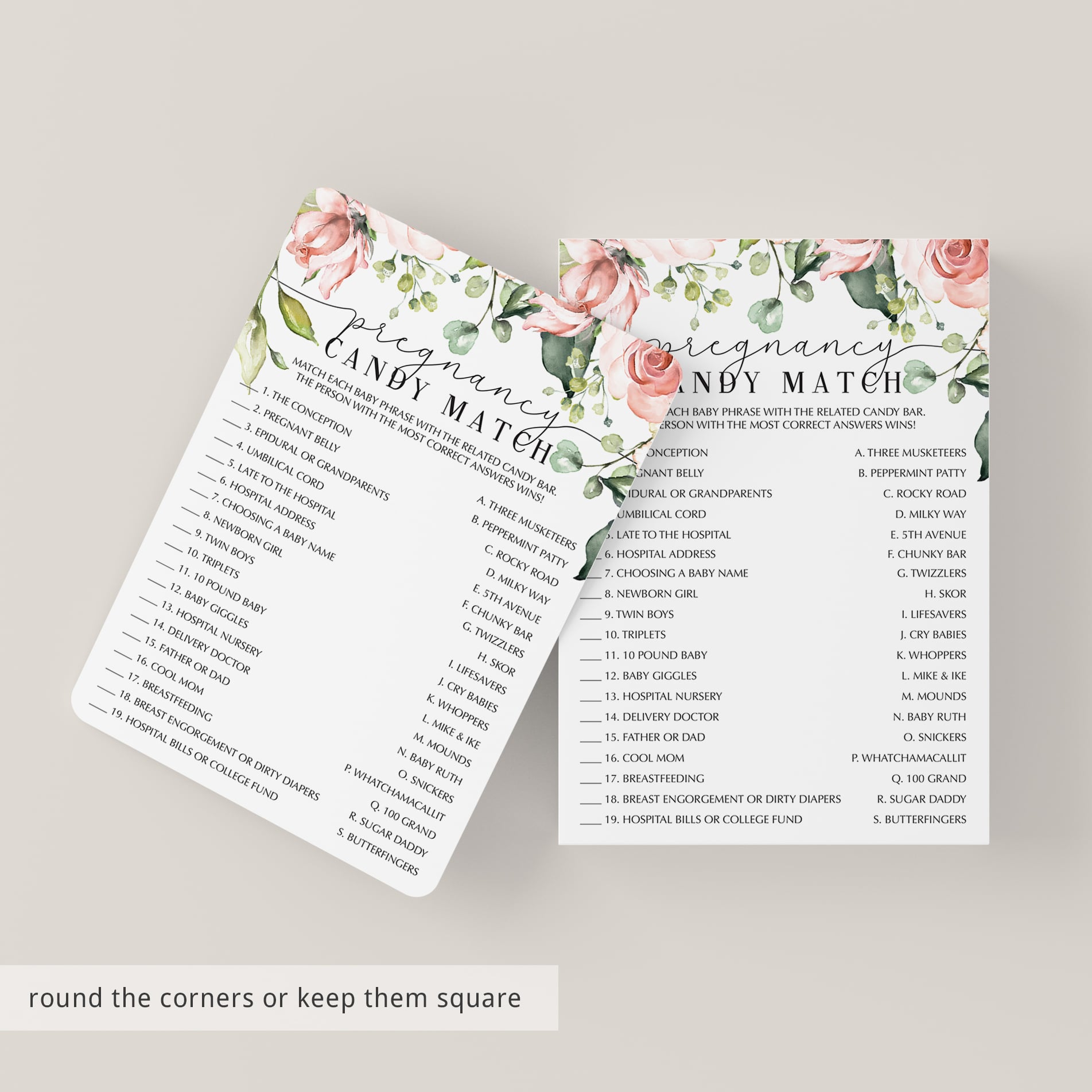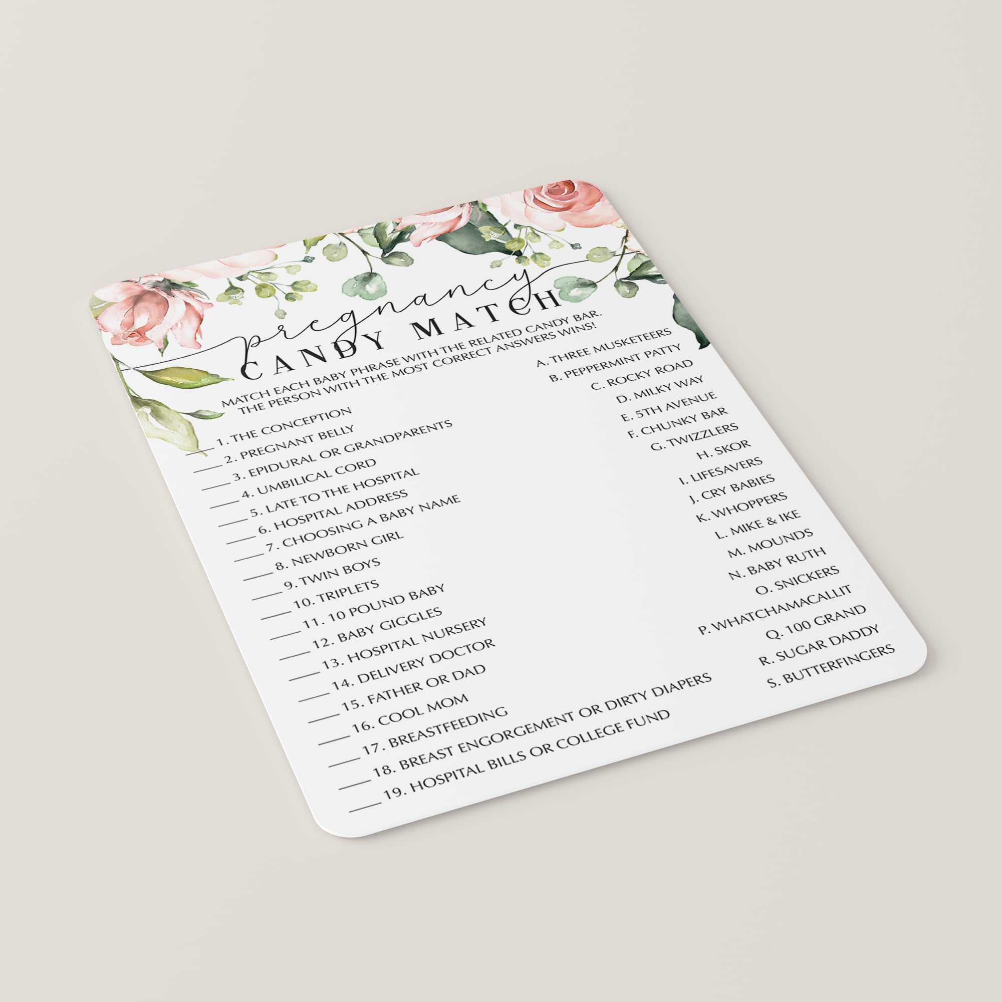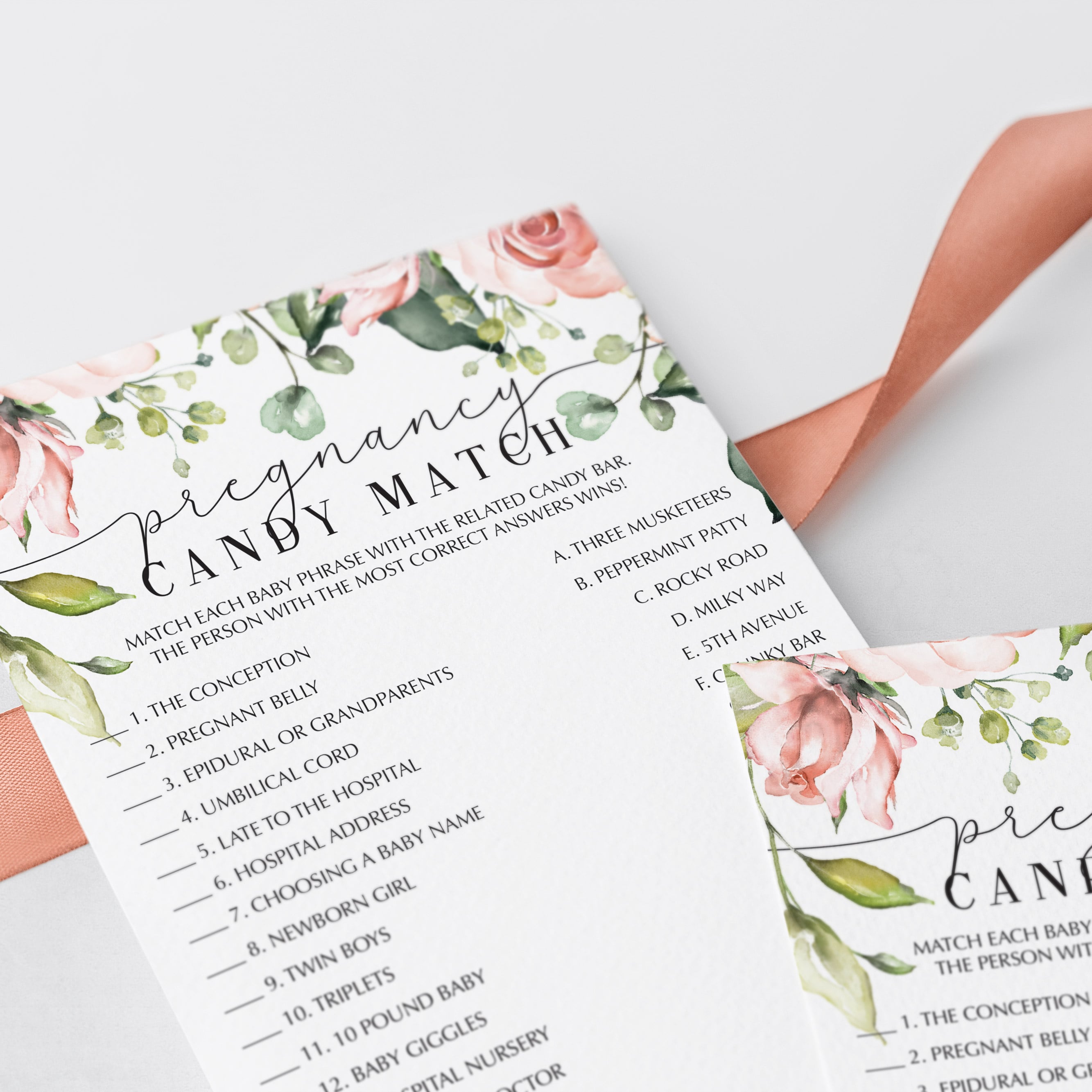 Treat everyone on a baby shower to remember with this blush floral baby shower Pregnancy Candy Match Game!