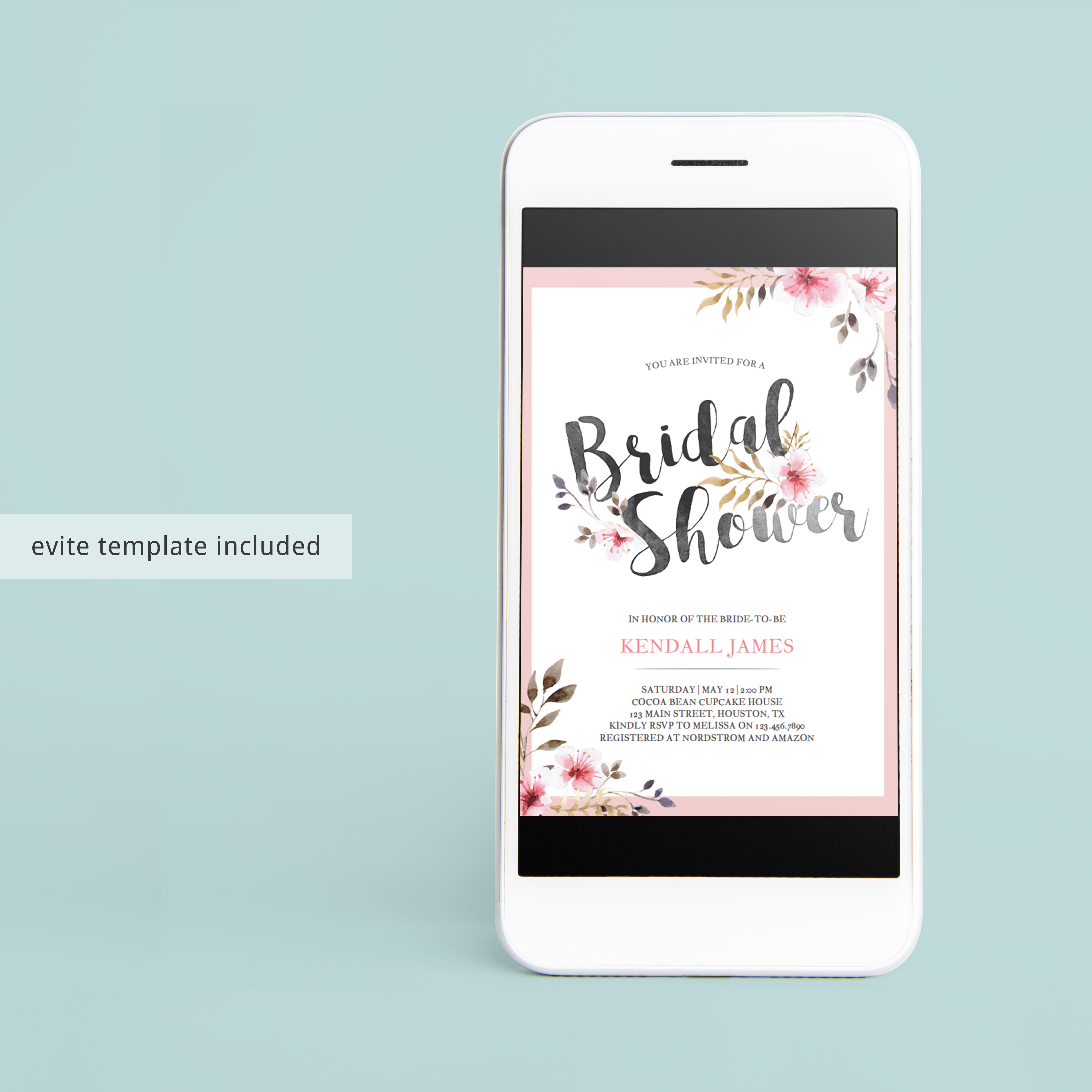 This spring bridal shower invitation template is editable in Adobe Acrobat Reader (free download). After downloading the file, fill in your details and print in just minutes.