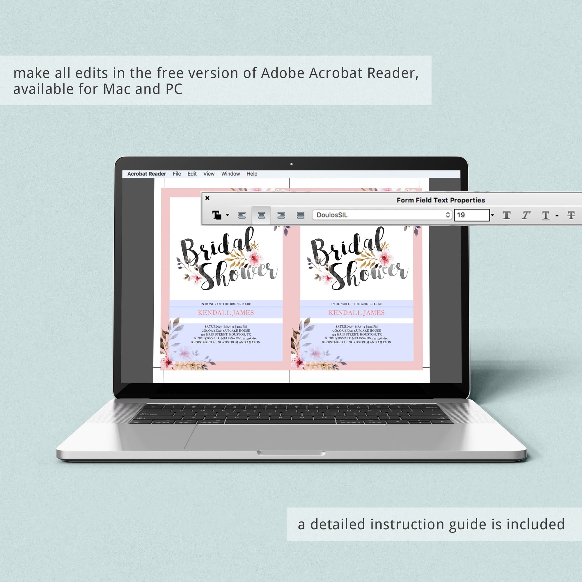 • 1 Editable PDF sized 5” x 7” to print or to use as evite