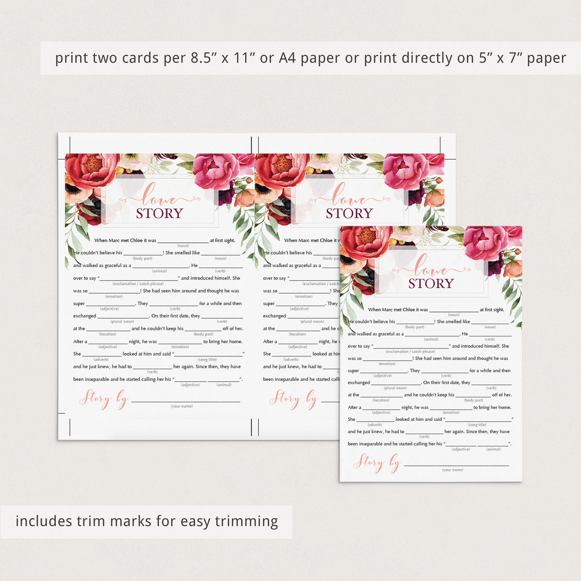 Write down a romantic or a funny love story for the bride and groom with these gorgeous burgundy wedding mad libs game cards. They will certainly entertain your bridal shower guests and they will become an amazing keepsake for the soon-to-be-weds. The floral game cards would be perfect for a bohemian wedding shower.