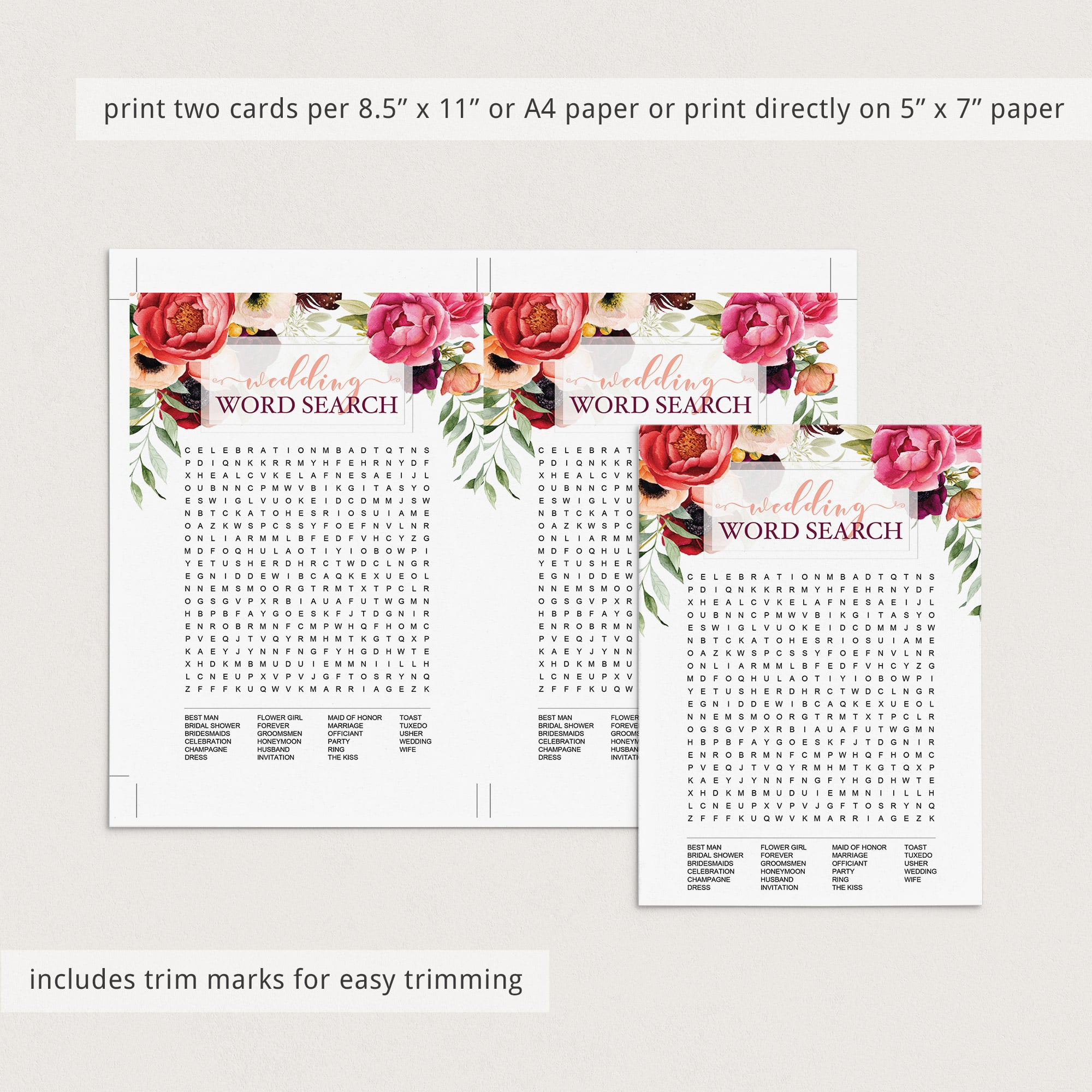 Looking for a unique wedding shower game? Play this hot pink wedding word search game. With its red and pink floral design, it's the perfect addition to a floral or bohemian bridal shower.