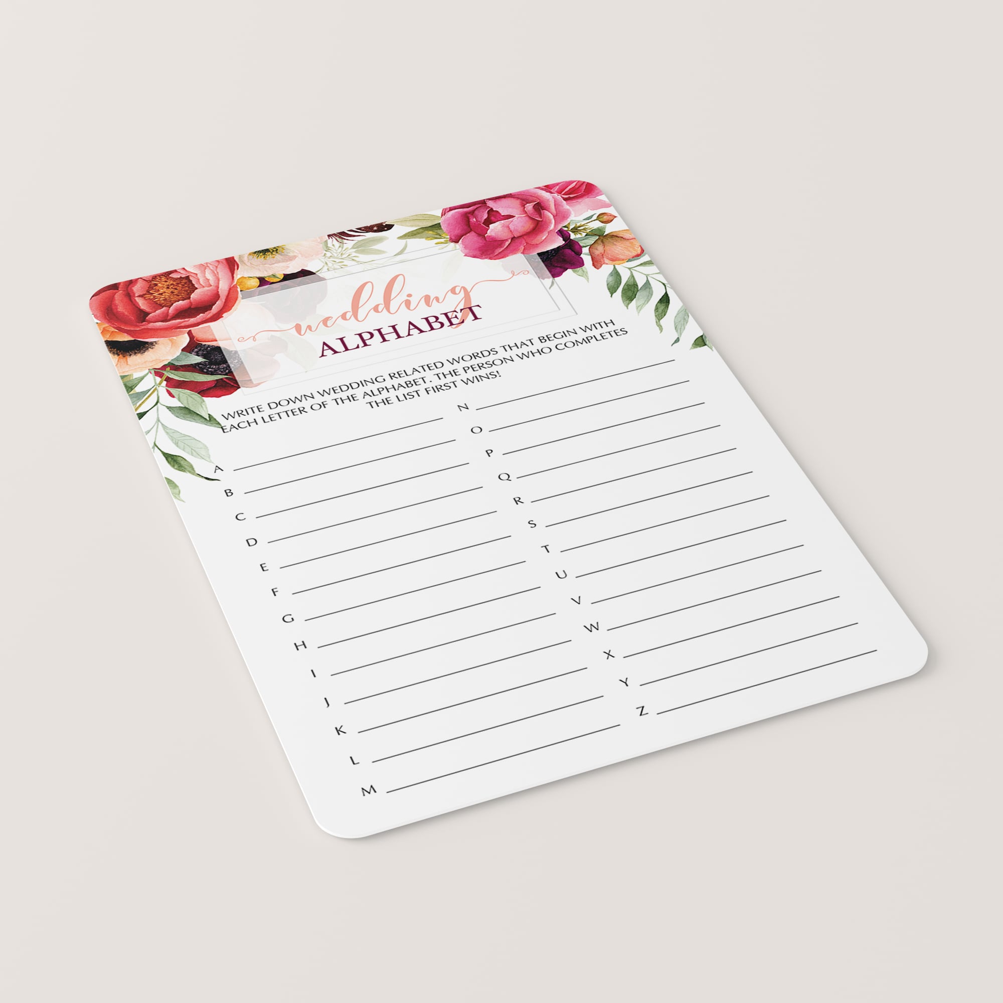 How many wedding related words do you know? Play Wedding Alphabet with these bohemian themed game cards with watercolor red roses.