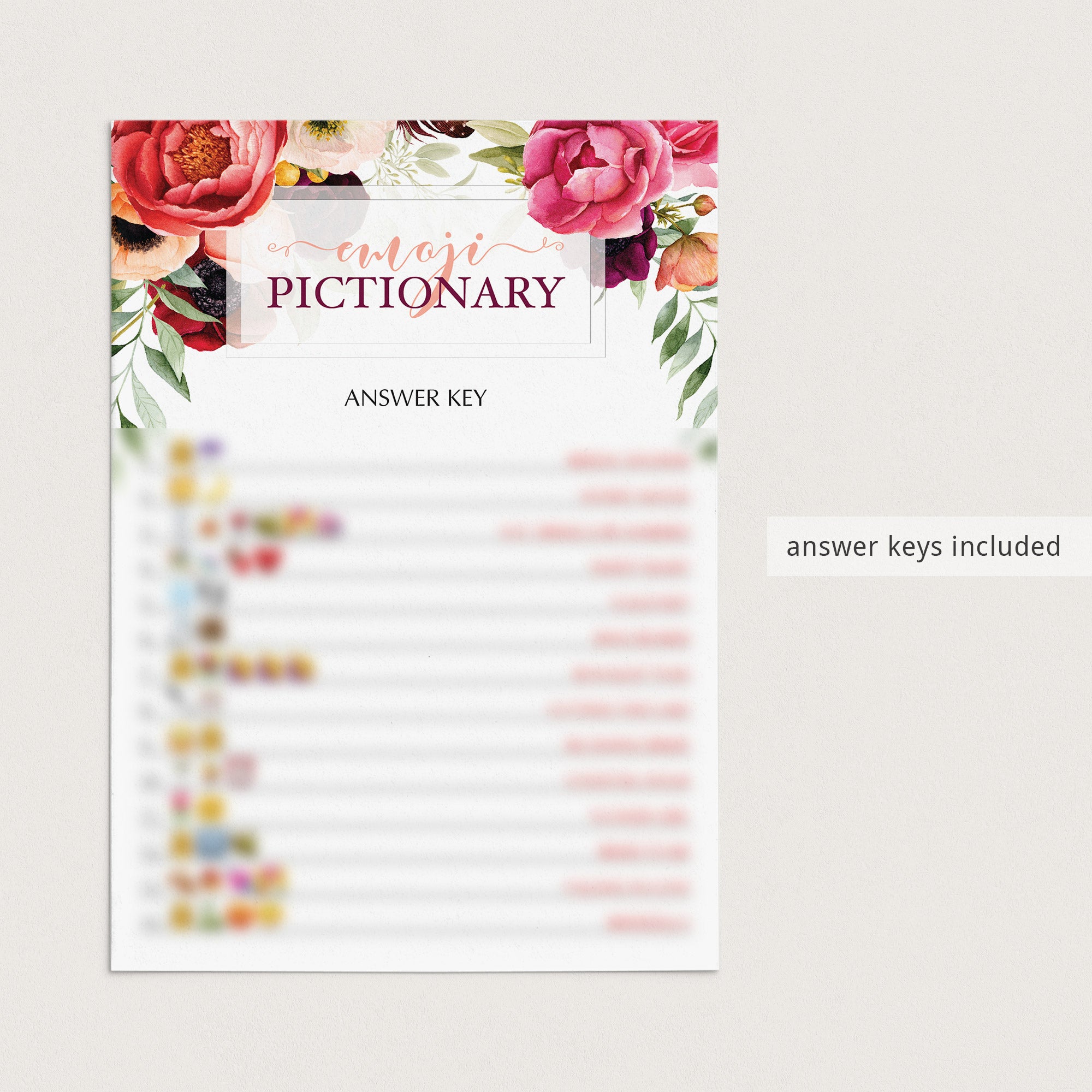 For the Emoji Pictionary and Word Scramble answer keys, each: