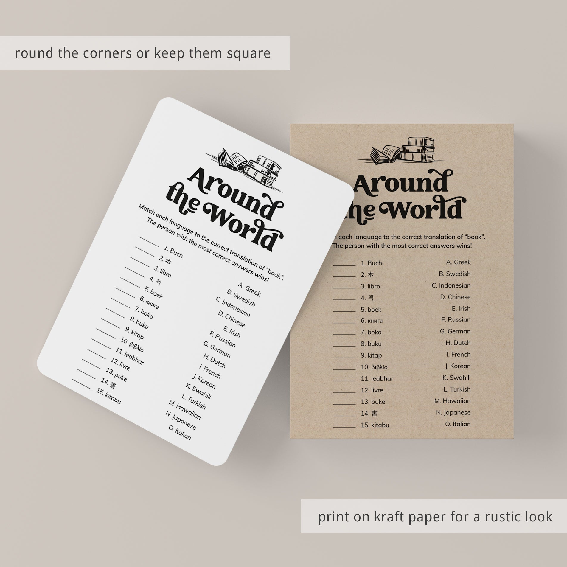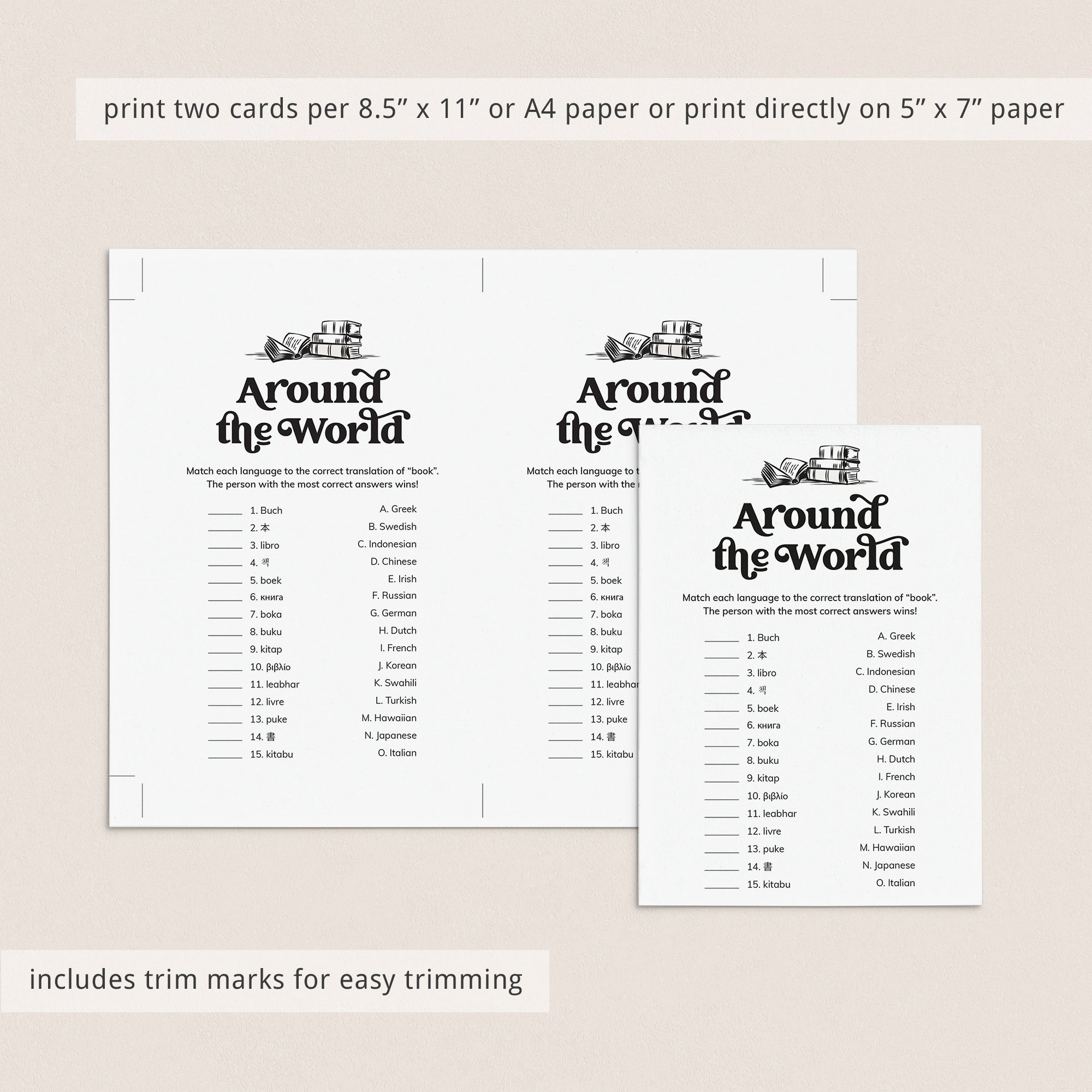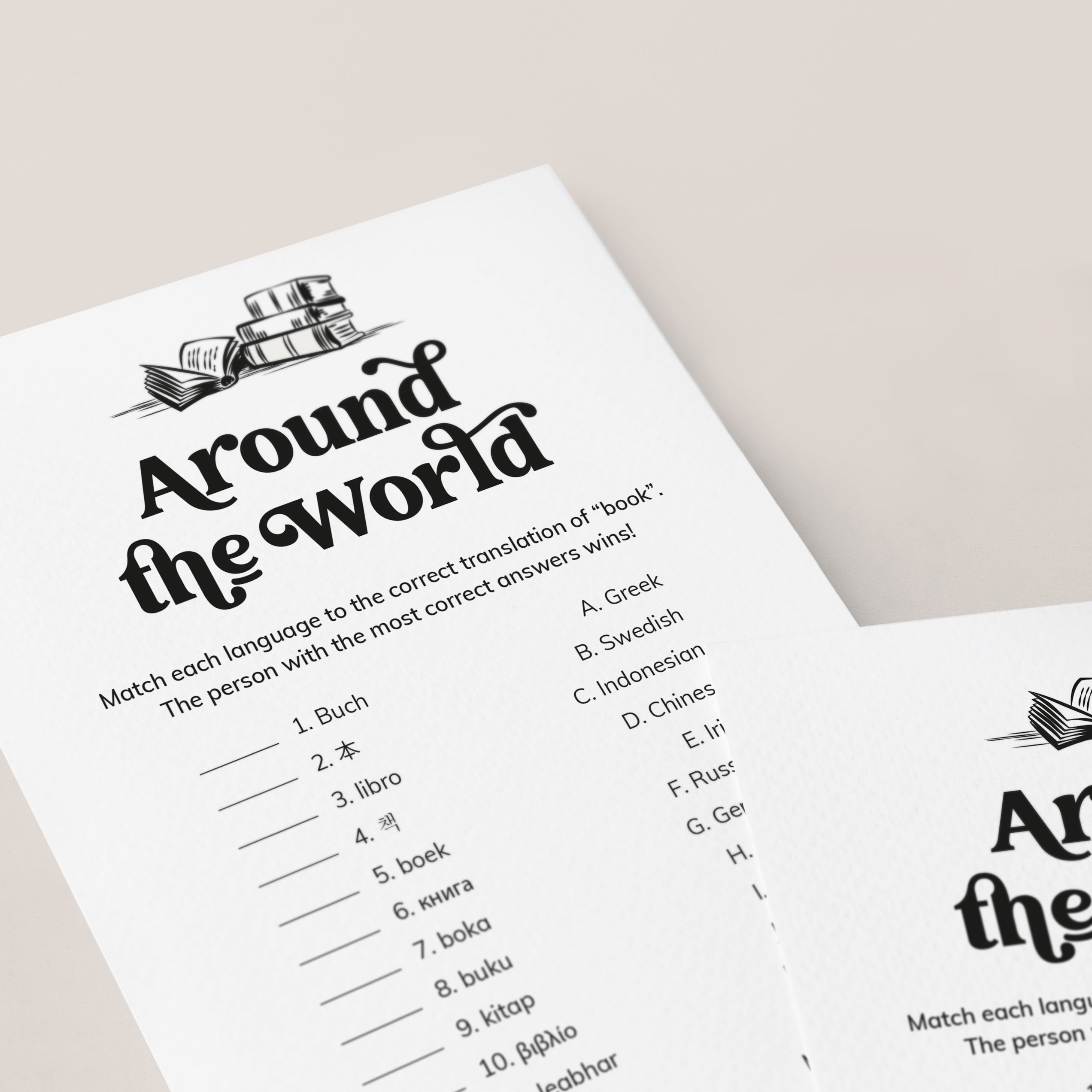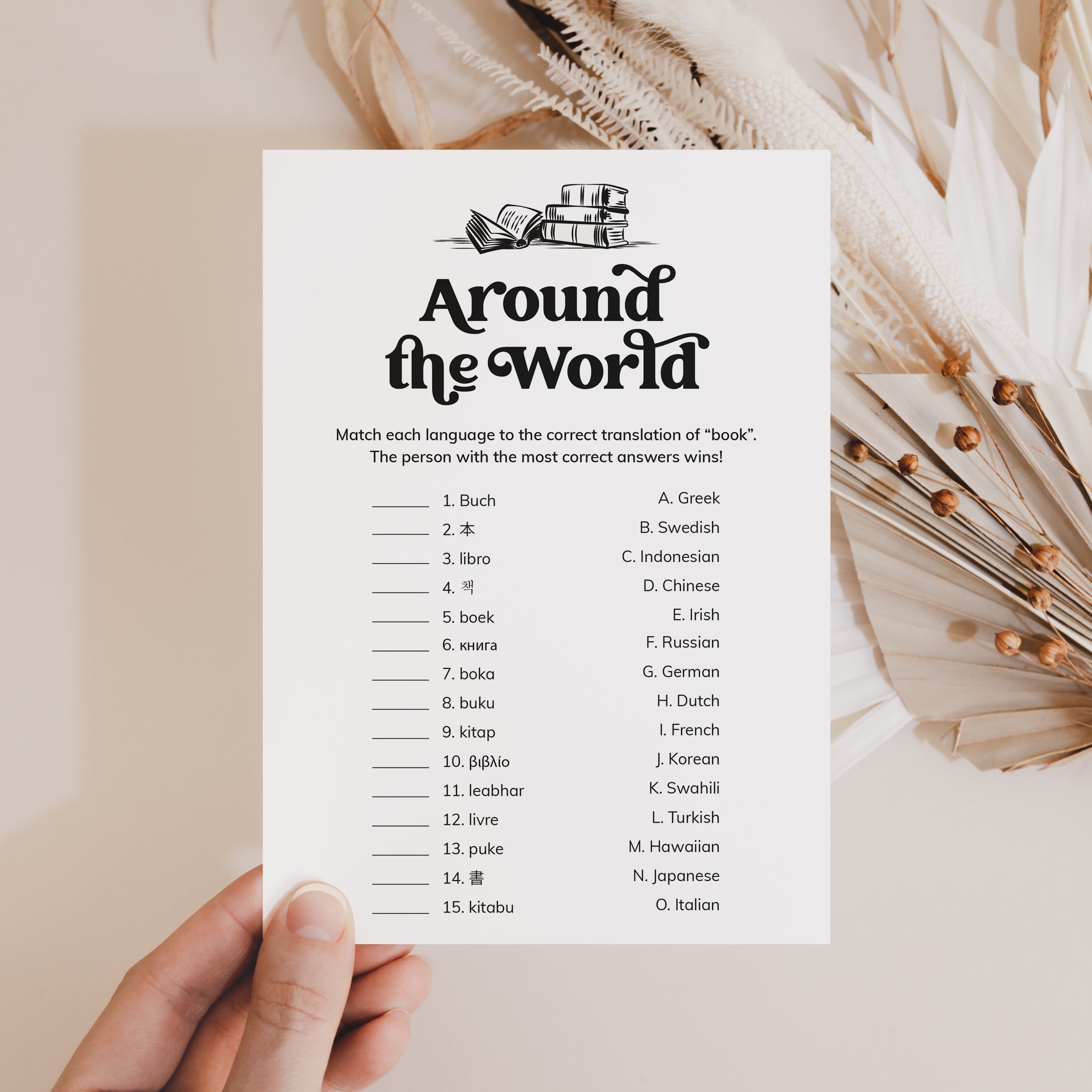 Here’s how it works: print and hand out these black and white game cards with a pen or pencil to each guest. Everyone must try to match each version of the word “Book” with its language of origin. The player with the most correct answers wins.