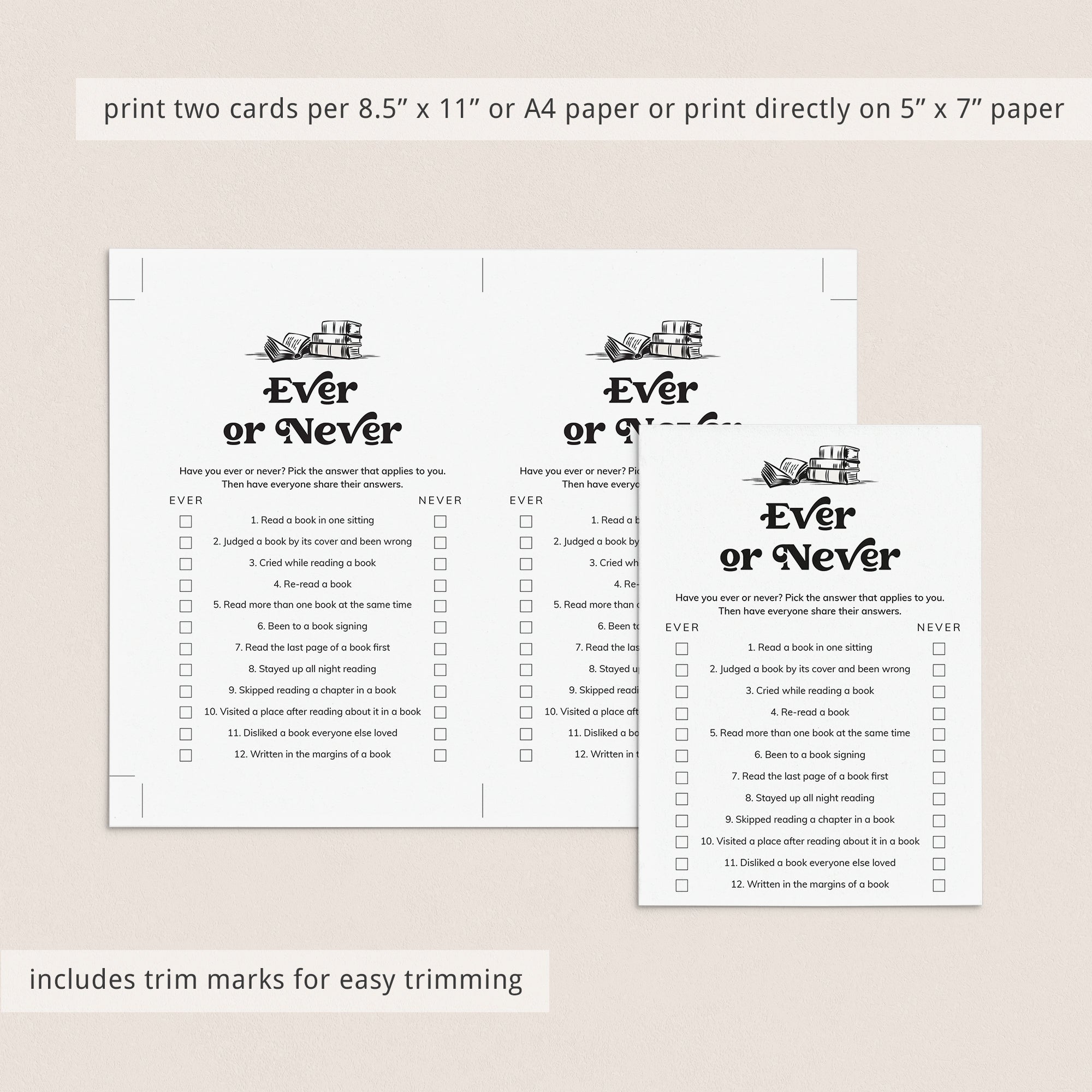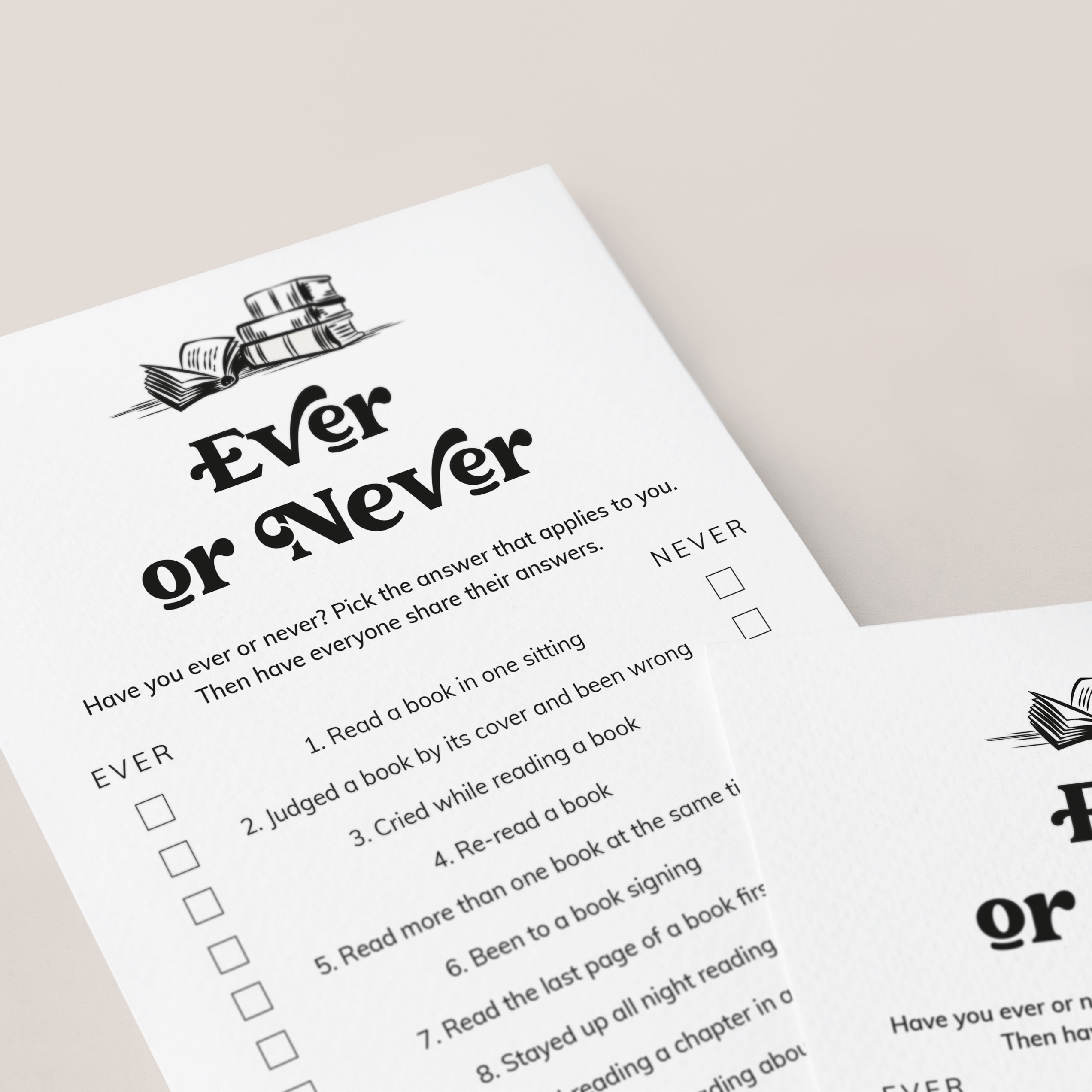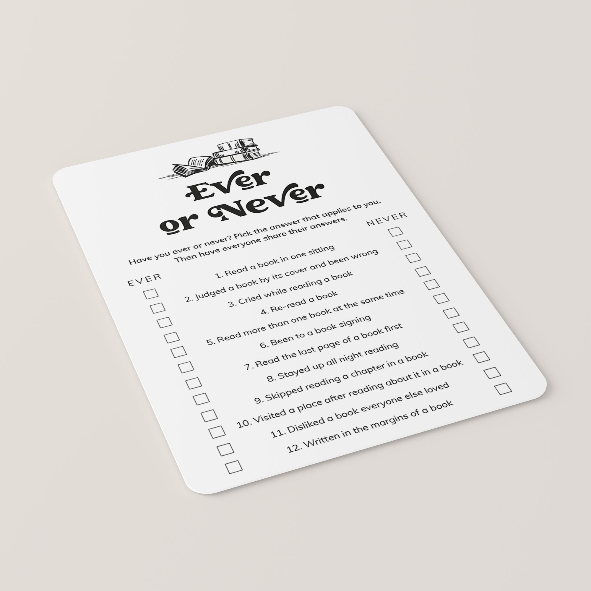 Here’s how it works: each guest fills out the Ever or Never game card by checking off the experiences they’ve had. Then, share your answers with the group and see what you discover! Have you ever read a book in one sitting, been to a book signing or read the last page of a book first? The results are always entertaining and often unexpected.