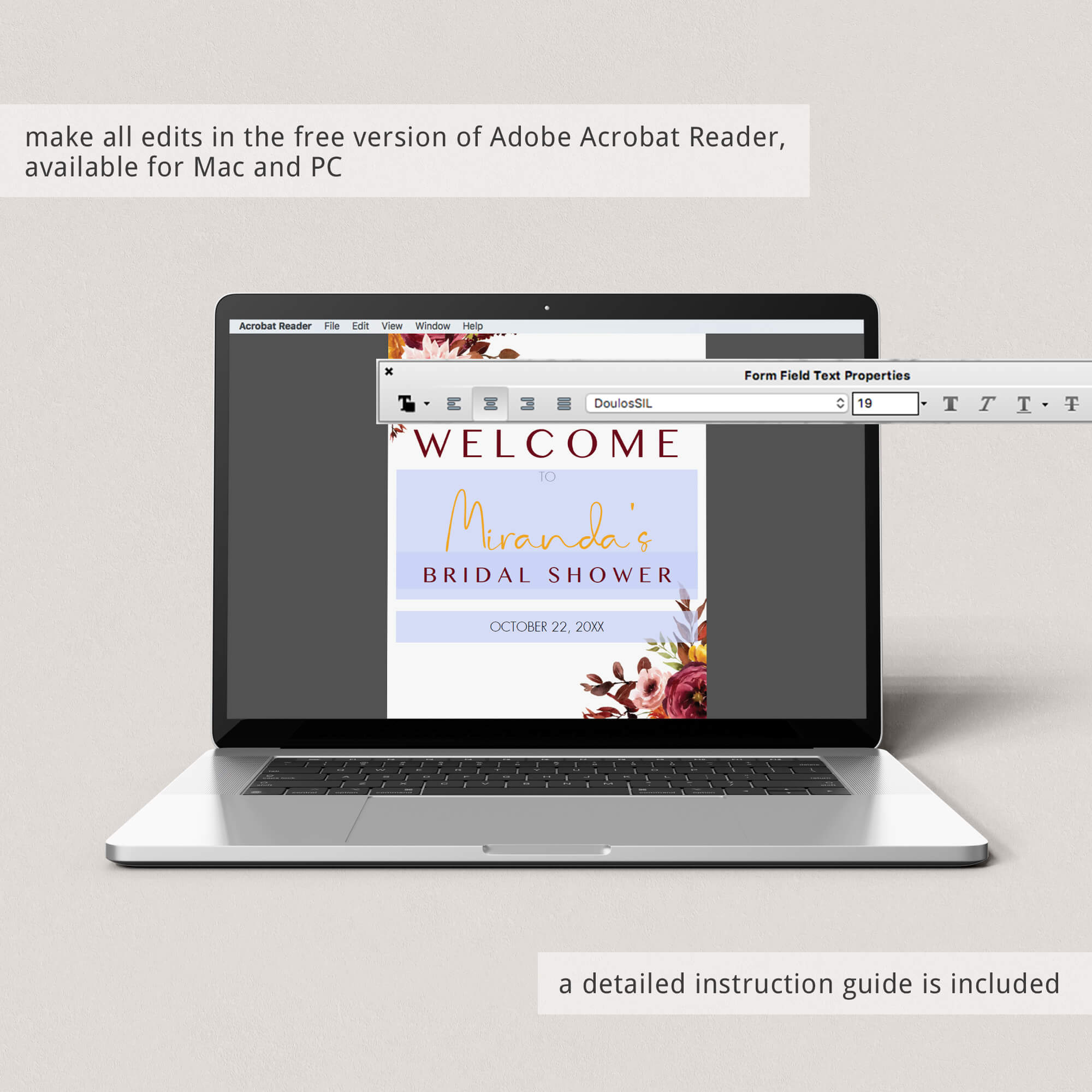 The welcome sign is editable in the free version of Adobe Acrobat Reader, so that you can easily personalize it with the name of the bride-to-be. To make the process as smooth as possible, we've included a detailed instruction guide.