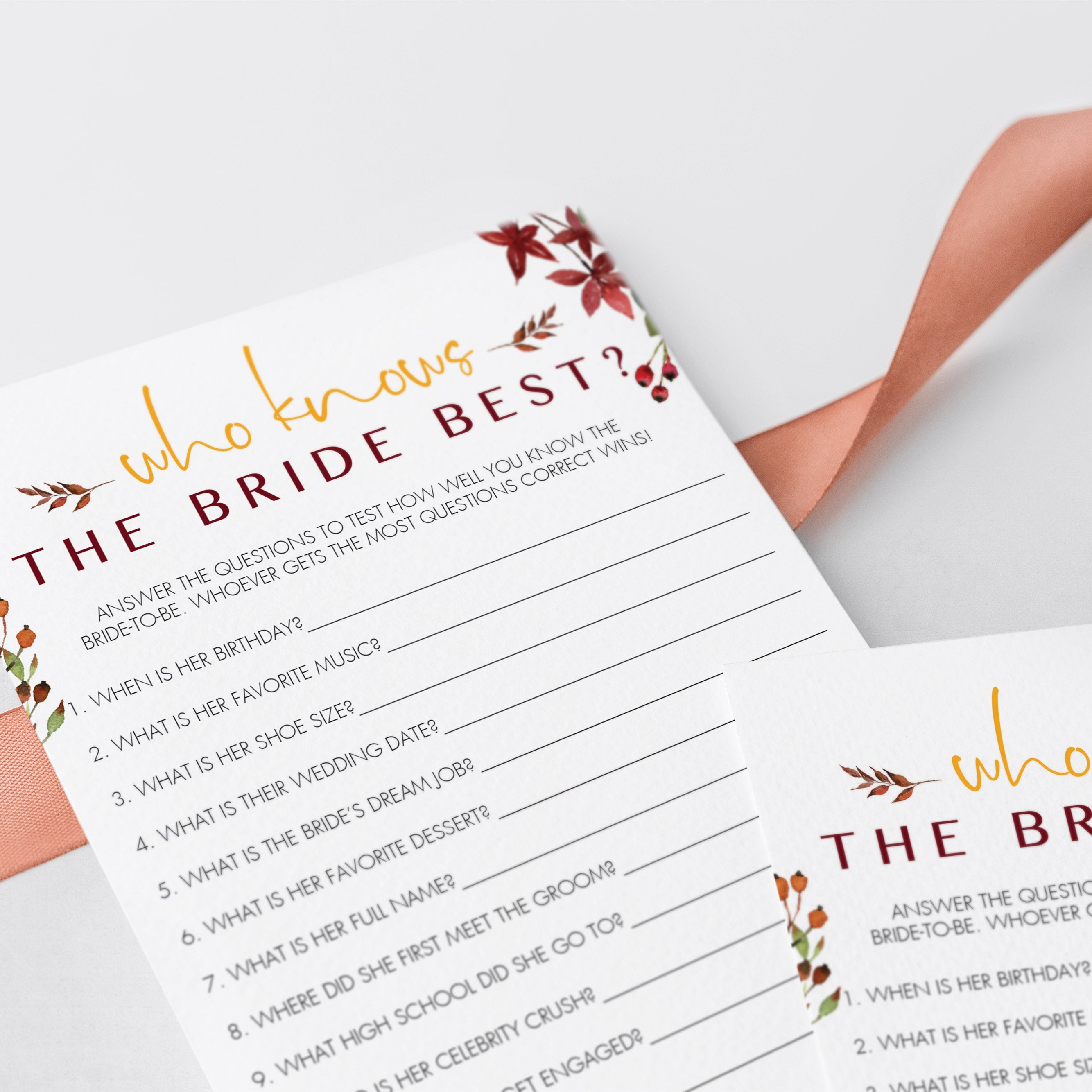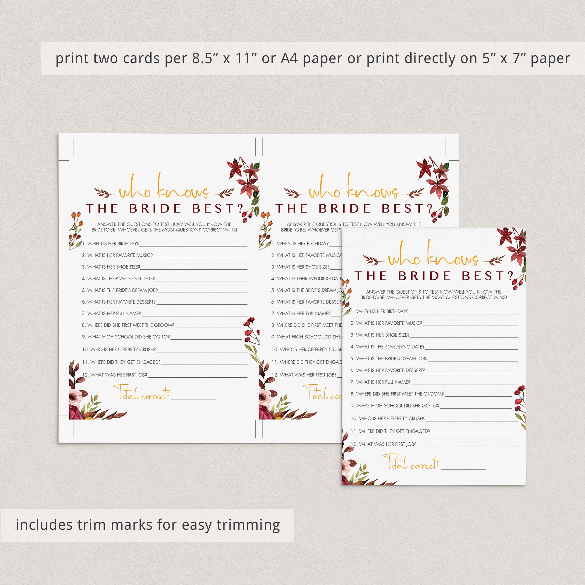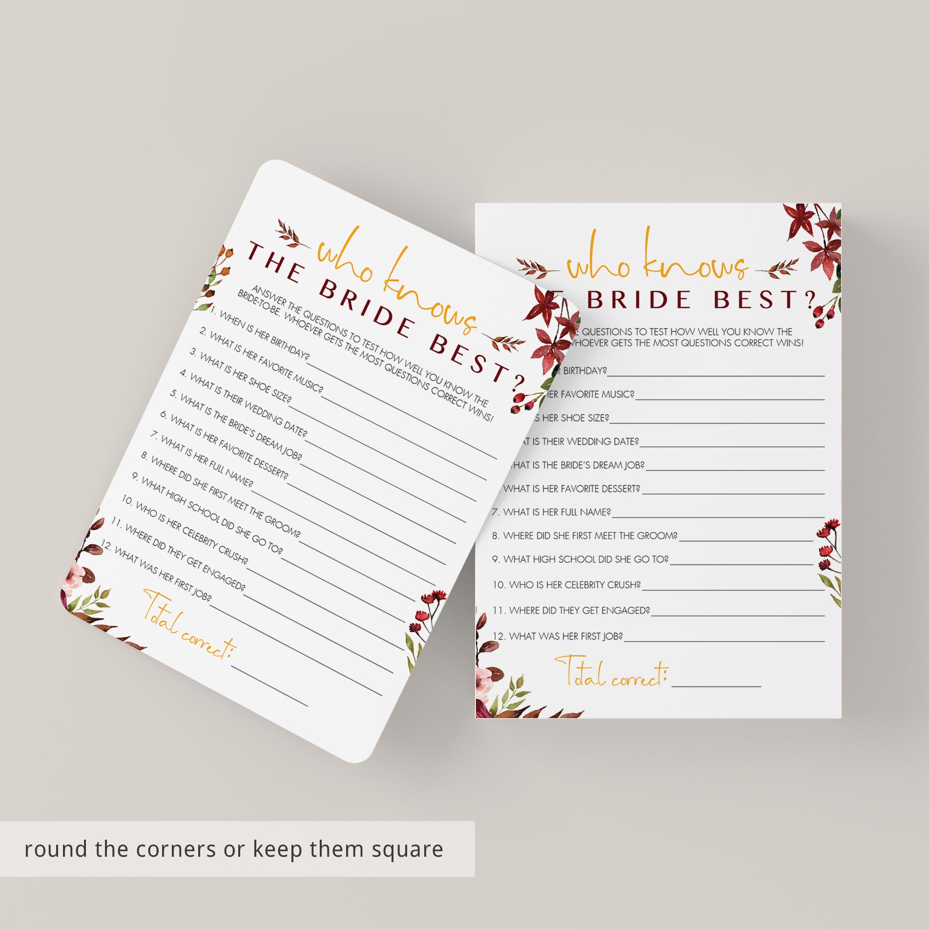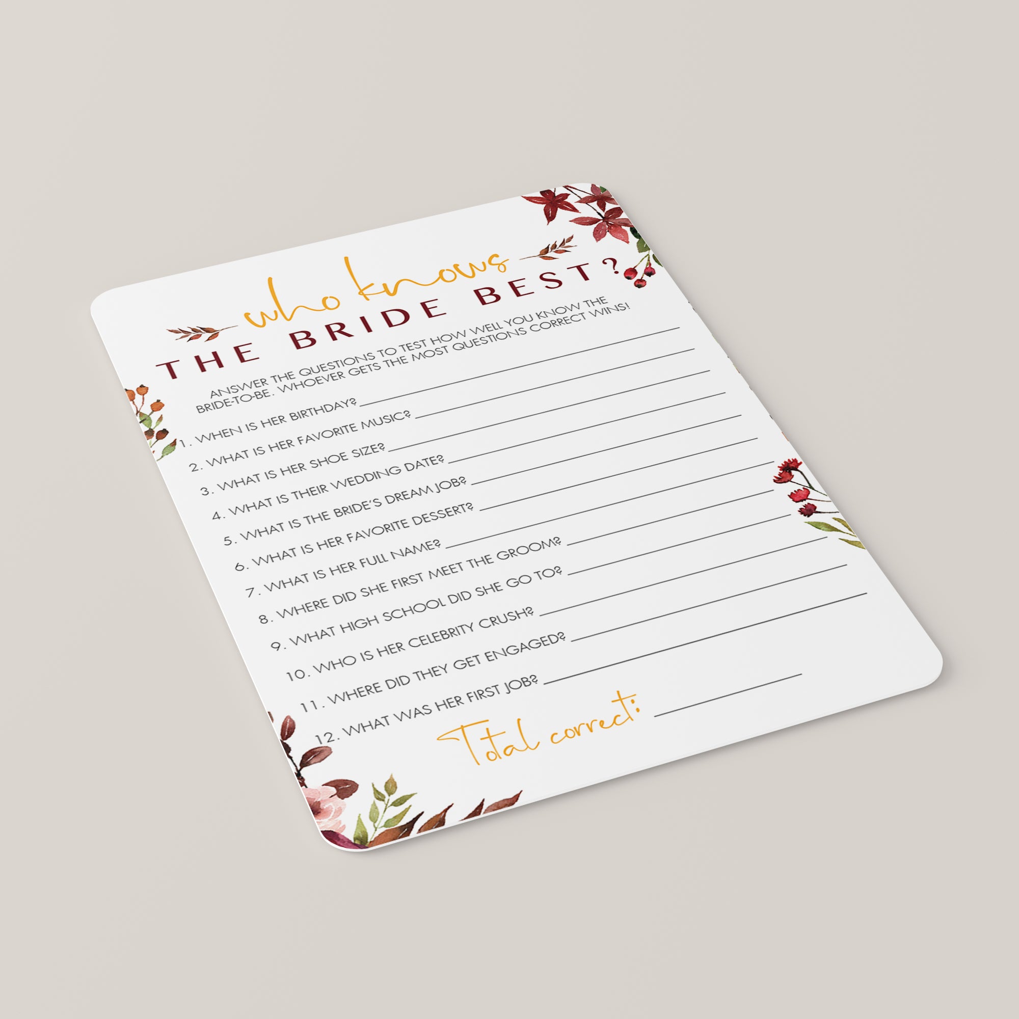 Test your wedding shower guests how good they know the bride and play ‘Who knows the bride best’ with these gorgeous burgundy floral game cards. A 'Who Knows The Bride Best' game is a great way to bring disparate people together and to put them all in a party mood. It's the perfect addition to your fall themed wedding shower.