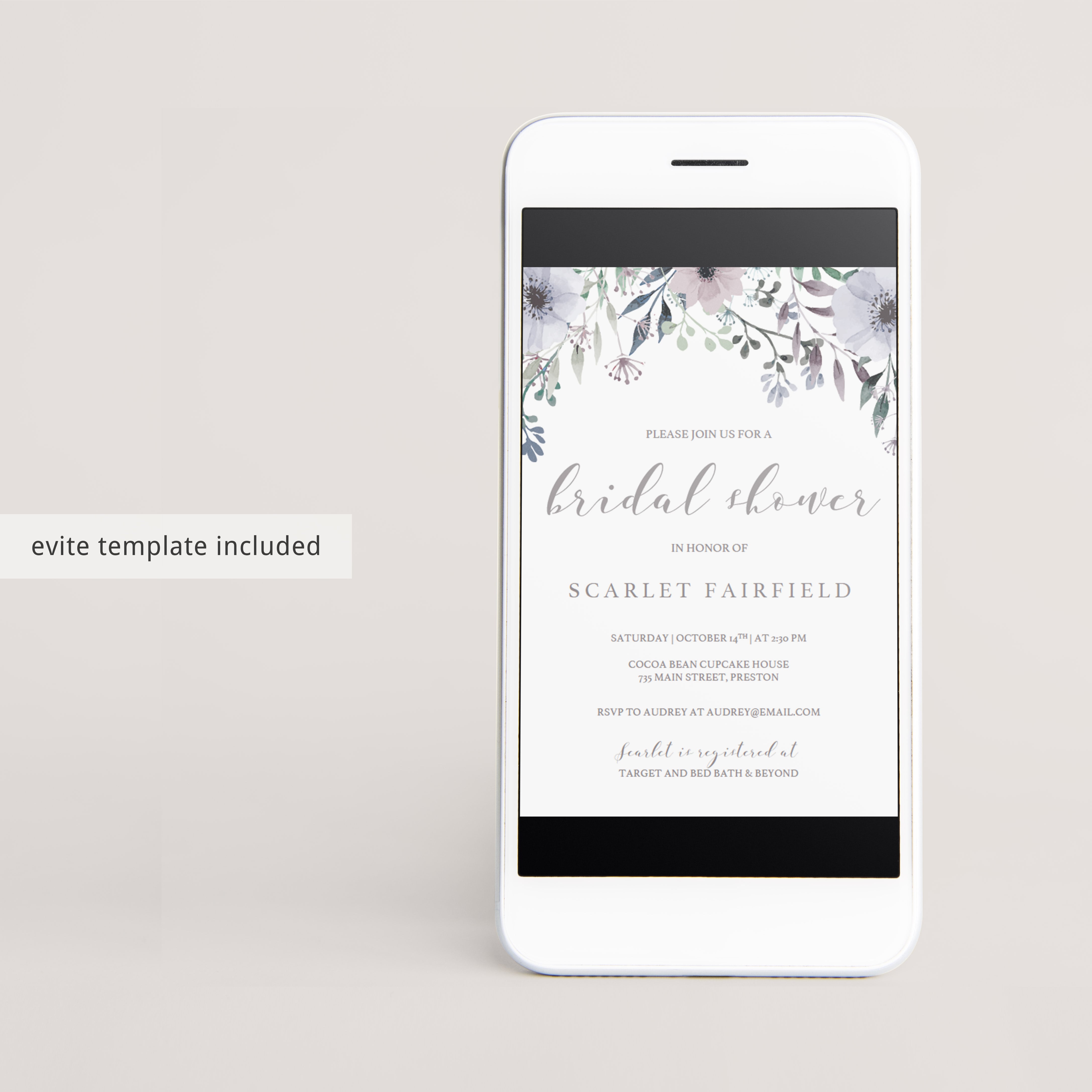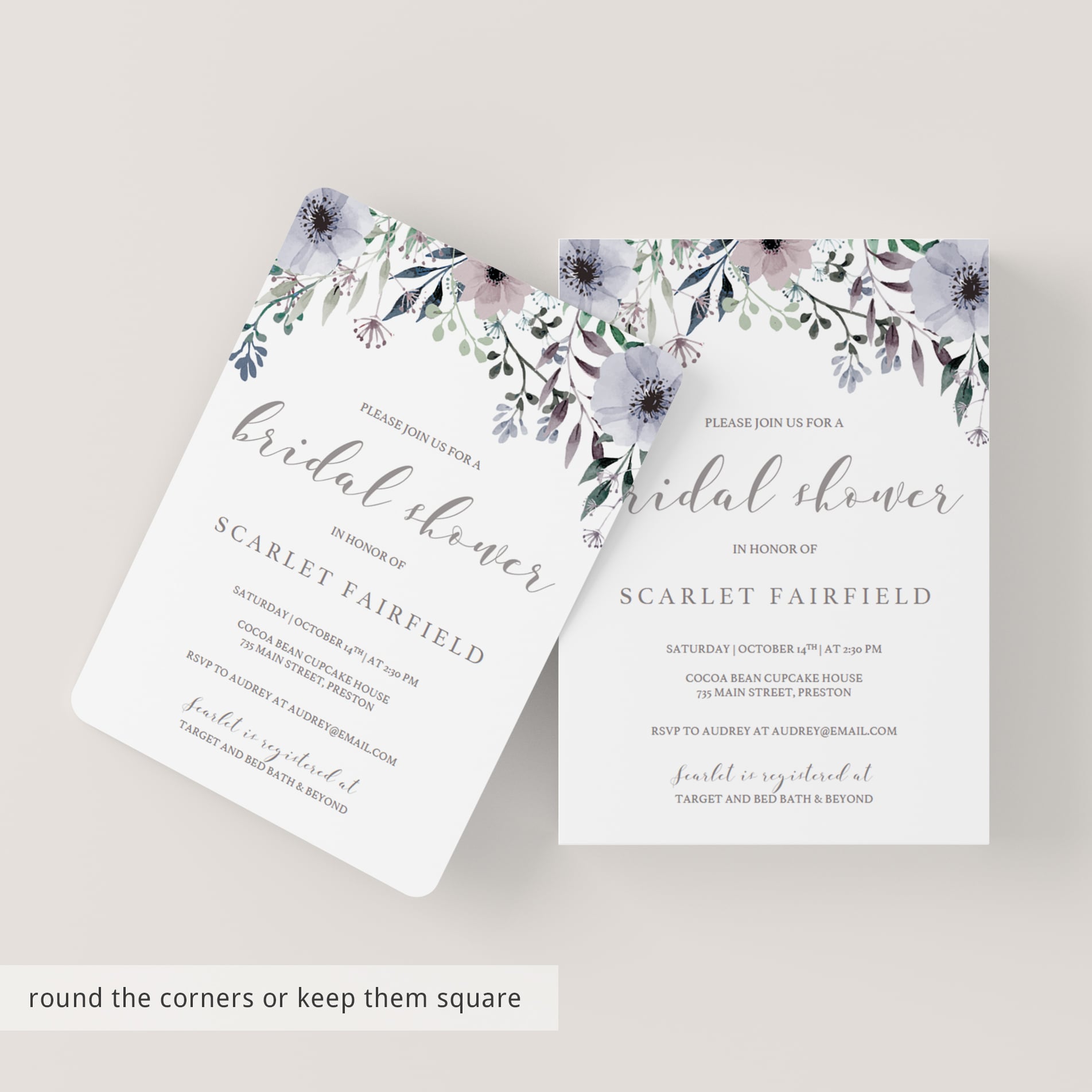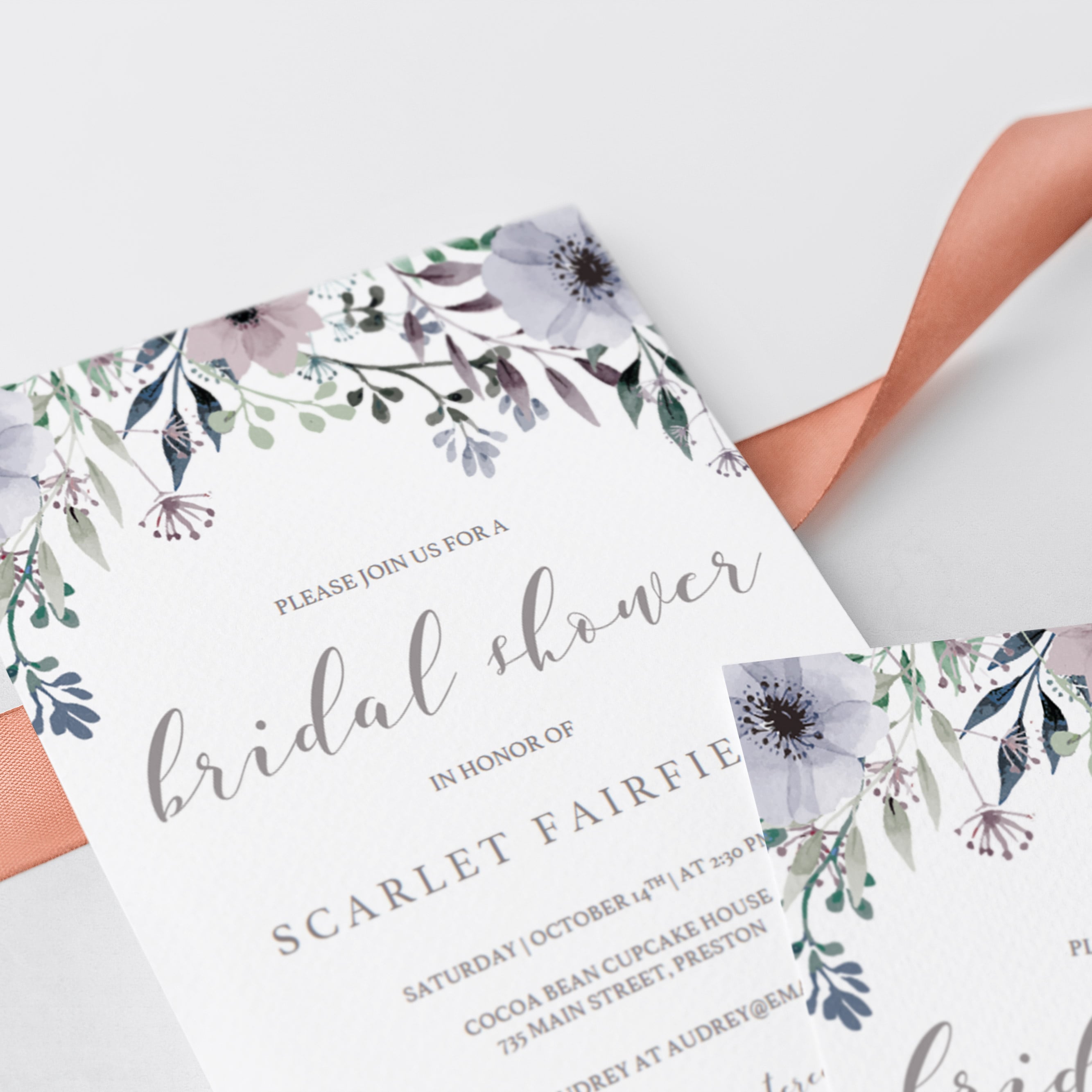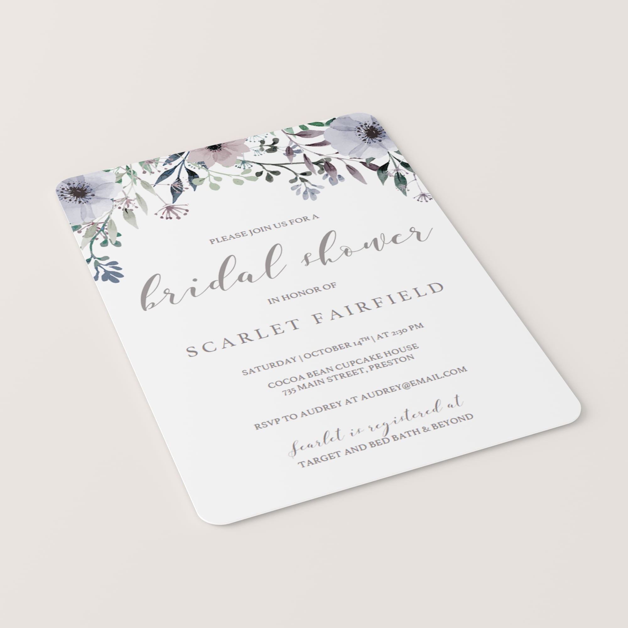 Make sure the bride-to-be gets a shower she deserves with this gorgeous bridal shower invitation with purple flowers. The flowers give the invitation a bohemian touch and will make all the girls excited for the bridal shower!