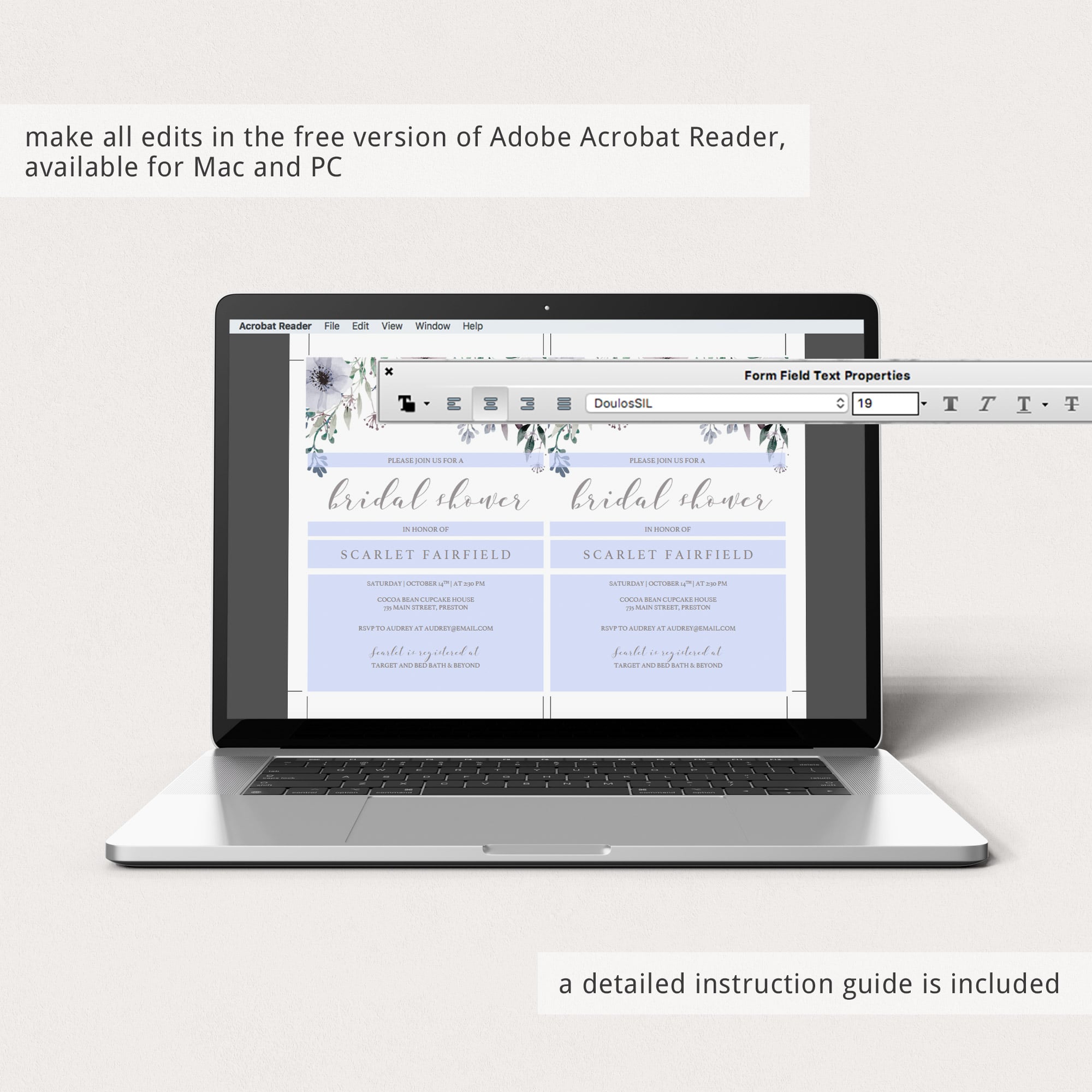 • 1 Editable PDF sized 5” x 7” to print or to use as evite