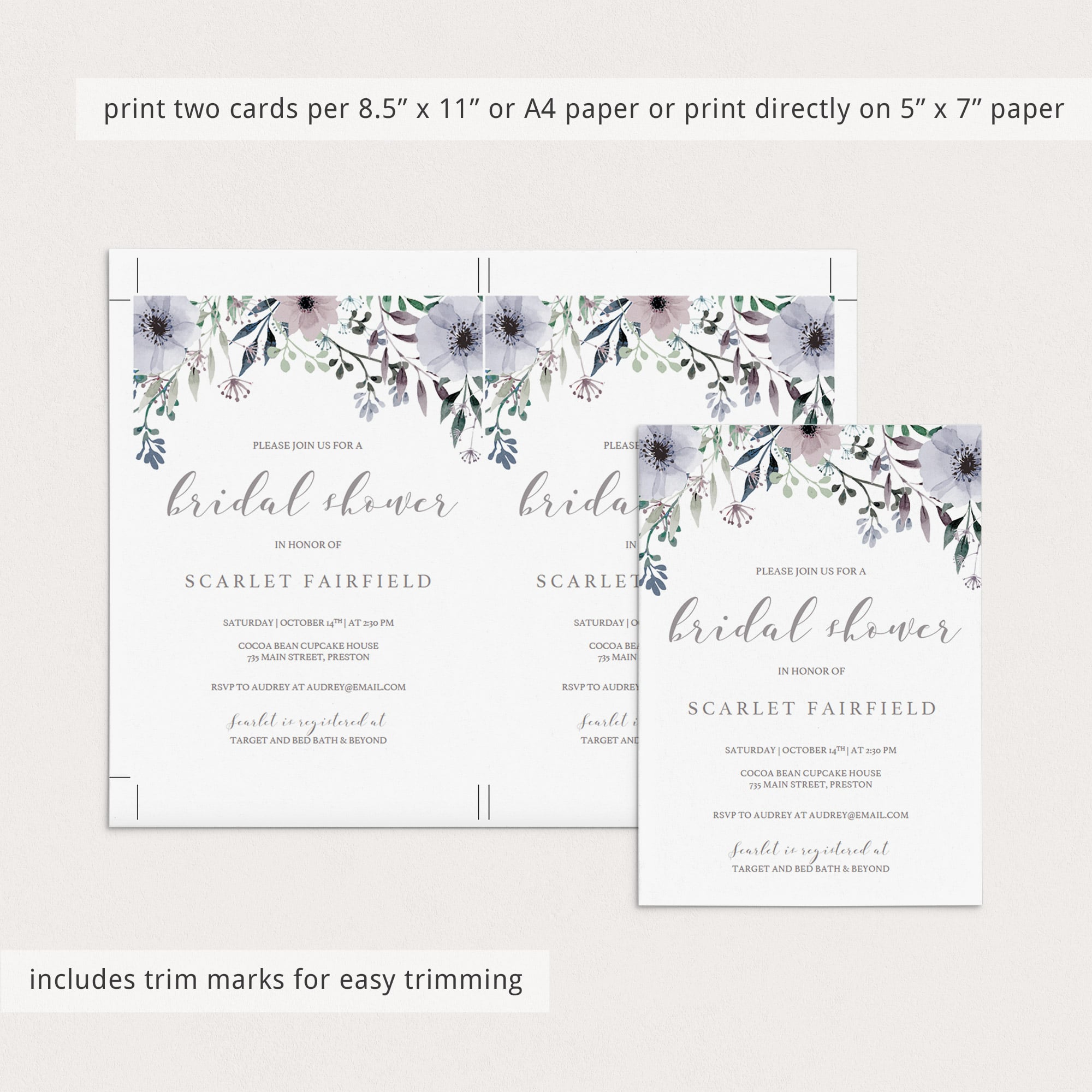 This DIY bridal shower invitation template is editable in Adobe Acrobat Reader (free version). After downloading the file, fill in your details and print in just minutes.