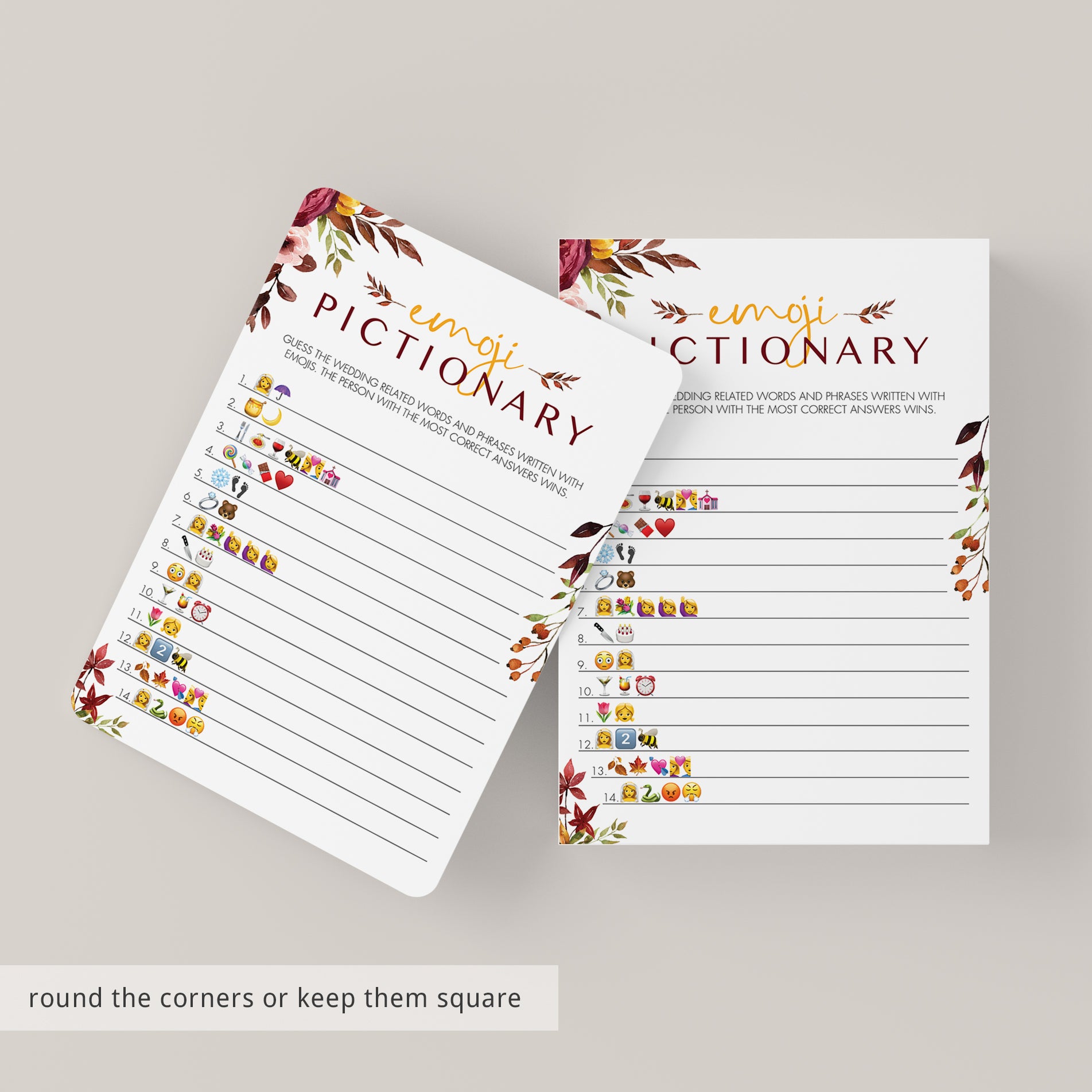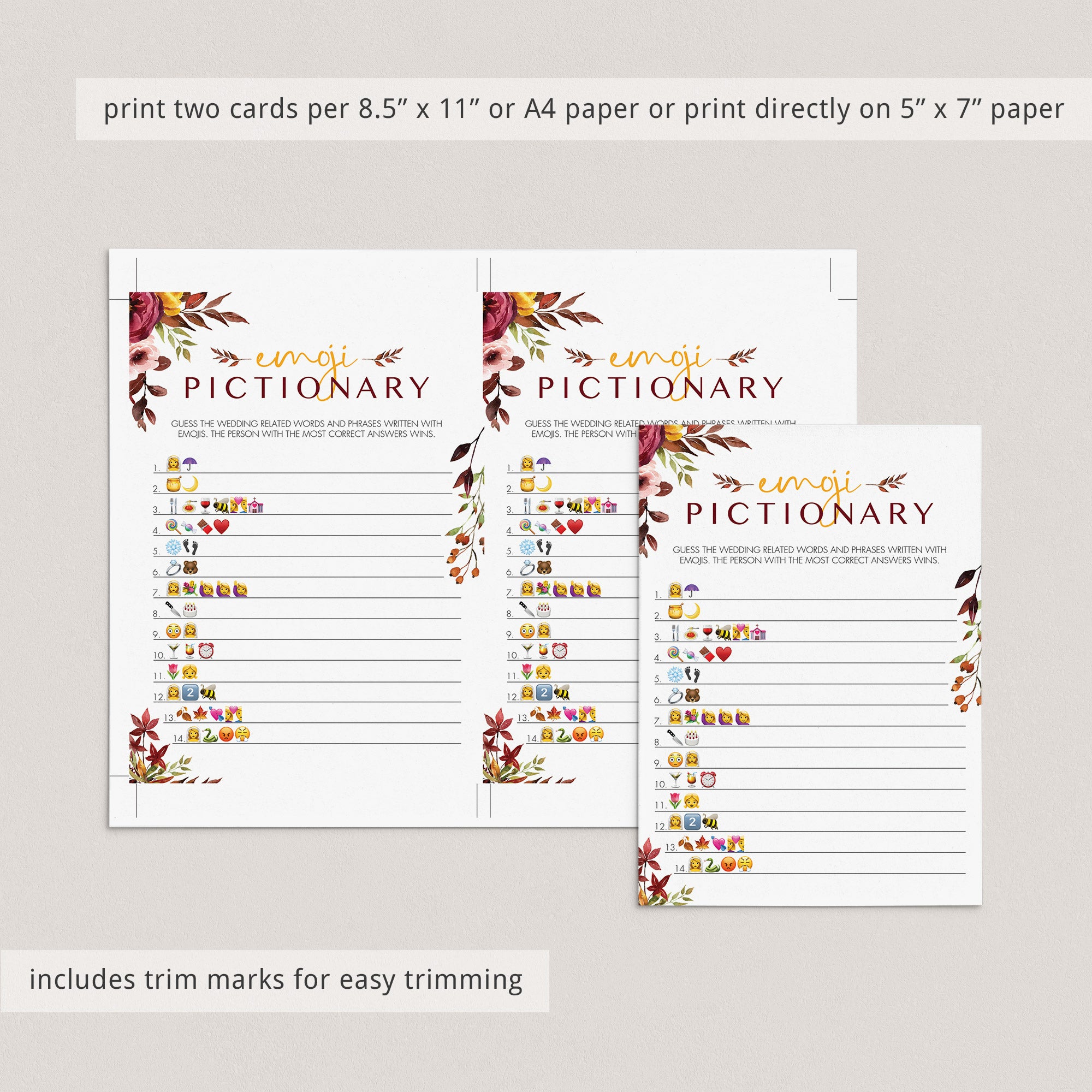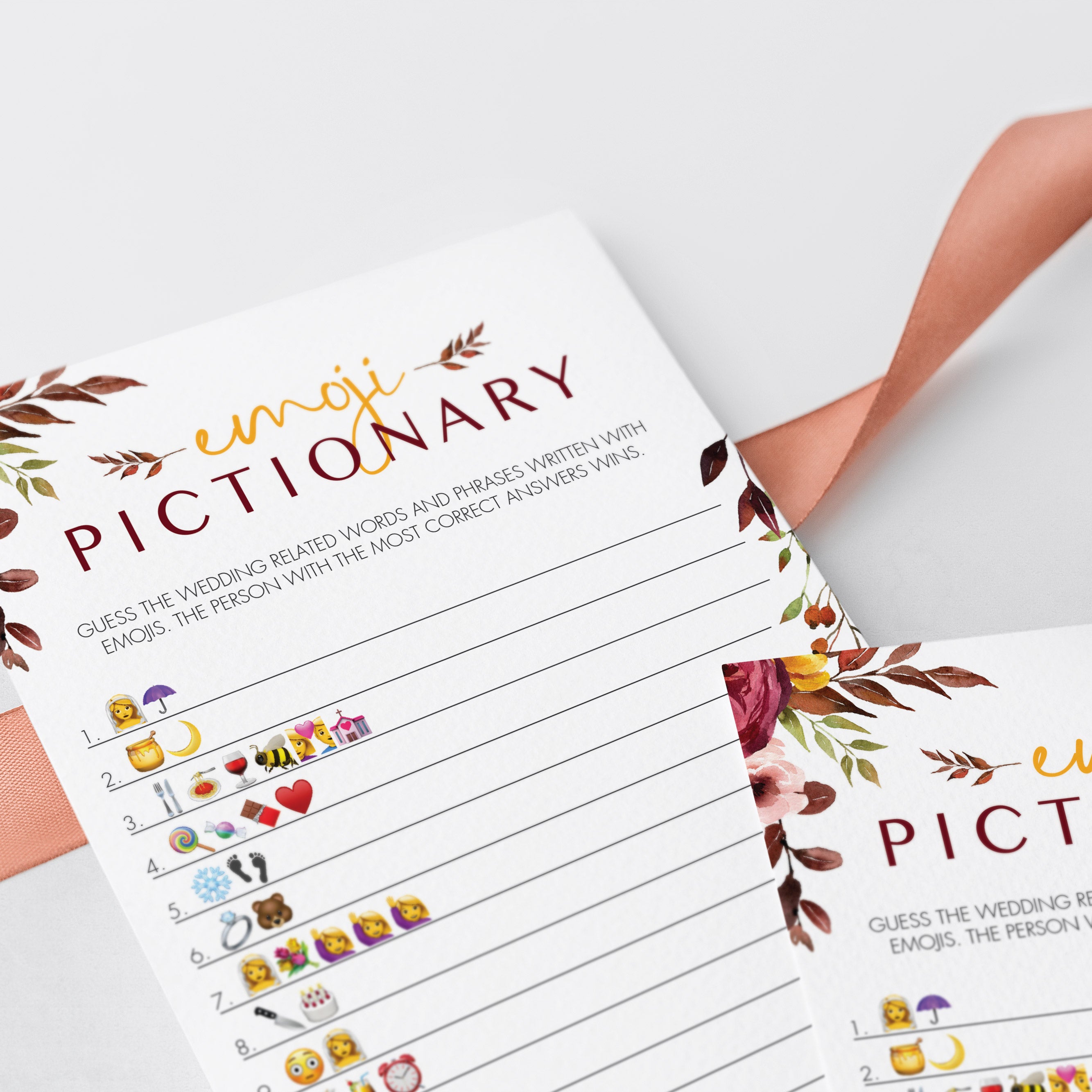 Are you looking for a fun game to play at your fall theme bridal shower? Play Emoji Pictionary with these gorgeous burgundy floral Emojis game cards. It's the perfect addition to your fall bridal shower and it's sure to be a hit at your party!