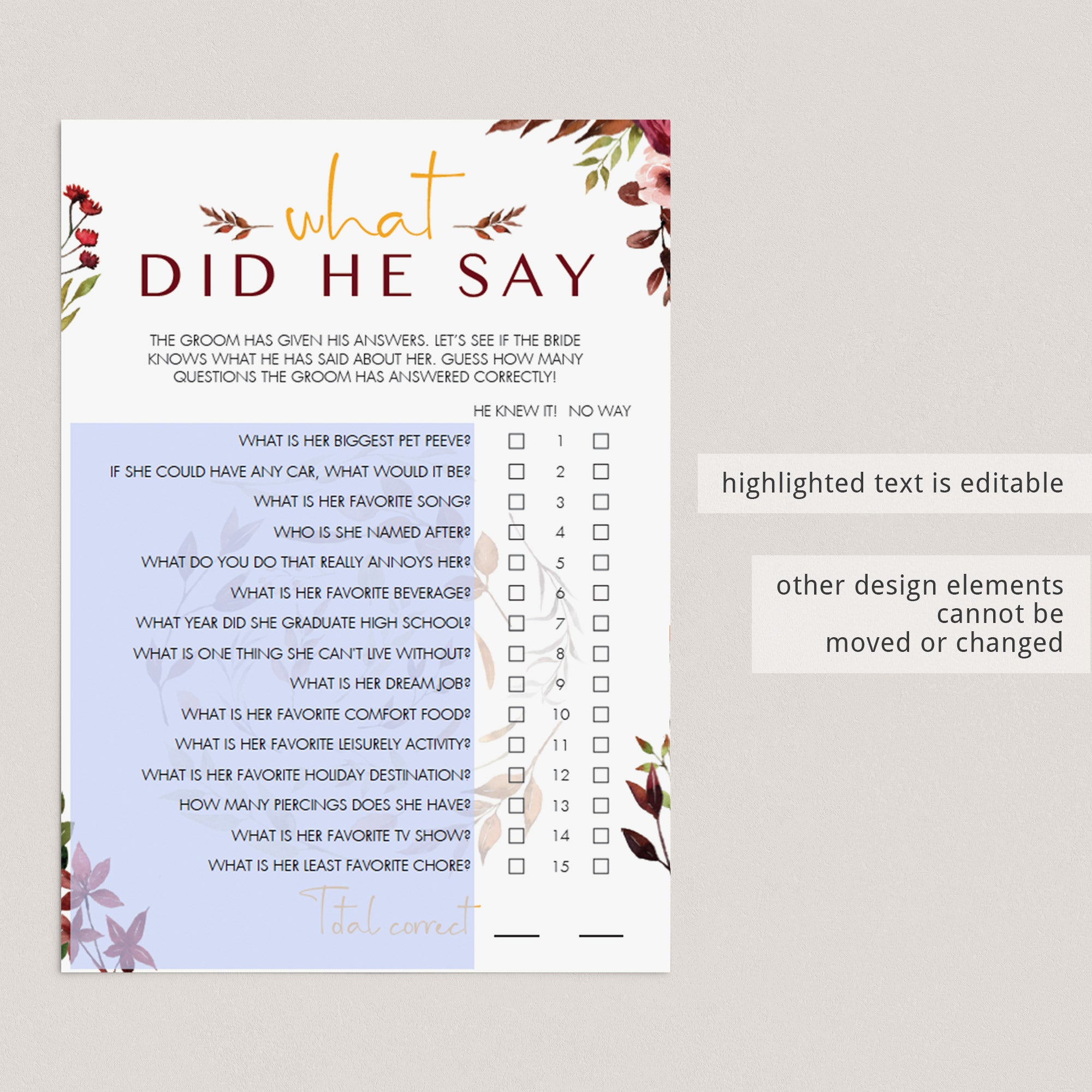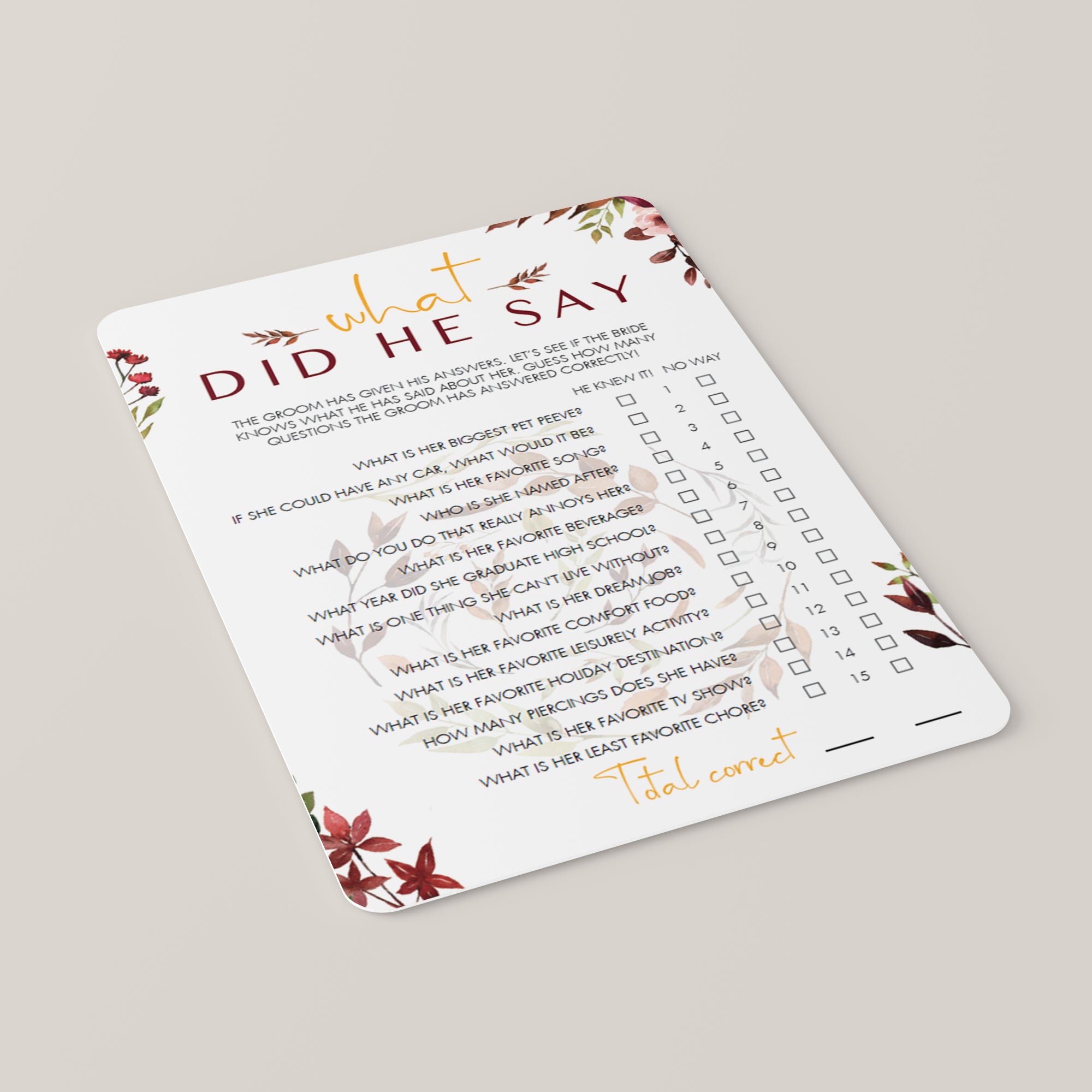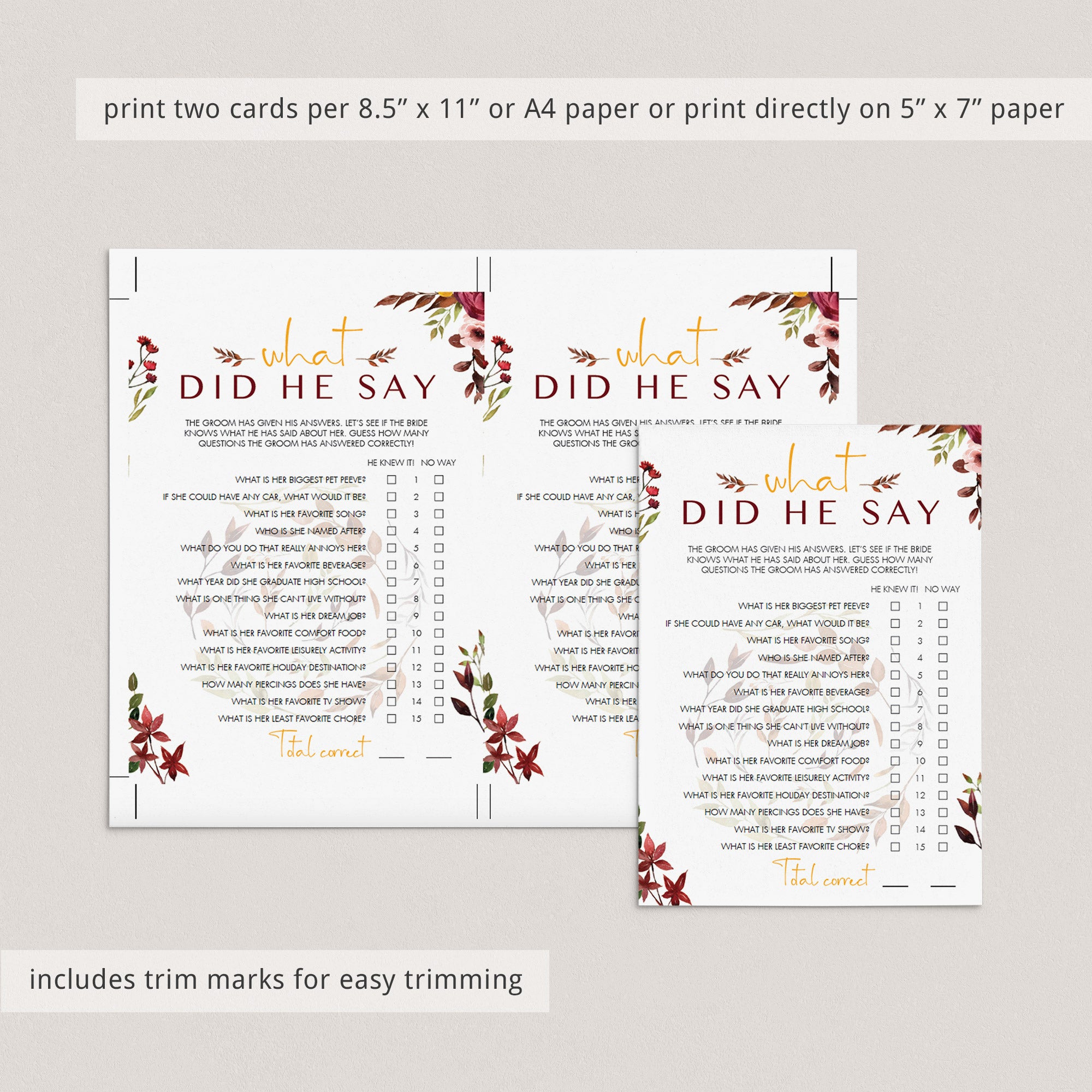 How well do you think the groom knows his bride? Find out with this gorgeous burgundy floral wedding shower game What Did He Say. The game is the perfect addition to your fall wedding shower.