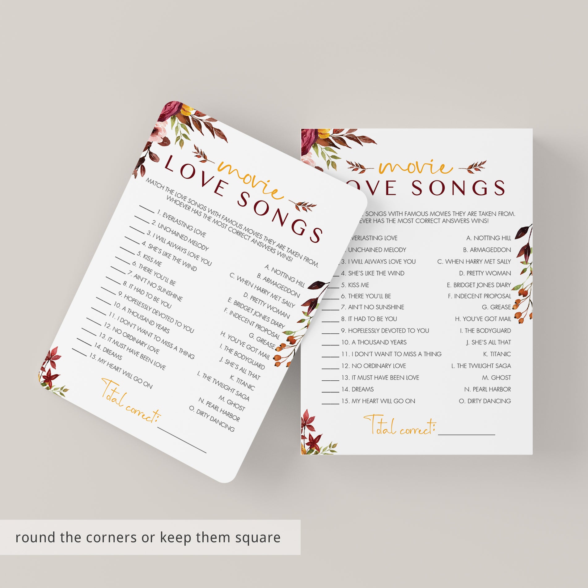 Are you looking for a fun game to play at your bridal party or wedding shower? Play Match The Movie Love Song with these burgundy floral game cards. It's the perfect icebreaker game for your autumn theme party and will sure get everyone in the right mood.