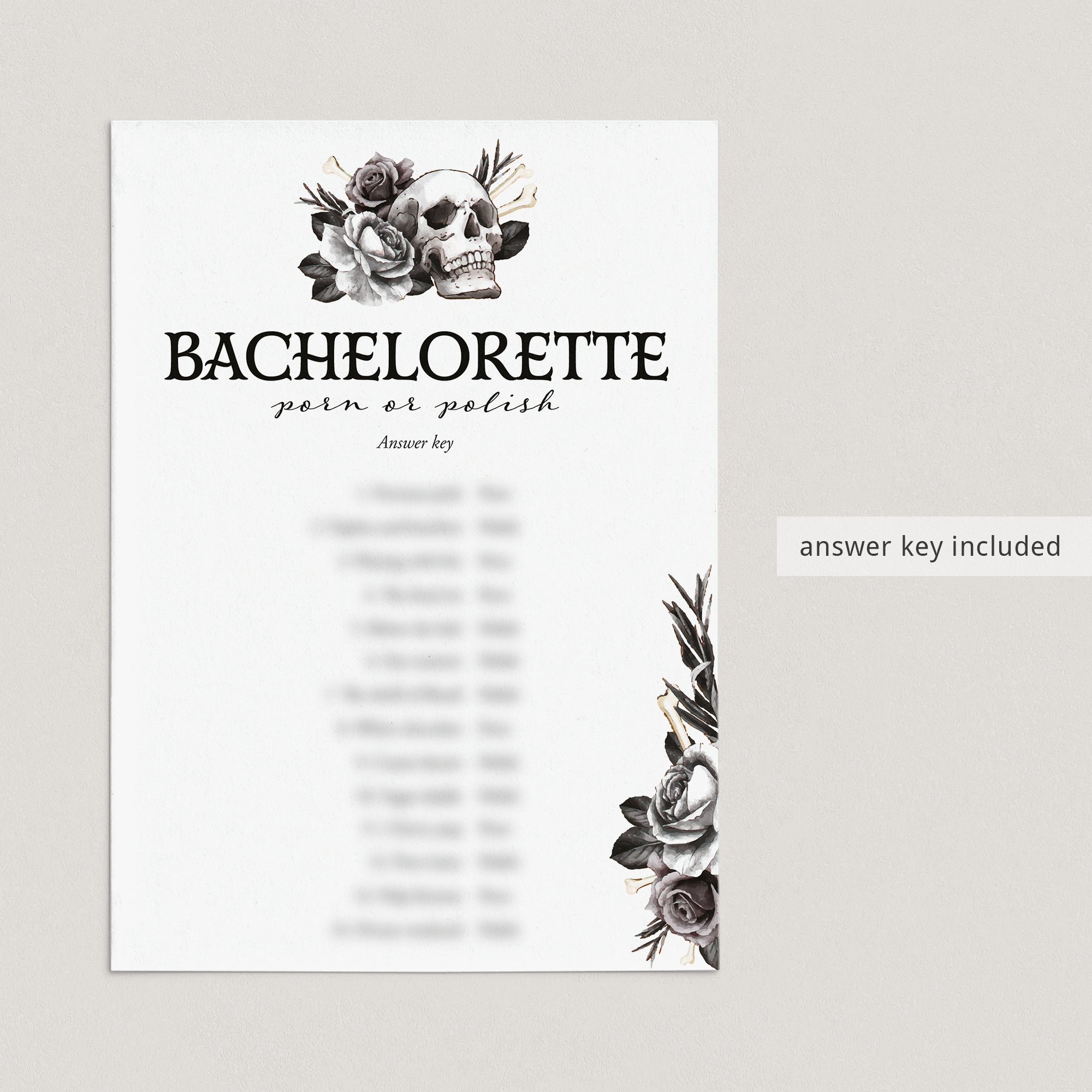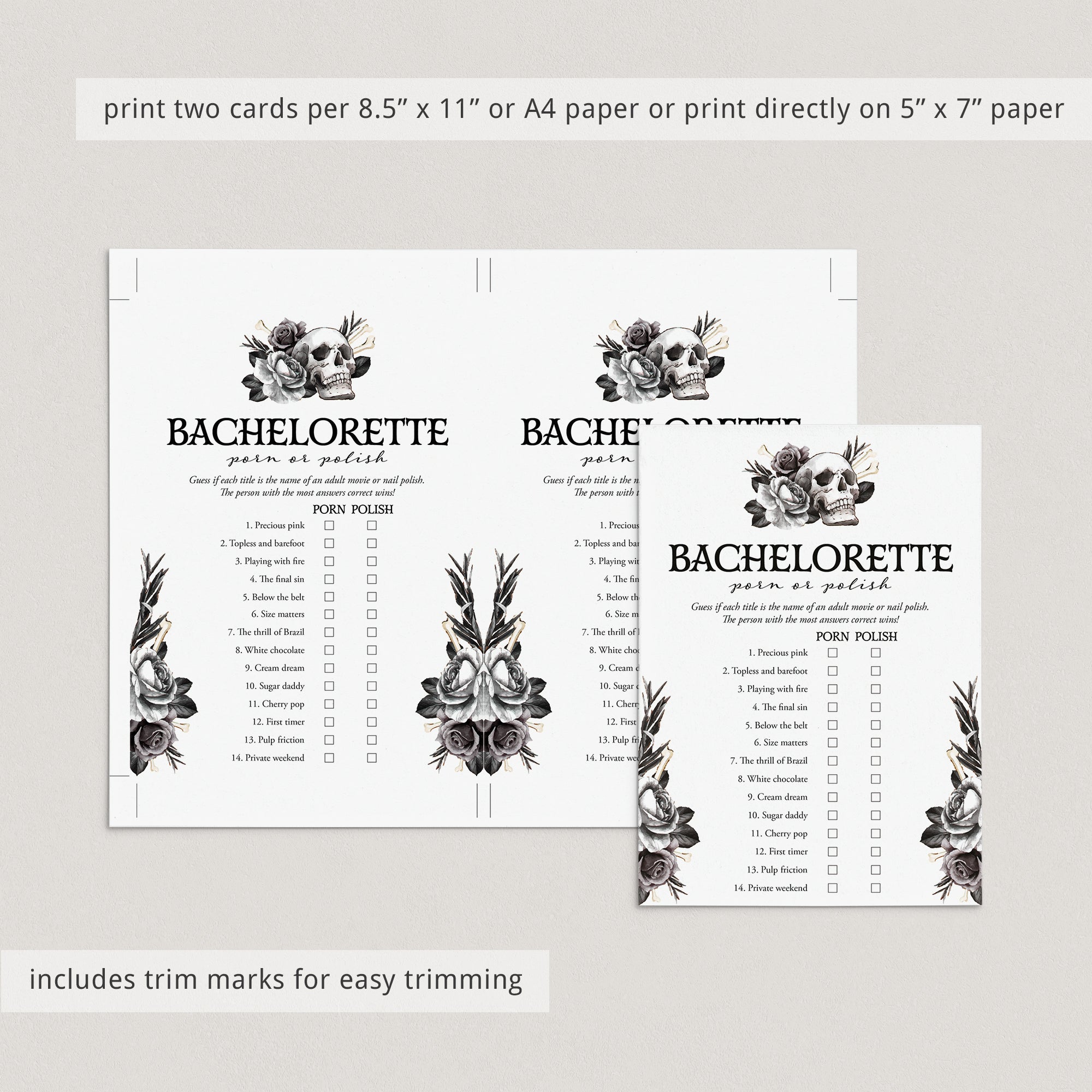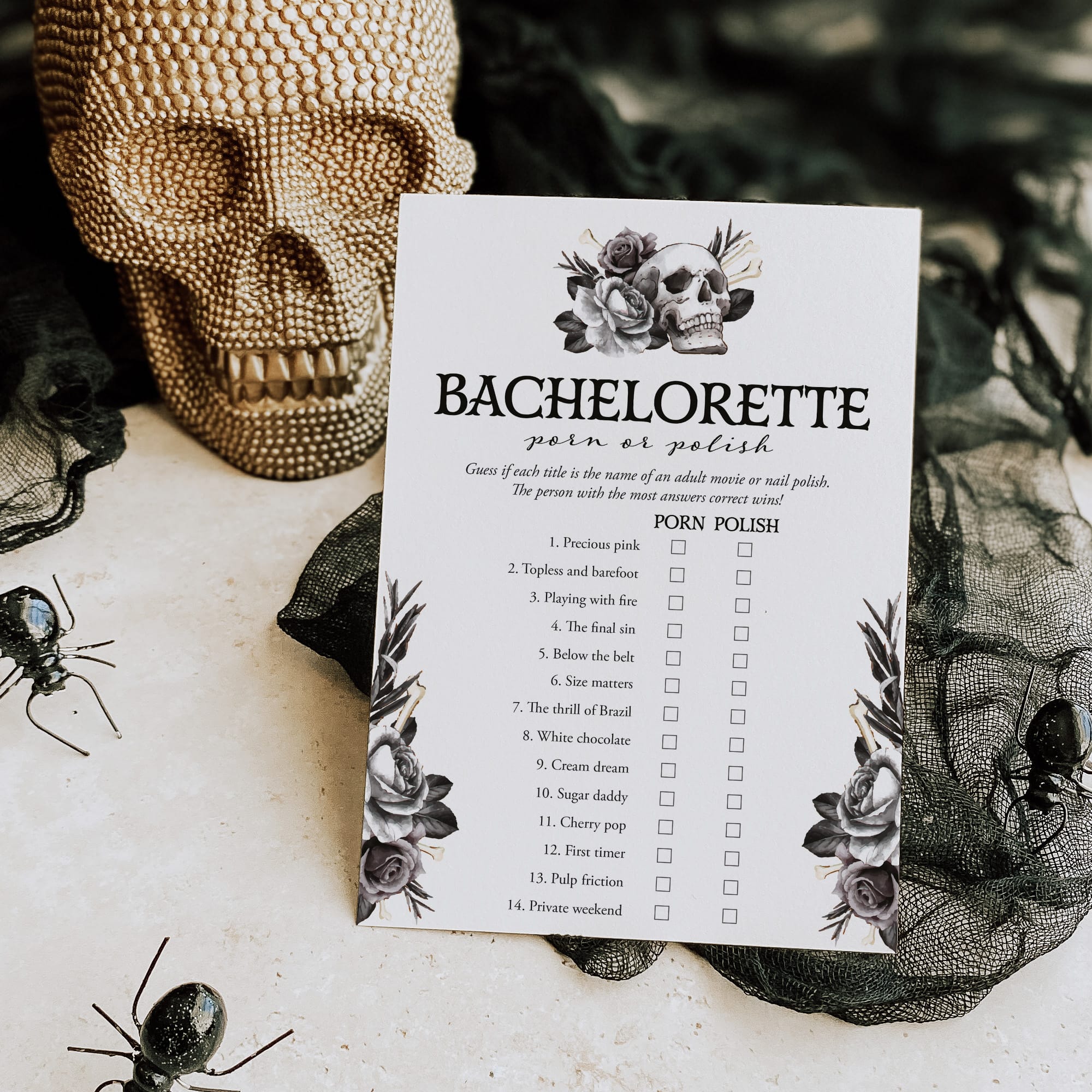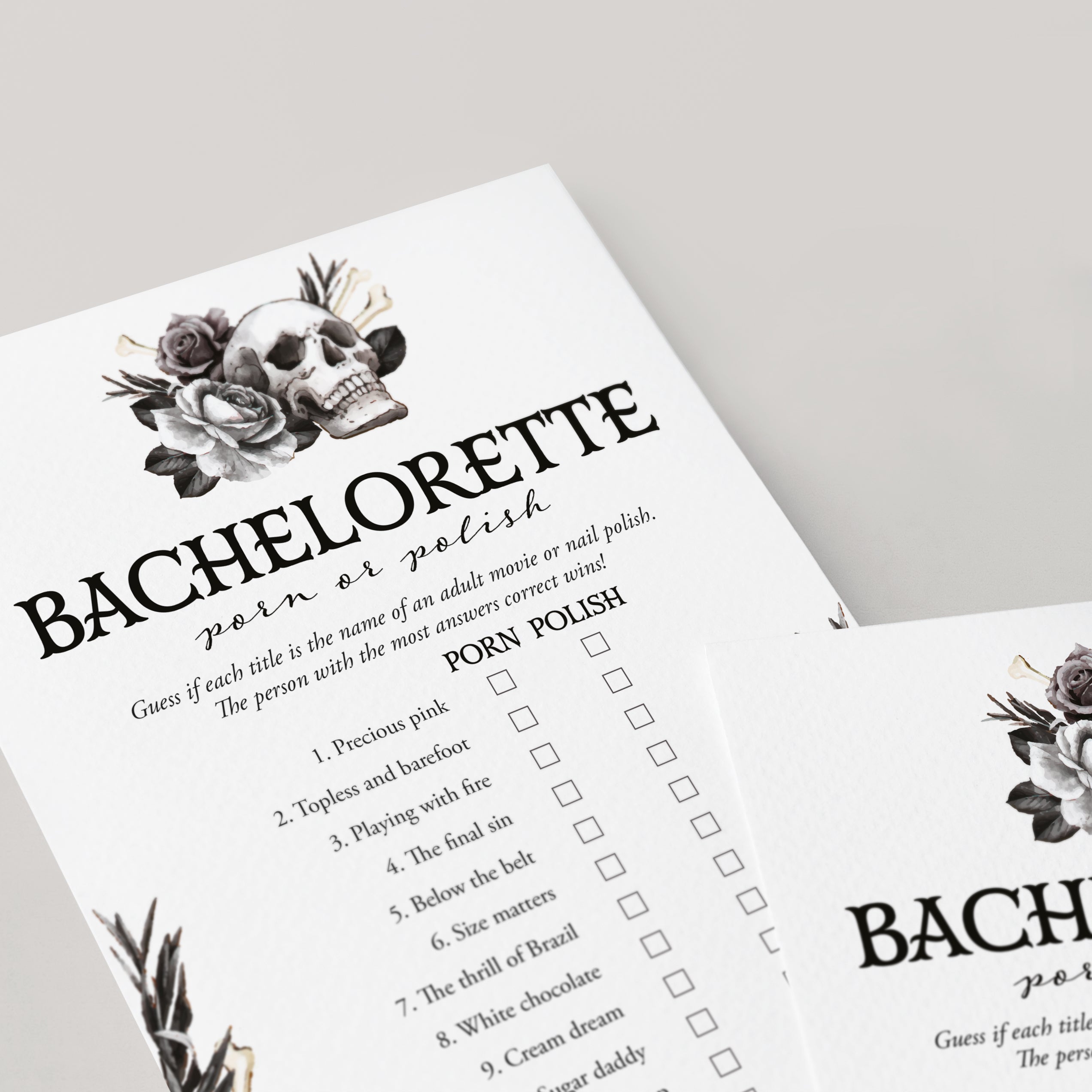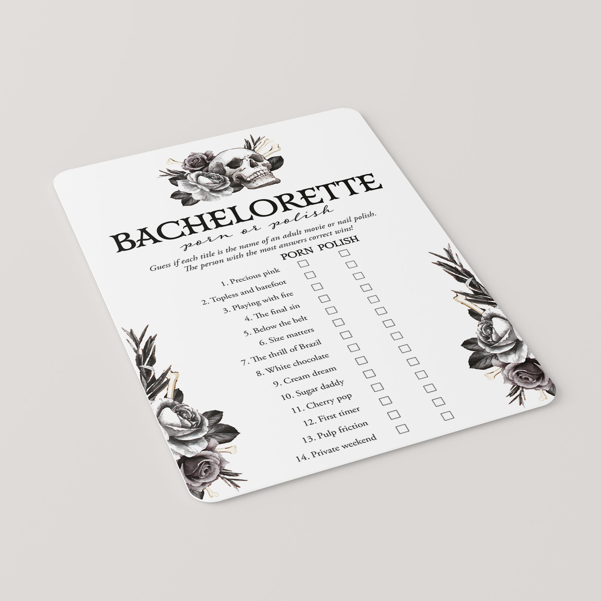 Are you looking for a funny bachelorette game to play with your girlfriends? Play Porn or Polish with this Bride or Die theme bachelorette game with black florals and skull. It is a hilarious addition to your gothic Bachelorette Party, Alternative Hen Night or "Till Death Do Us Part" Bridal Shower. You'll have your girls laughing in no time.