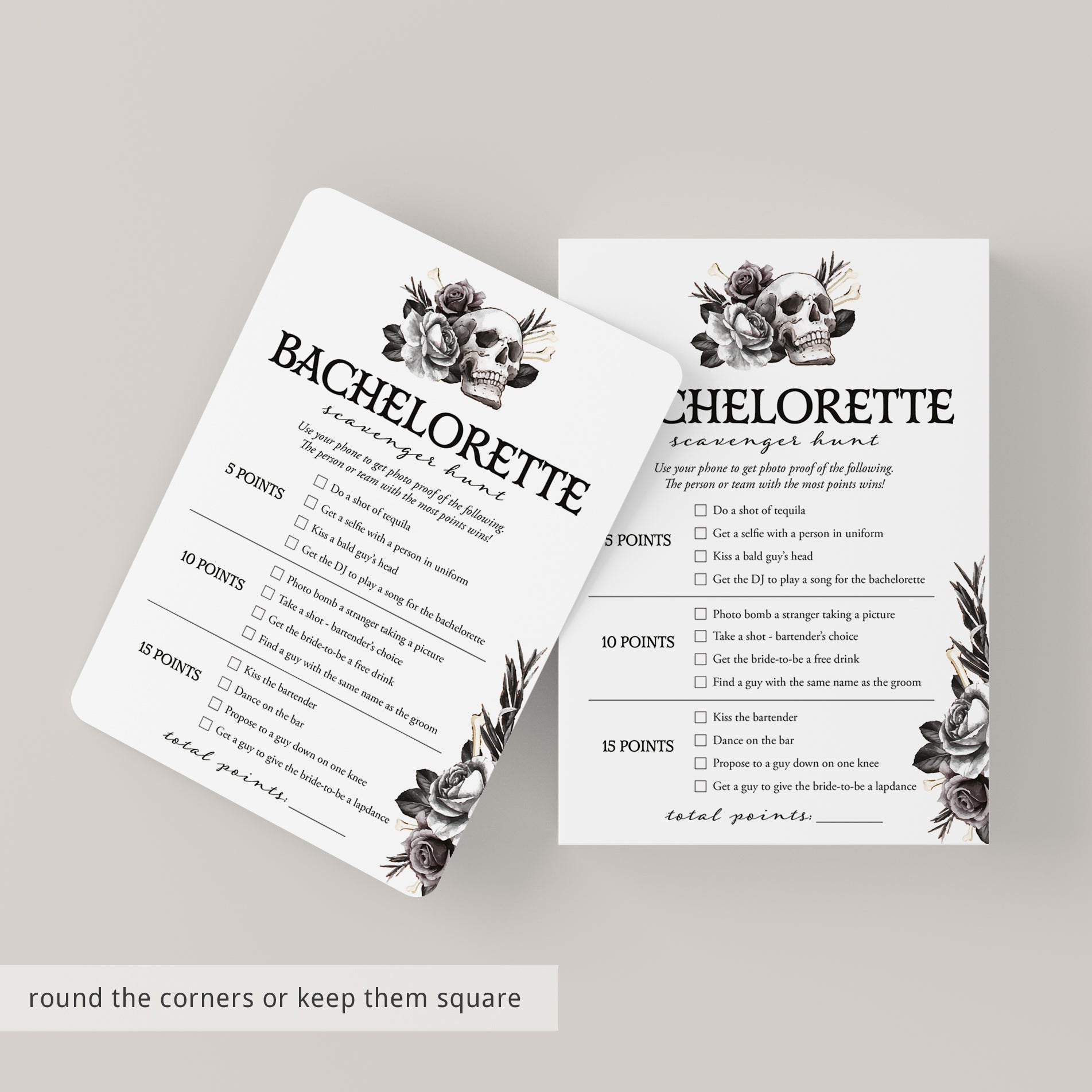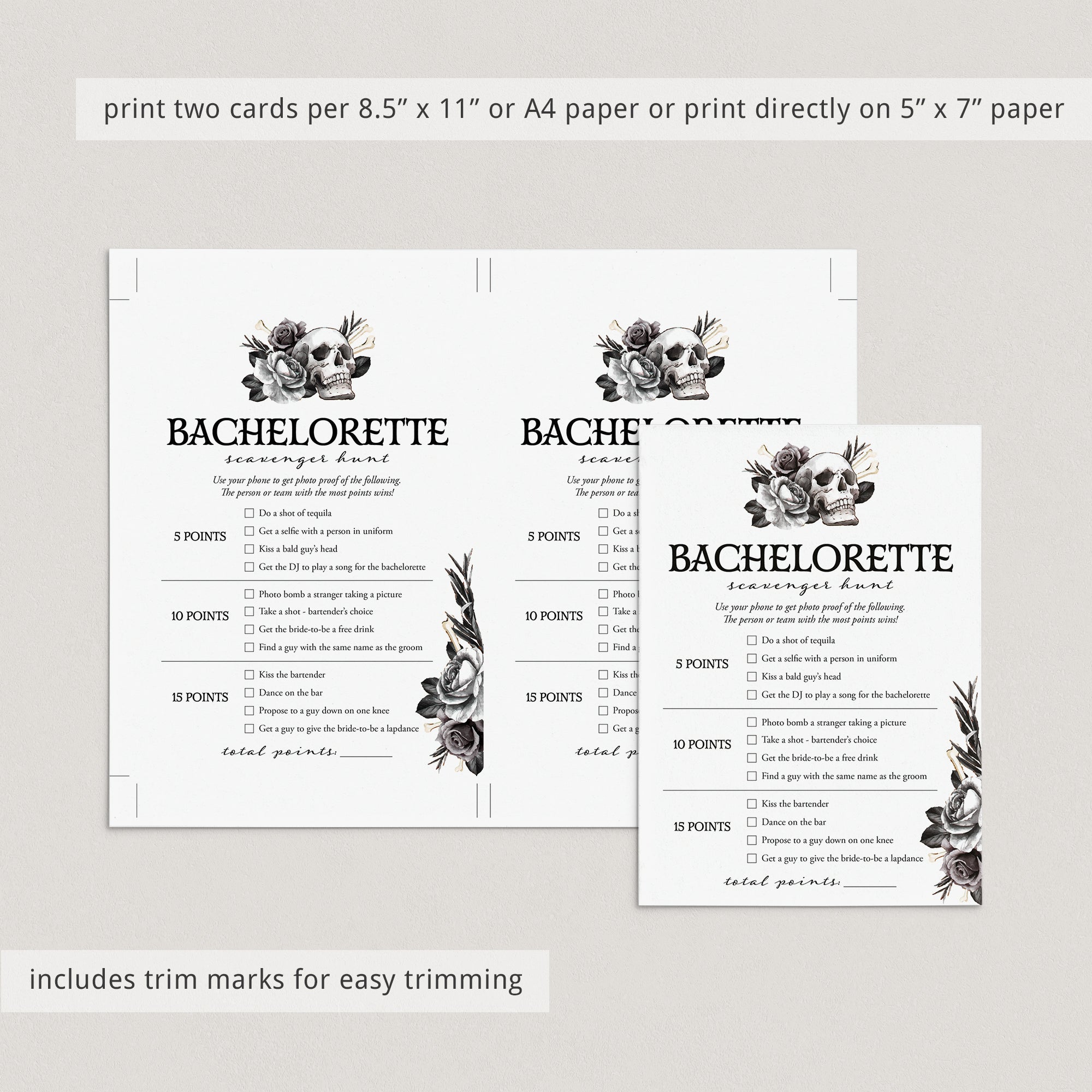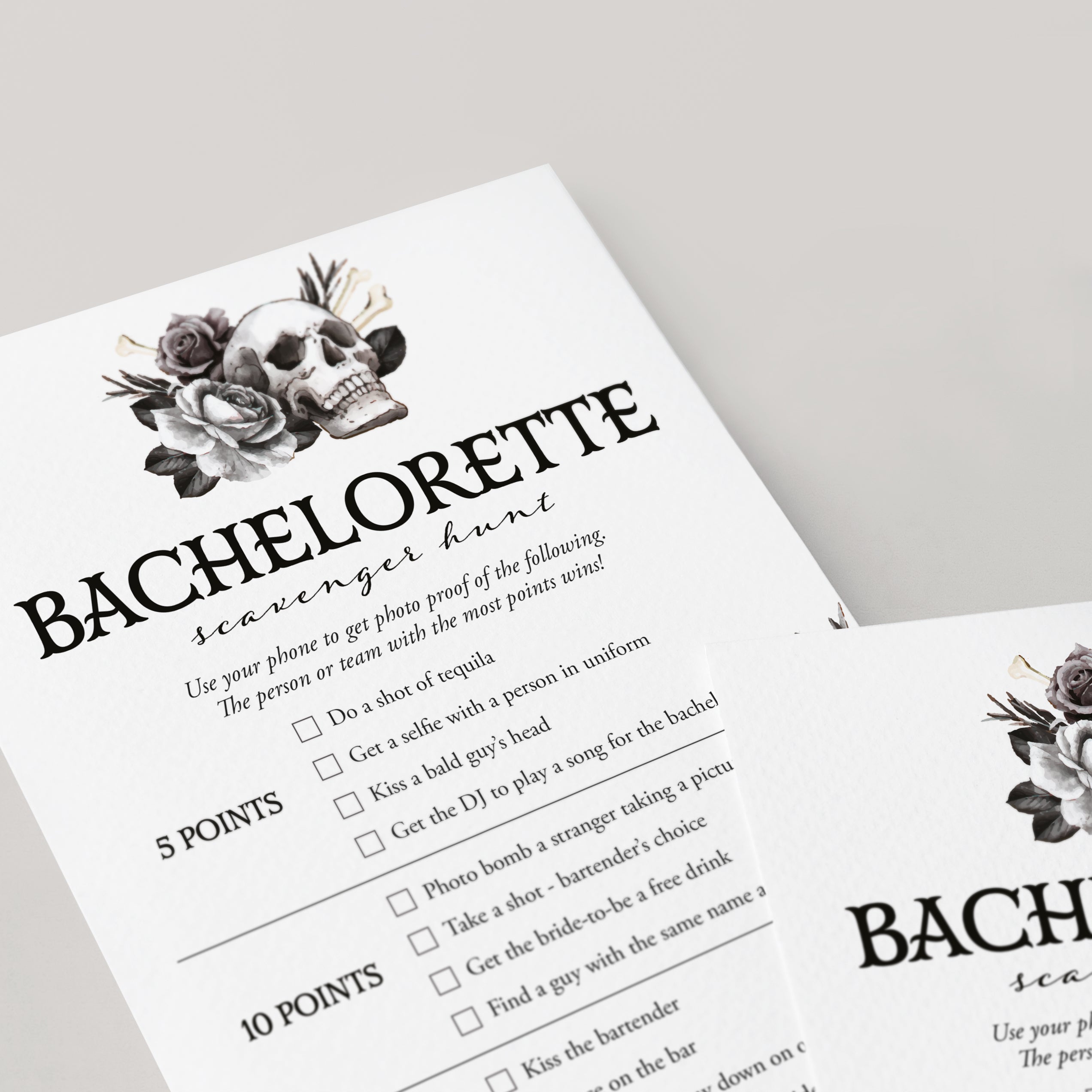 Ensure a wild hen night with this Bride or Die theme Scavenger Hunt game with black florals and skull. It's the perfect addition to your goodbye bachelorette party or Till Death Do Us Part bridal shower.