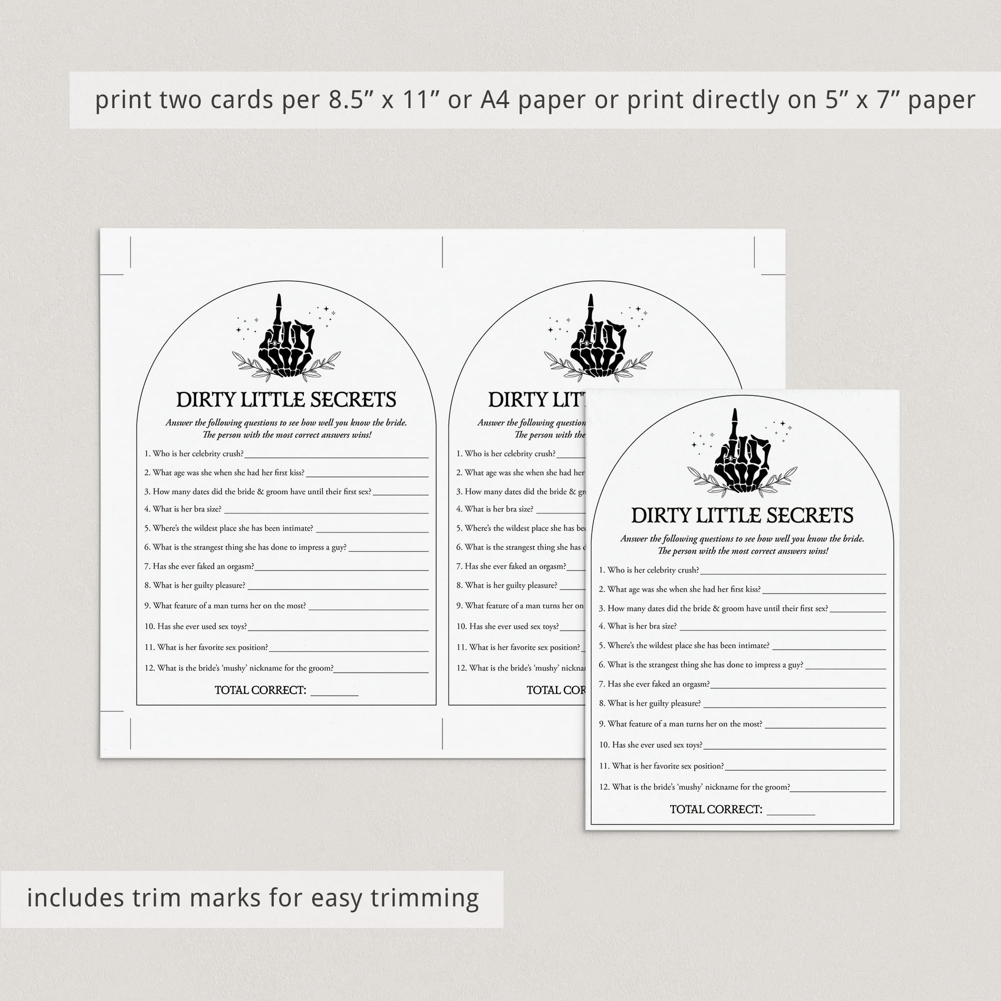 How well do you really know the bride? Test your bachelorette party guests on who knows the bride best with this Bride or Die theme Dirty Little Secrets game with black skeleton hand with wedding ring. The questions reveal a saucier side to the bride you might not recognize! It is a hilarious addition to your Goodbye Bachelorette Party, Bride or Die Hen Party or Till Death Do Us Part Bridal Shower. You'll have your girls laughing in no time.