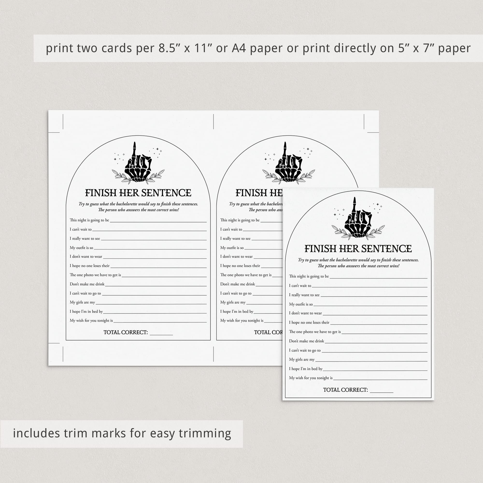 This black skeleton bachelorette game is very easy to play. Have the bachelorette complete the sentences as the answer key before the party starts. Then compare her responses to what your girlfriends guessed. The player with the most correct wins bragging rights.