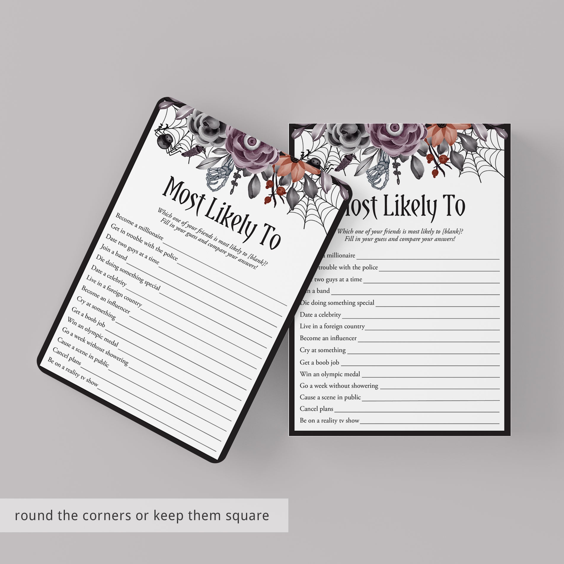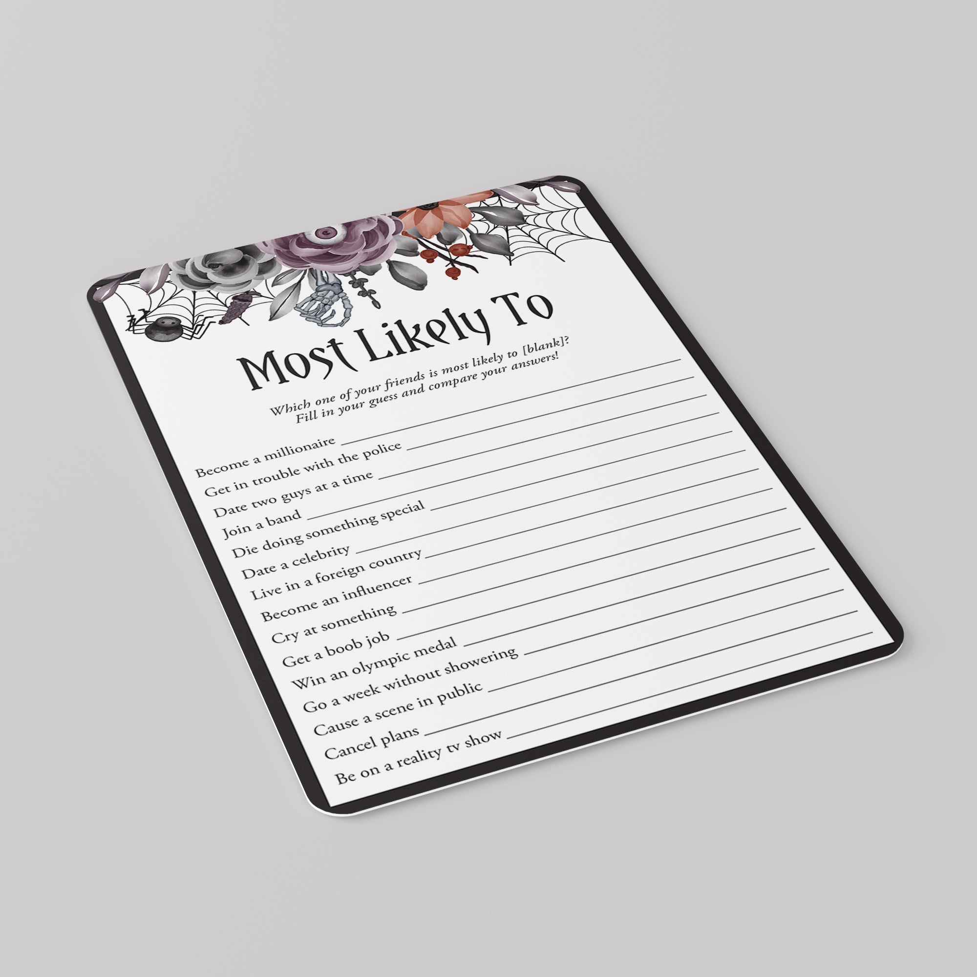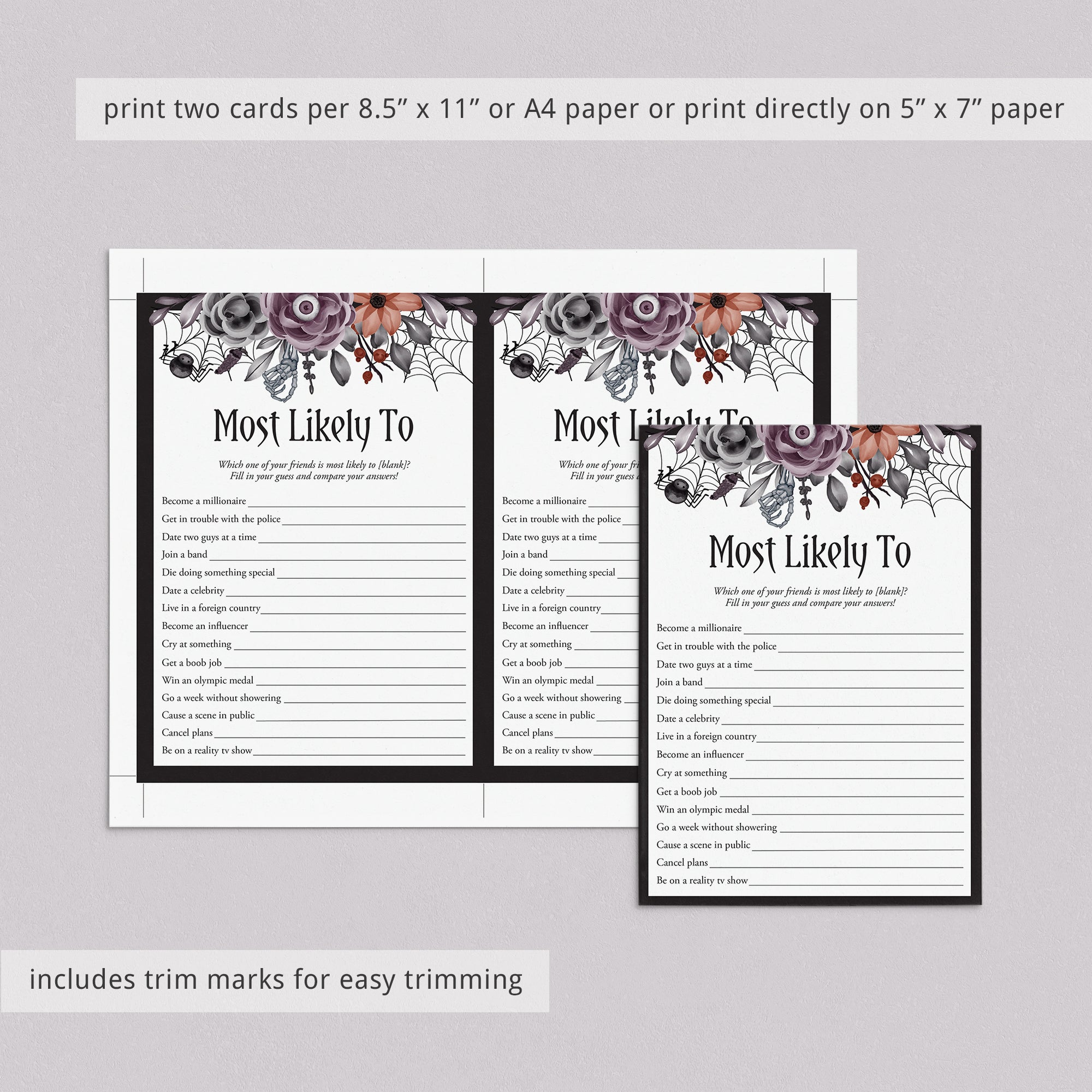 Are you looking for a fun icebreaker game and great conversation starter for your Halloween hen party? Play Who Is Most Likely To with this creepy floral game card. The game has 19 Most Likely To questions for girls that will get everyone talking and laughing. You will get to know your friends at some new level.