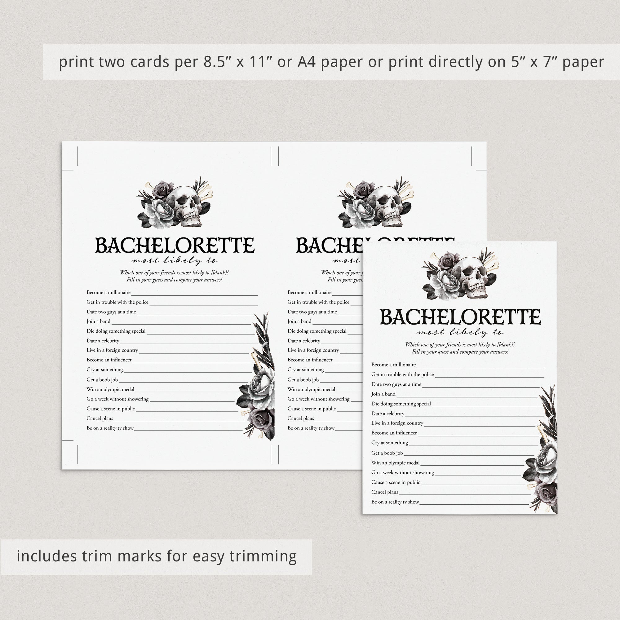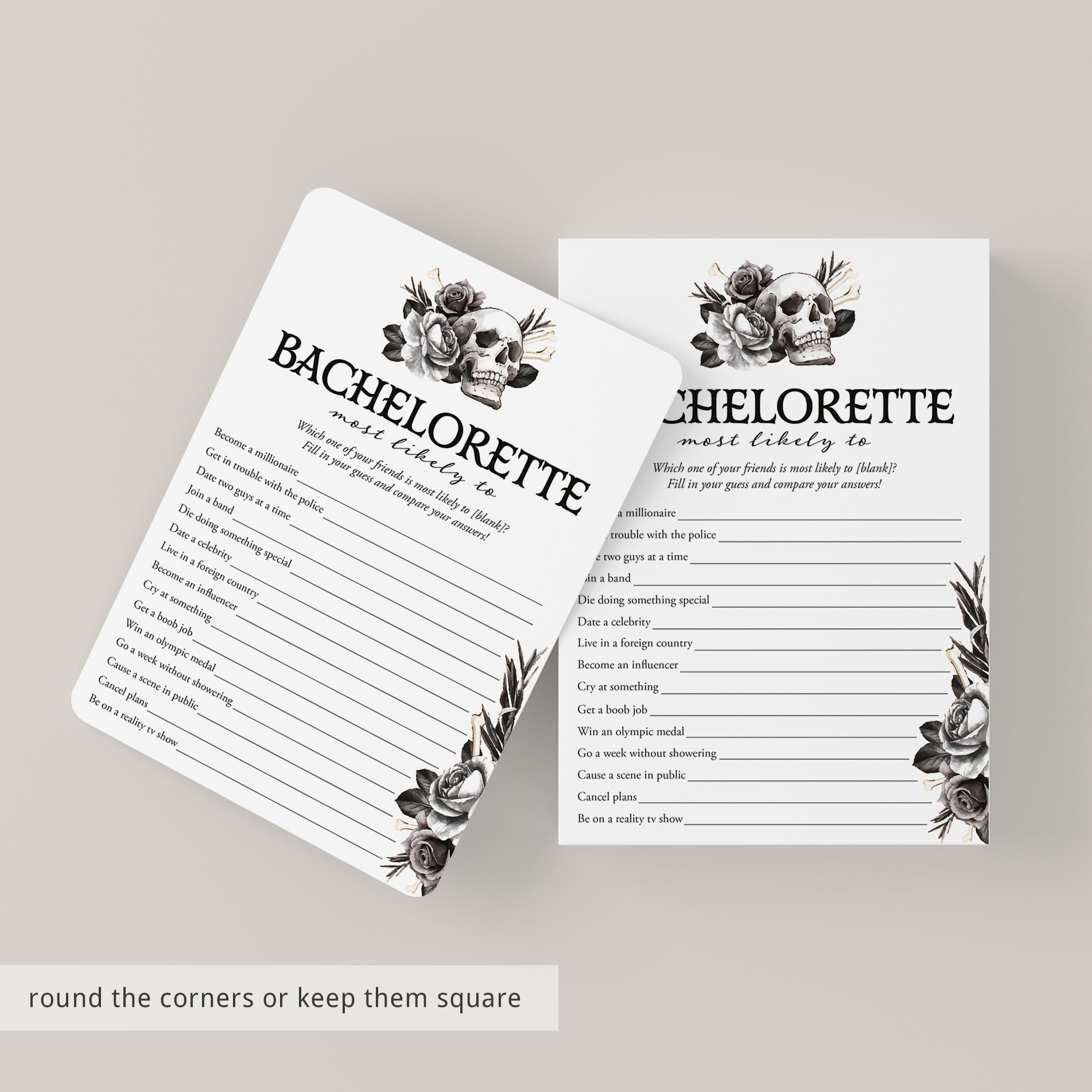 Are you looking for a fun icebreaker game and great conversation starter for your gothic bachelorette party? Play Who Is Most Likely To with this black game card with floral skull. The game has 19 Most Likely To questions for girls that will get everyone talking and laughing. You will get to know your friends at some new level.