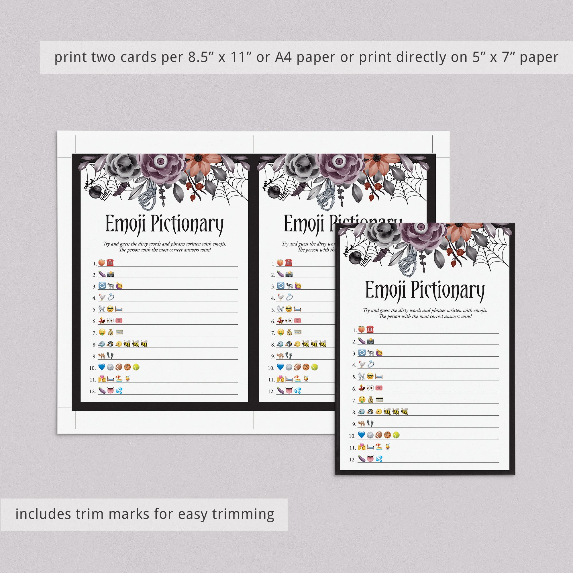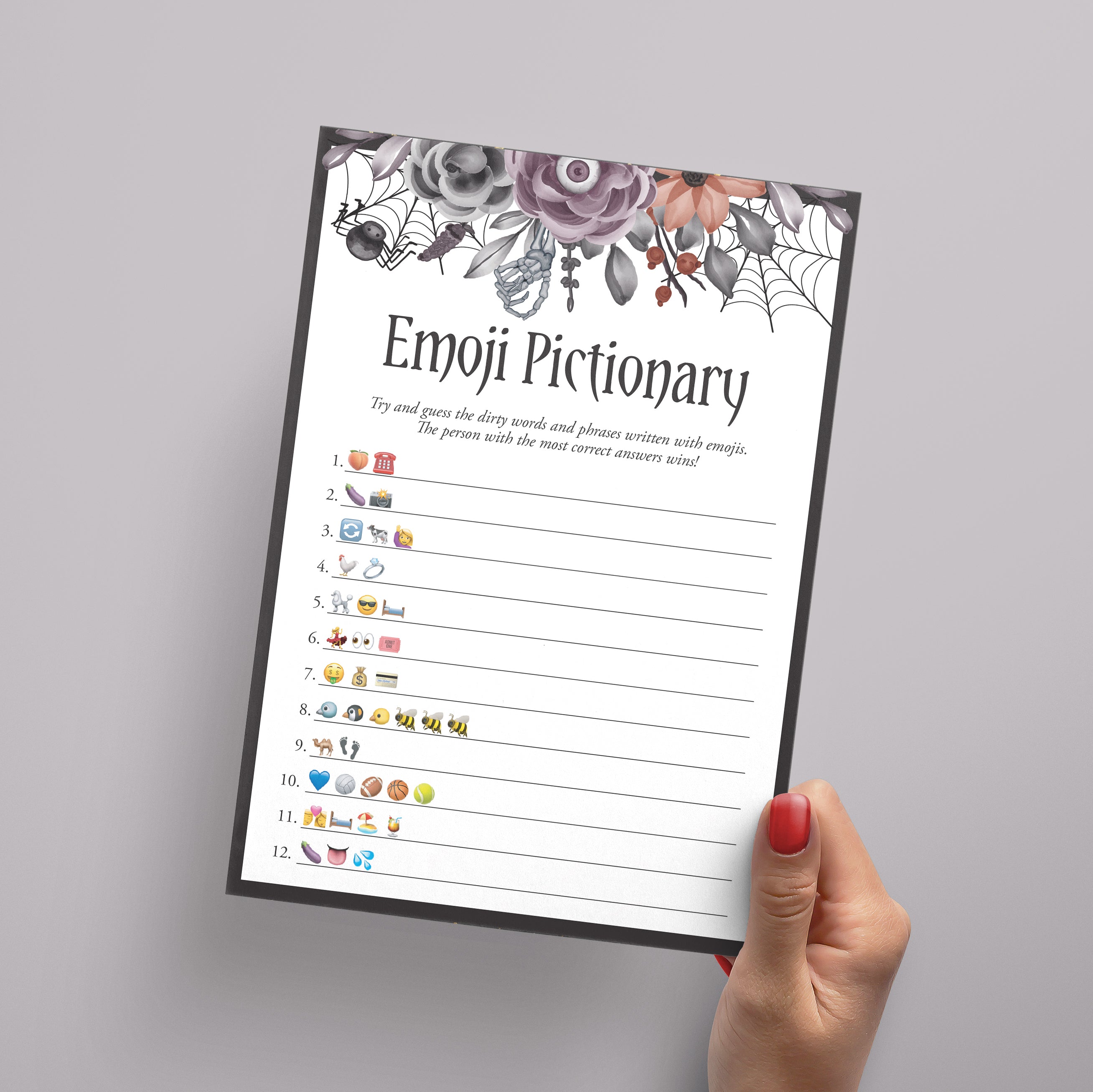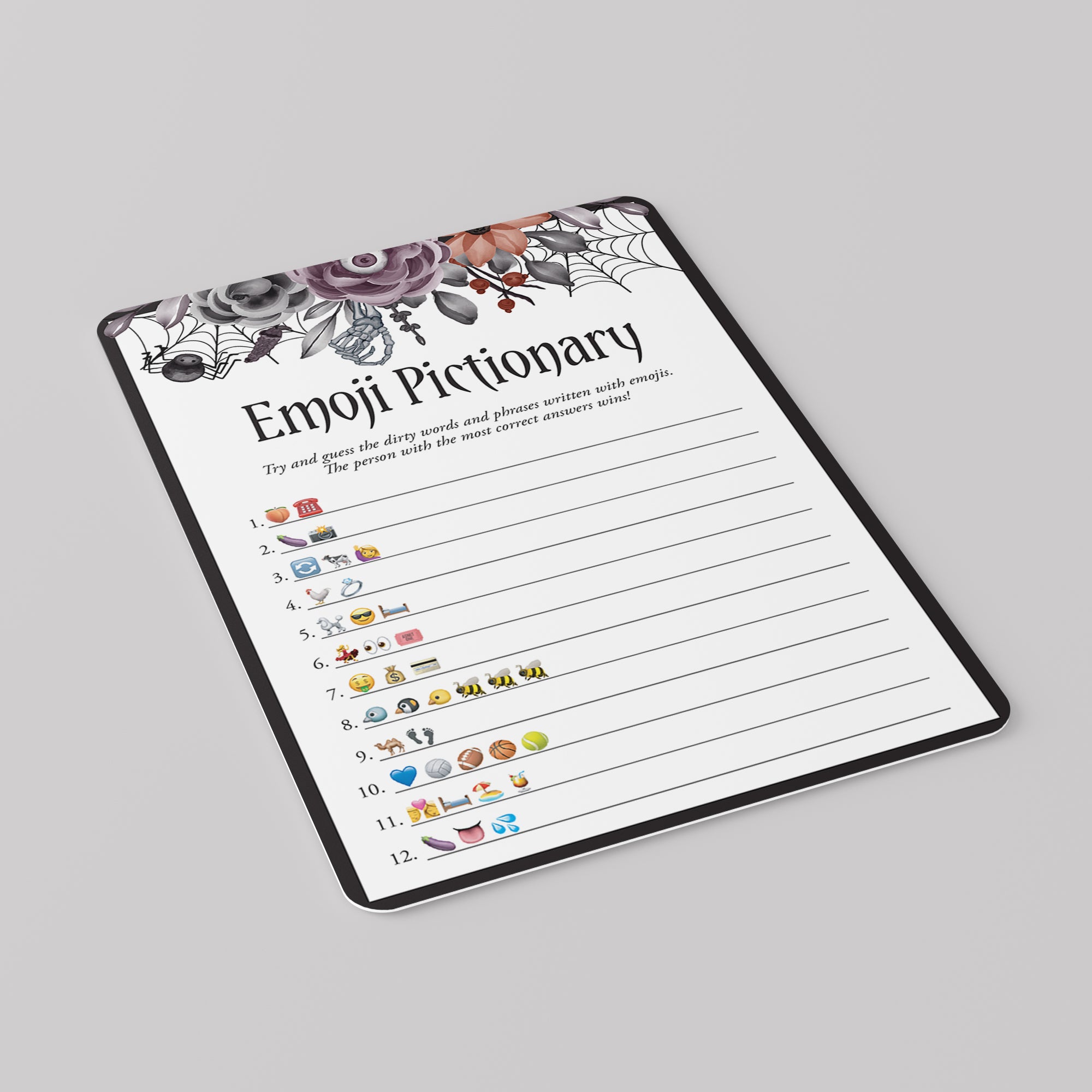 Are you looking for a unique bachelorette game to play with your girlfriends? Play Emoji Pictionary with this Halloween bachelorette Emoji Pictionary game with moody florals. It is a hilarious addition to your Bride or Die Bachelorette Party, Halloween Hen Night or "Till Death Do Us Part" Bridal Shower. You'll have your girls laughing in no time.