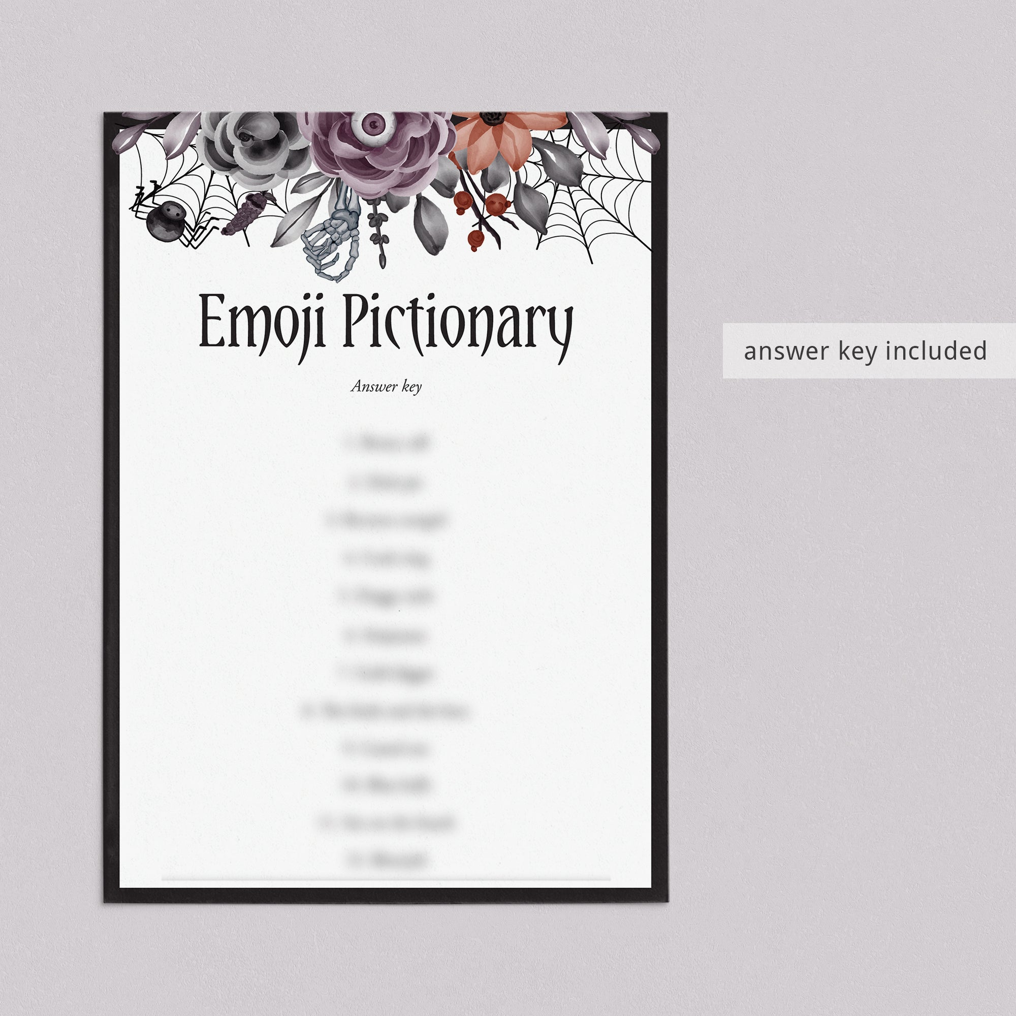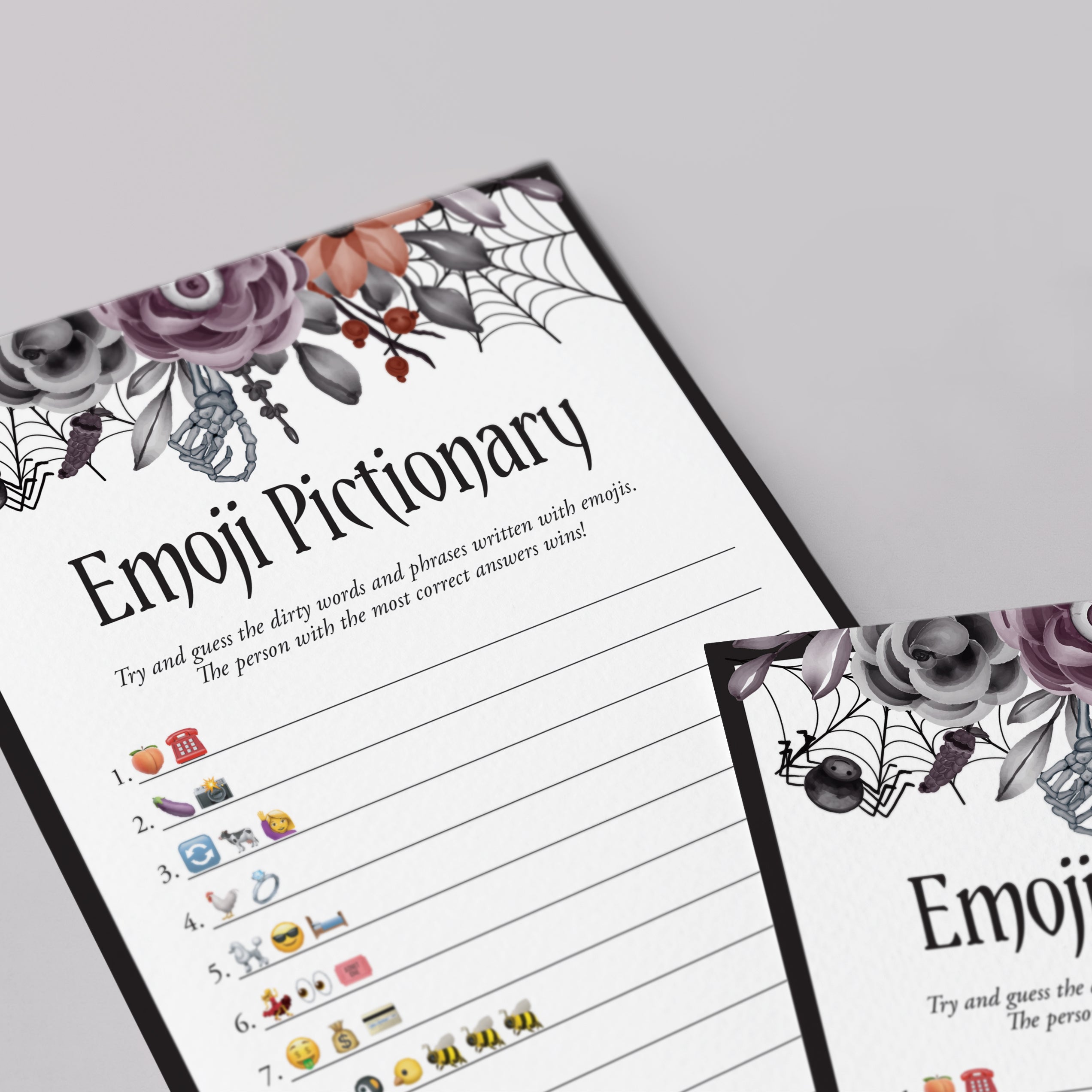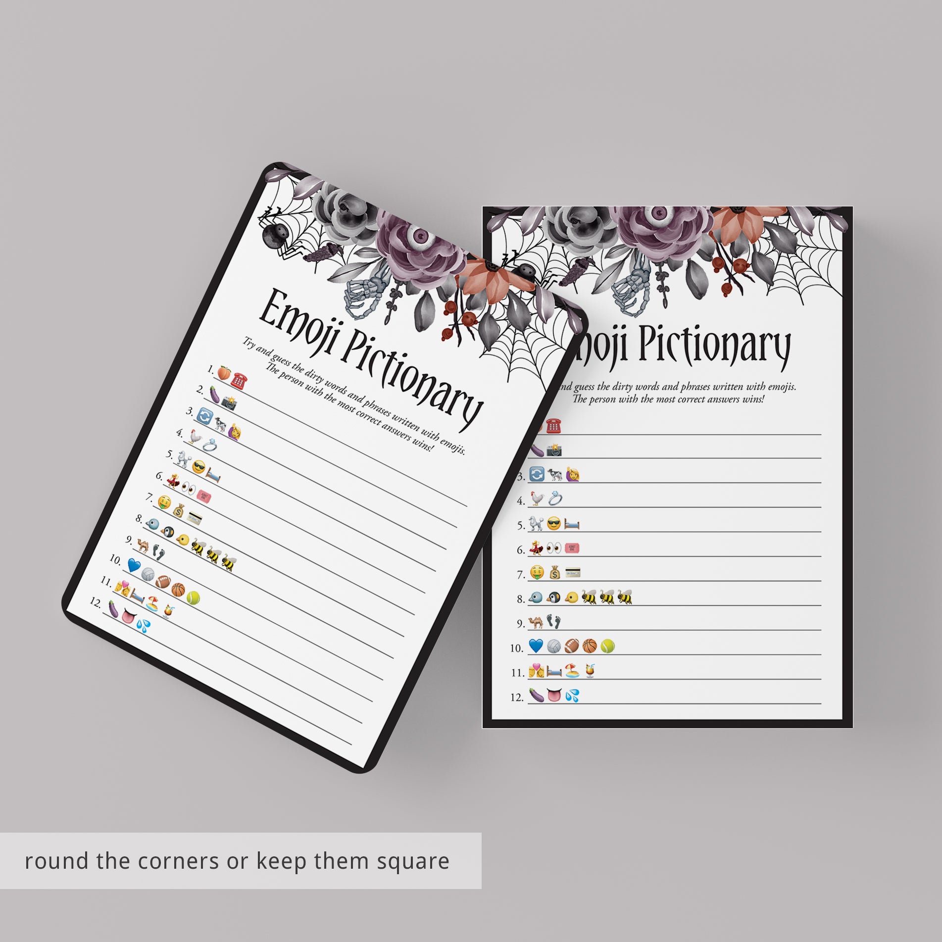 Are you looking for a unique bachelorette game to play with your girlfriends? Play Emoji Pictionary with this Halloween bachelorette Emoji Pictionary game with moody florals. It is a hilarious addition to your Bride or Die Bachelorette Party, Halloween Hen Night or "Till Death Do Us Part" Bridal Shower. You'll have your girls laughing in no time.