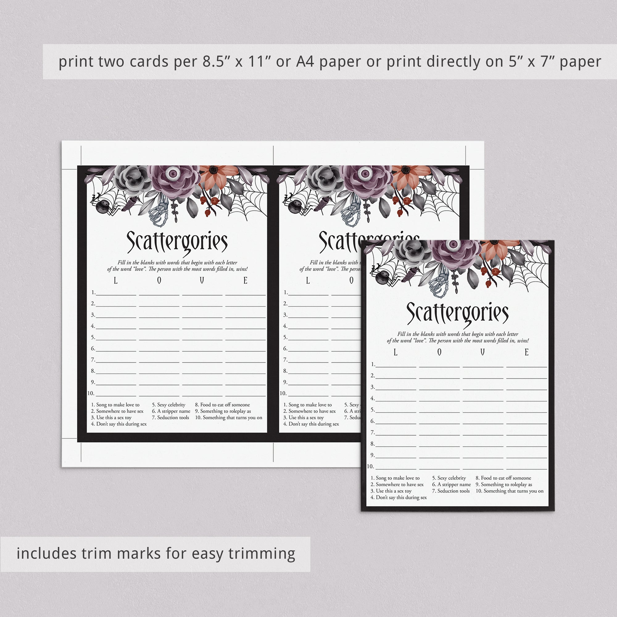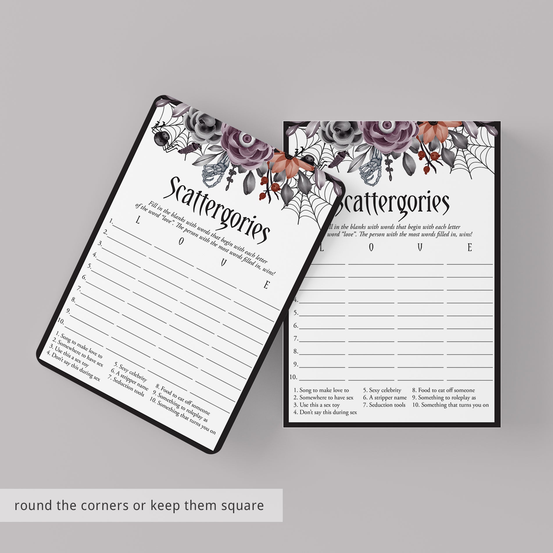 How many naughty words can you fill in with the letters "L", "O", "V" and "E"? Play Dirty Scattergories at your Halloween bach party to ensure lots of fun and laughter. This creepy floral scattergories game is the perfect addition to your Halloween bachelorette party, "Till Death Do Us Party" hen night or "bride or die" bridal shower.