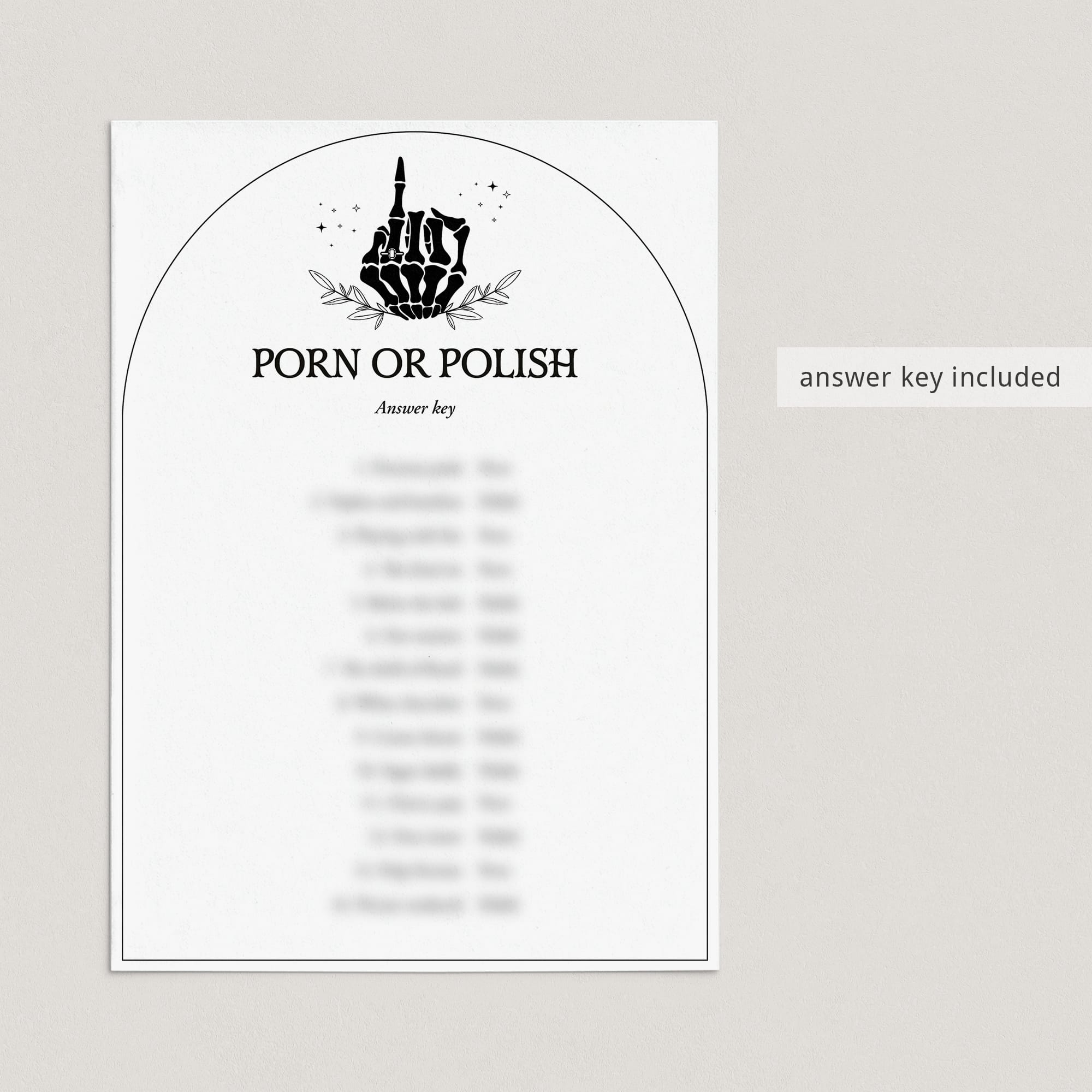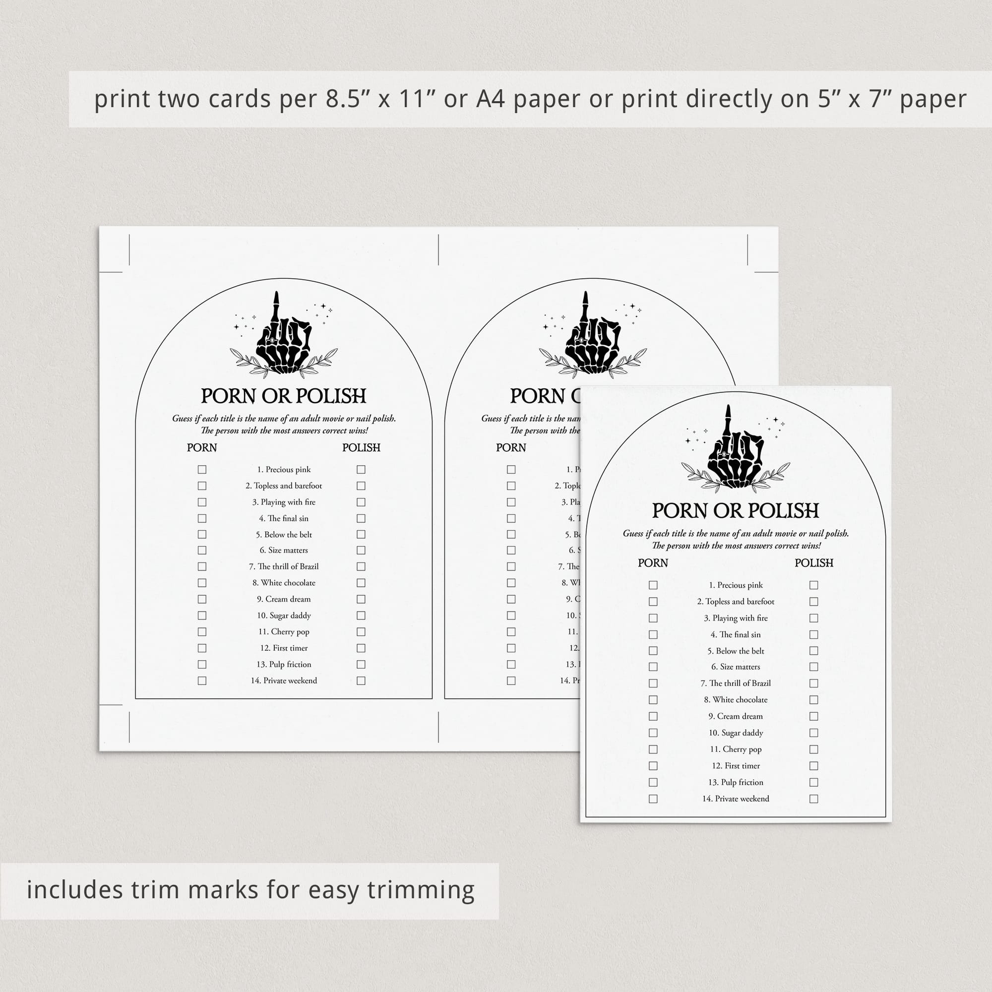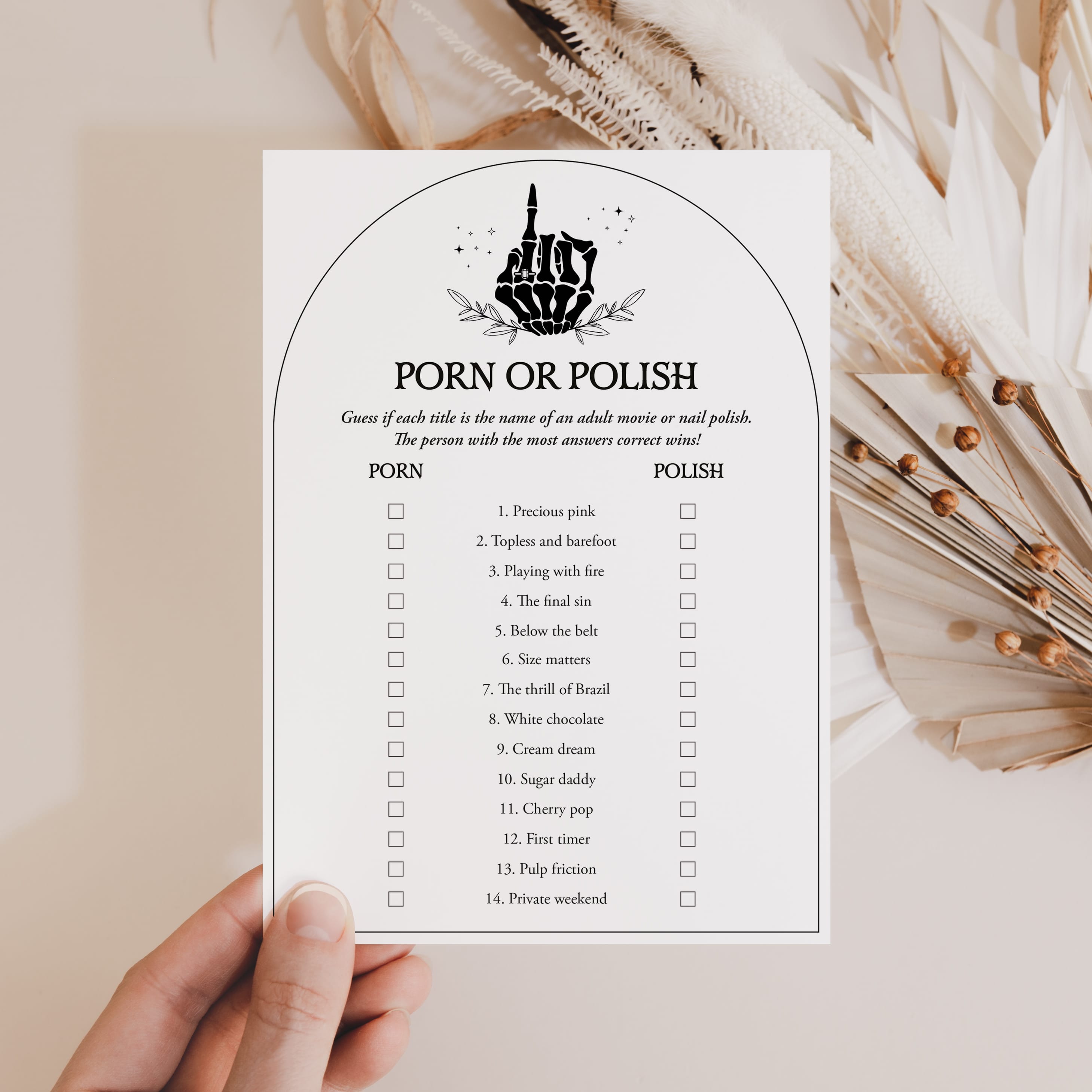 Are you looking for a naughty bachelorette game to play with your girlfriends? Play Porn or Polish with this Bride or Die theme bachelorette game with black skeleton hand with wedding ring. It is a hilarious addition to your Halloween Bachelorette Party, Alternative Hen Night or "Till Death Do Us Part" Bridal Shower. You'll have your girls laughing in no time.