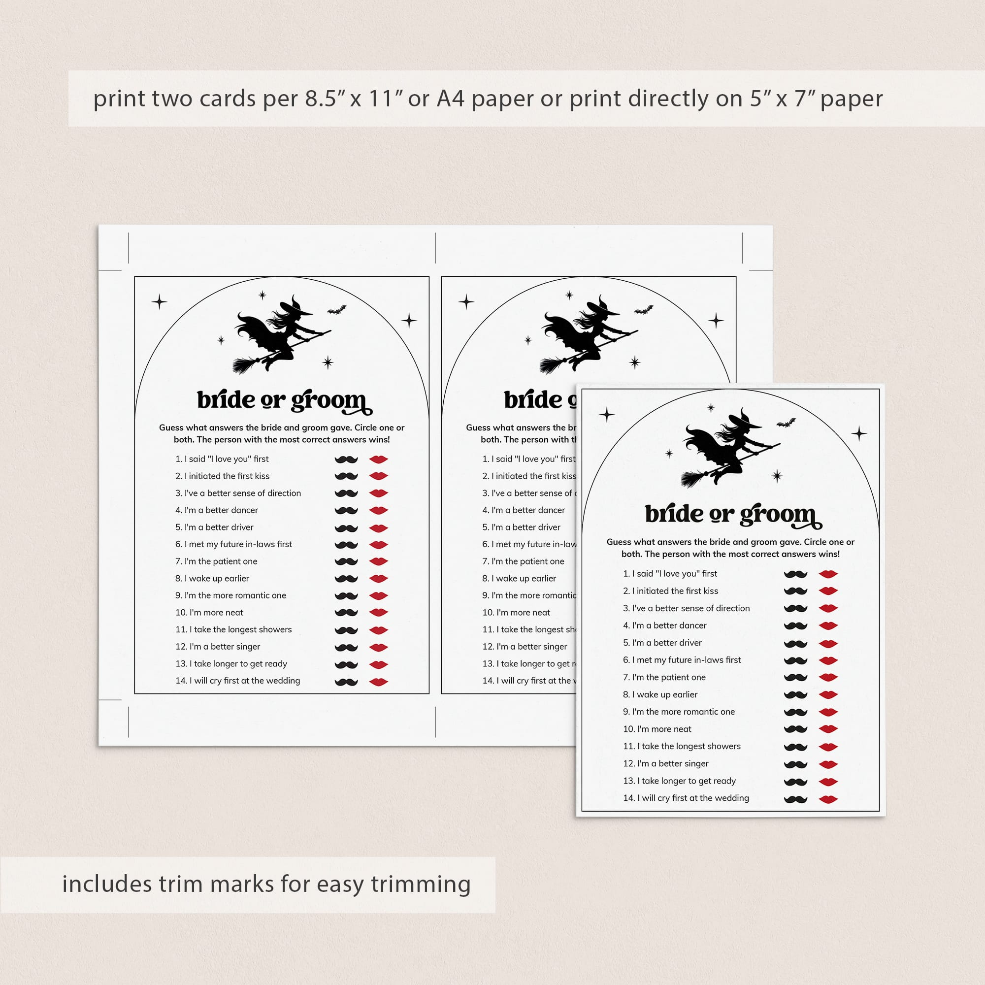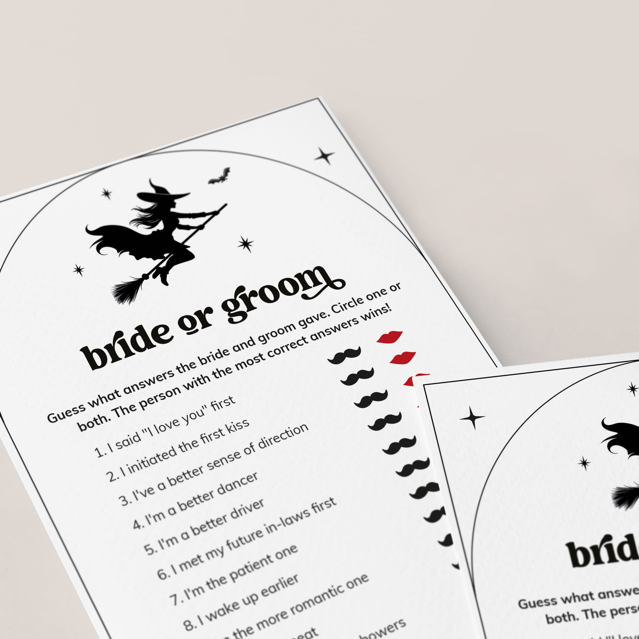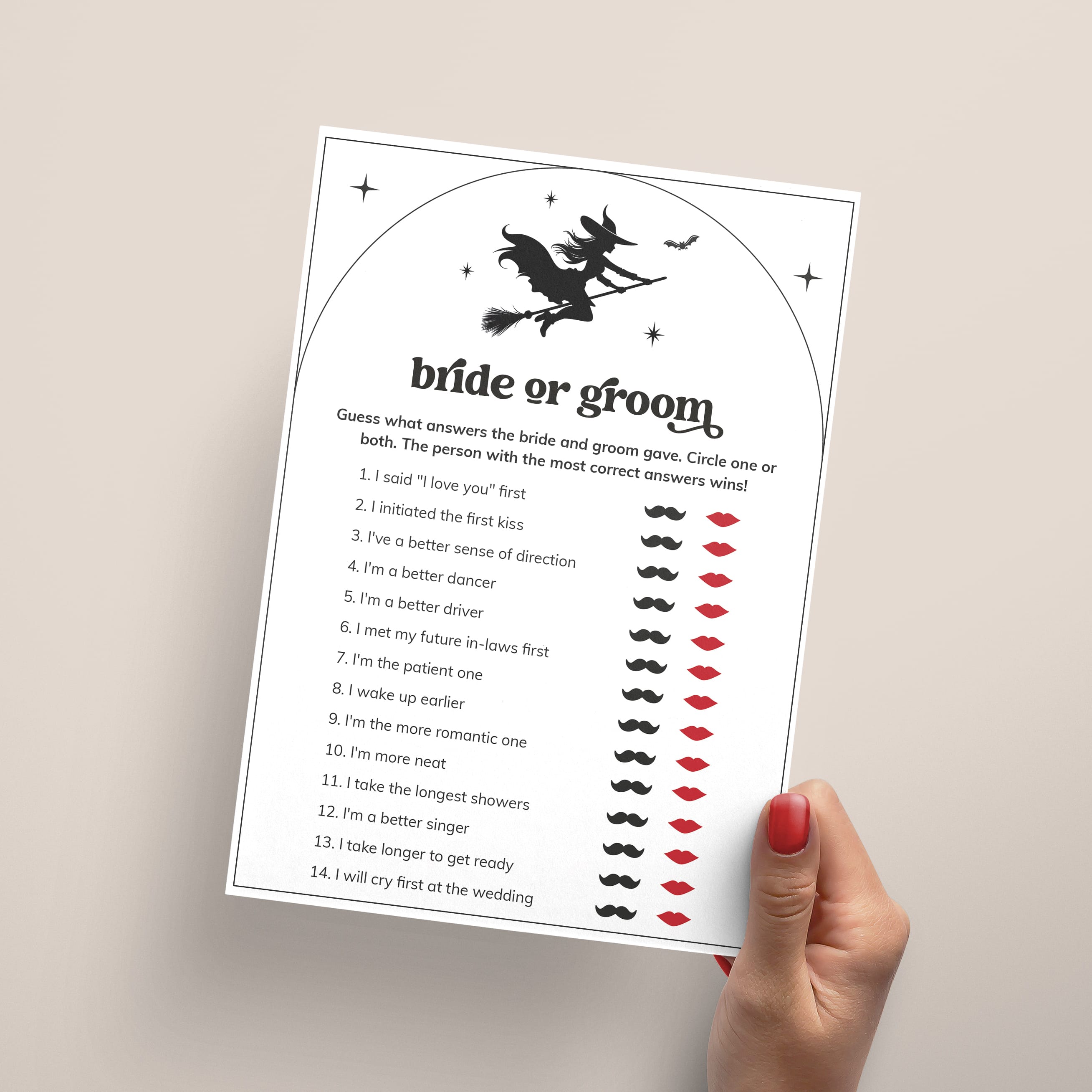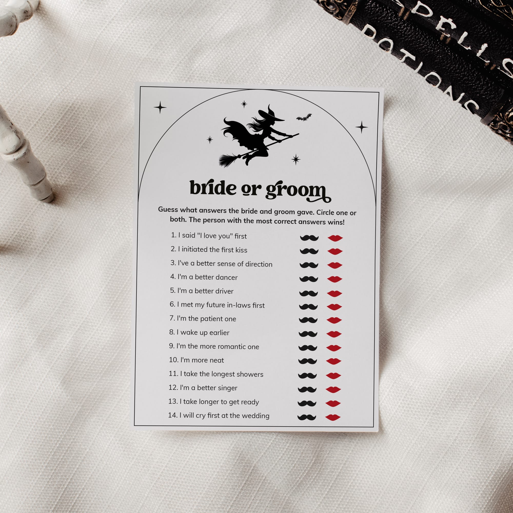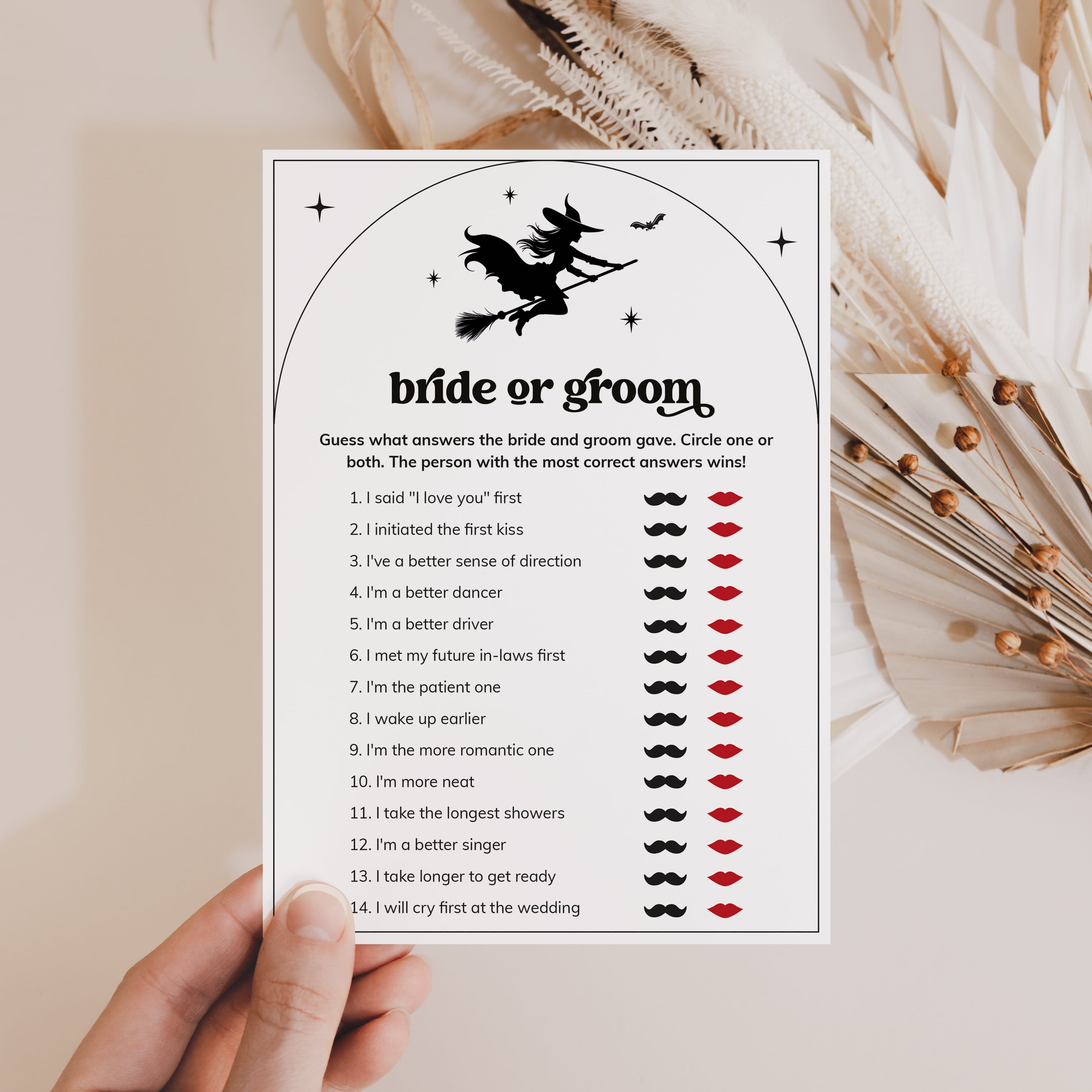 Are you hosting a "This Witch Is Getting Hitched" Bridal Shower? Play Bride or Groom to get to know the soon-to-be-weds a little bit better. These printable game cards are perfect for a witch theme Bridal Shower or co-ed Halloween wedding shower.