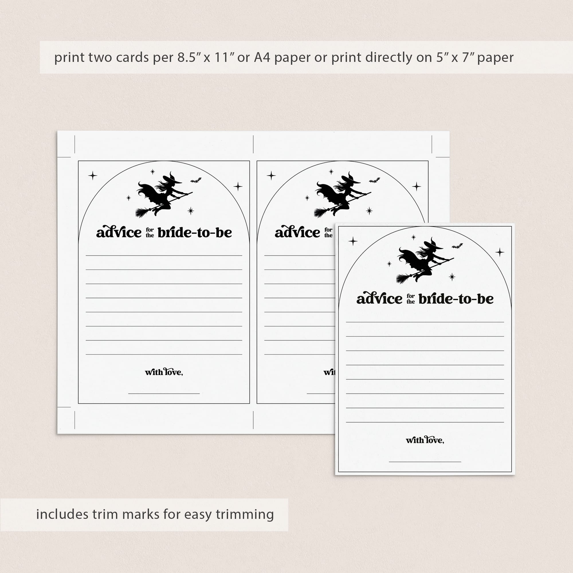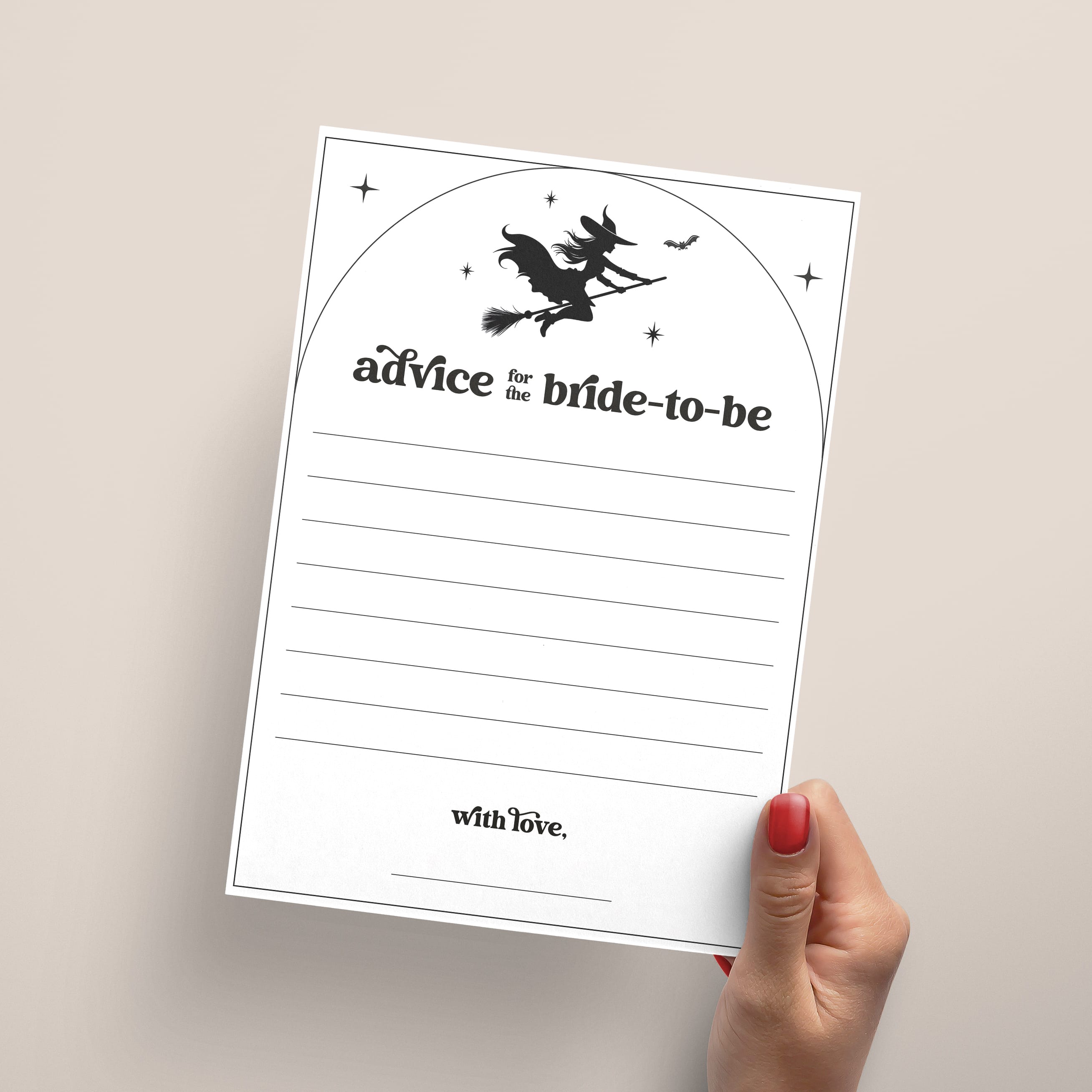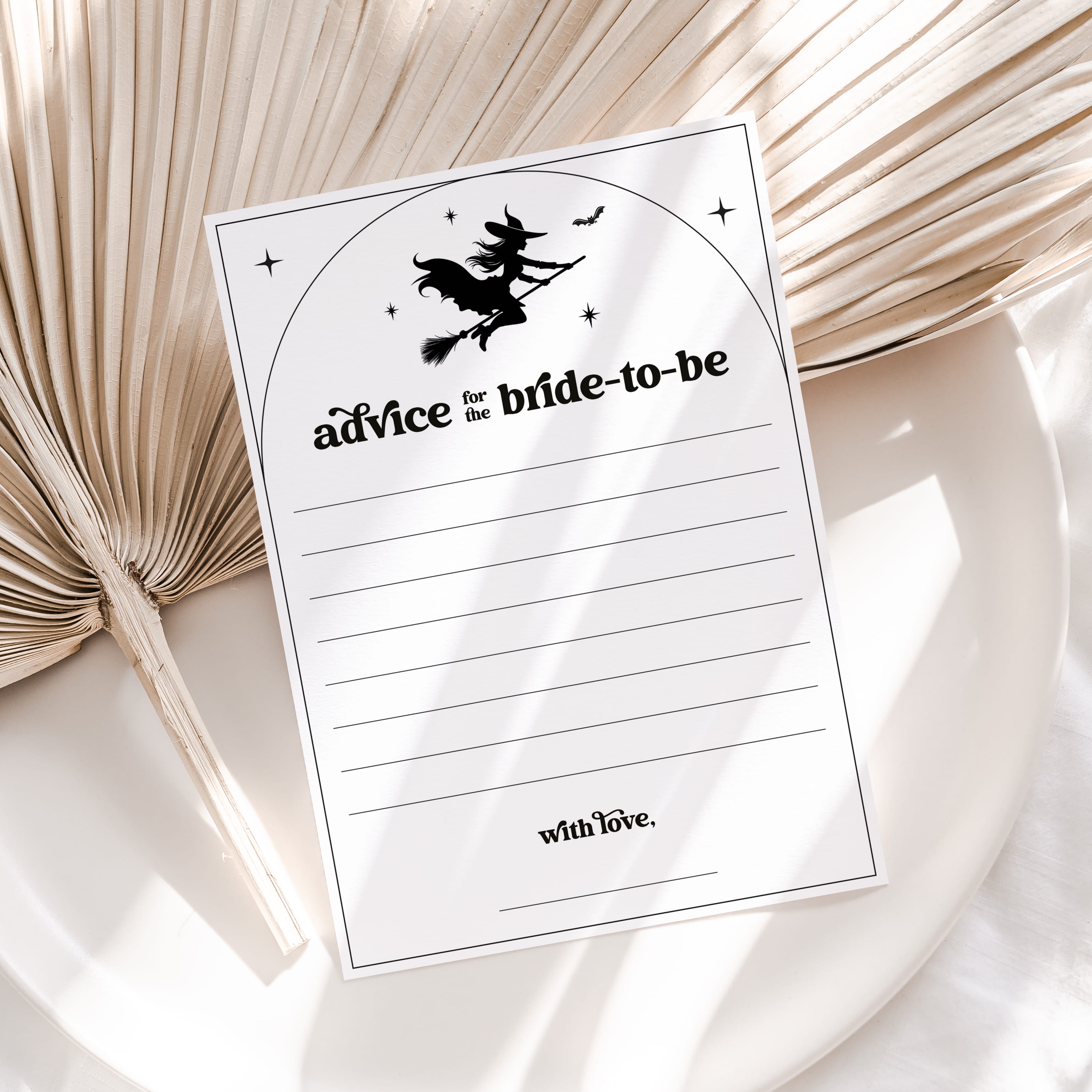 Create a meaningful keepsake for the bride to be with these witchy bridal shower advice for the bride-to-be cards. The advice card is the perfect addition to any witch theme bridal shower or Halloween wedding party. Let every guest write down their advice for the new bride and collect the cards for the lucky soon-to-be-Mrs.