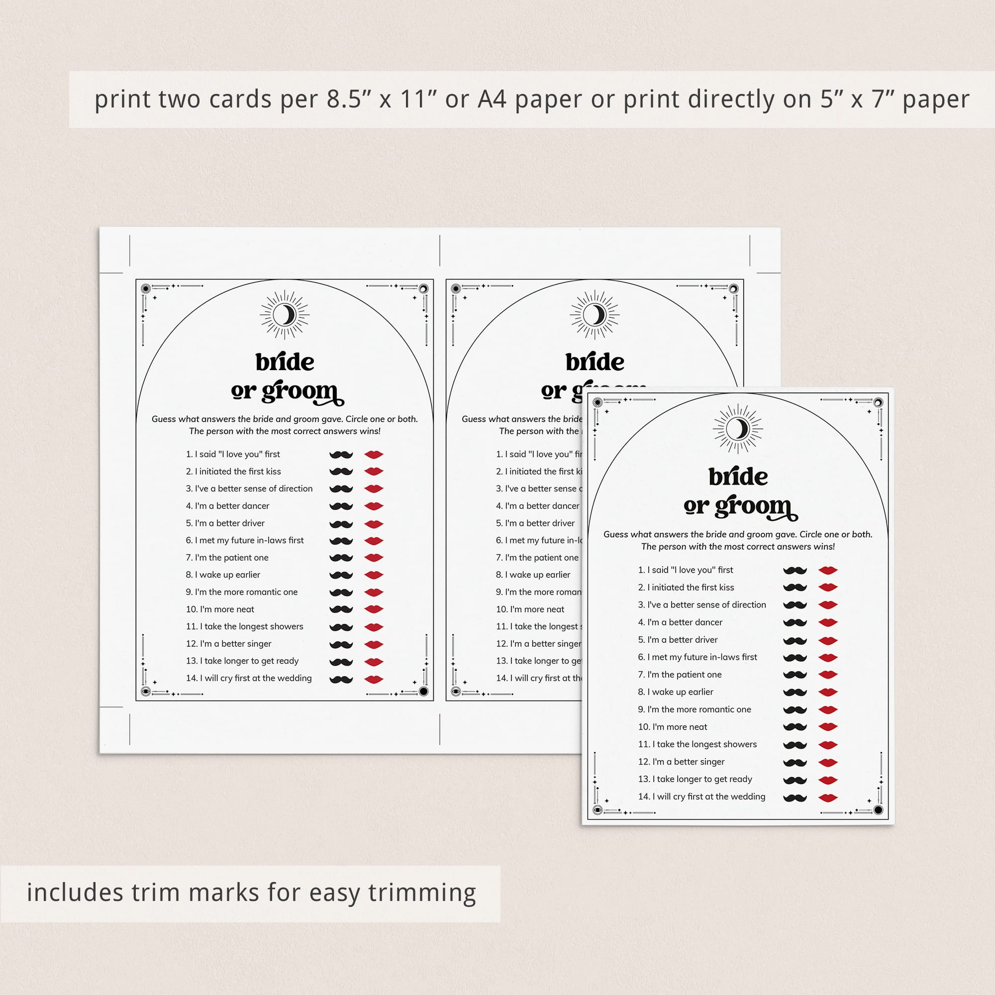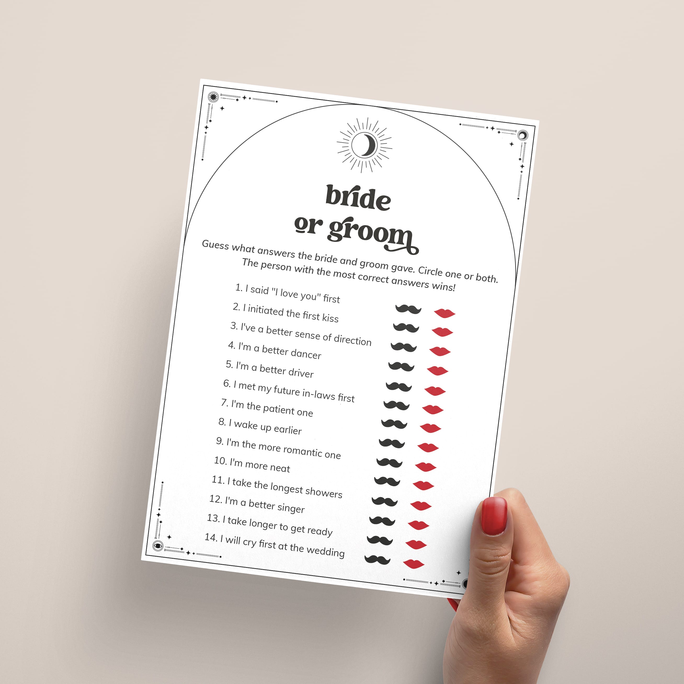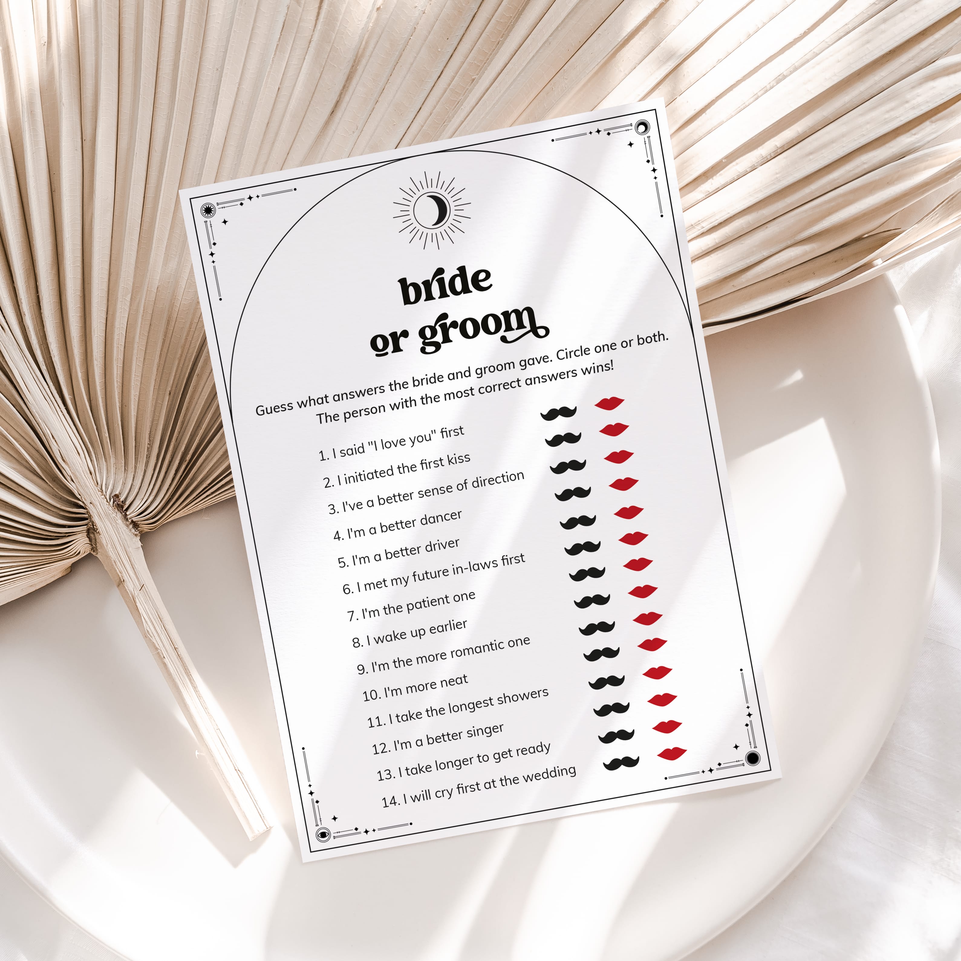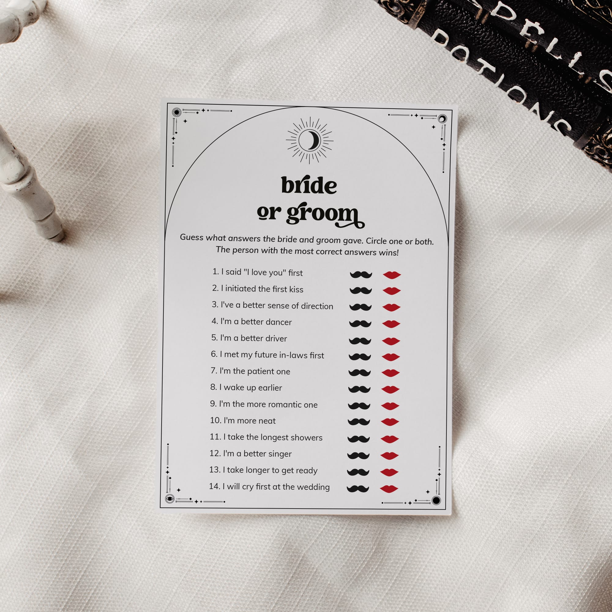 Are you hosting a Celestial Bridal Shower? Play Bride or Groom to get to know the soon-to-be-weds a little bit better. These printable game cards are perfect for a Moon and Stars theme Bridal Shower or co-ed Halloween wedding shower.