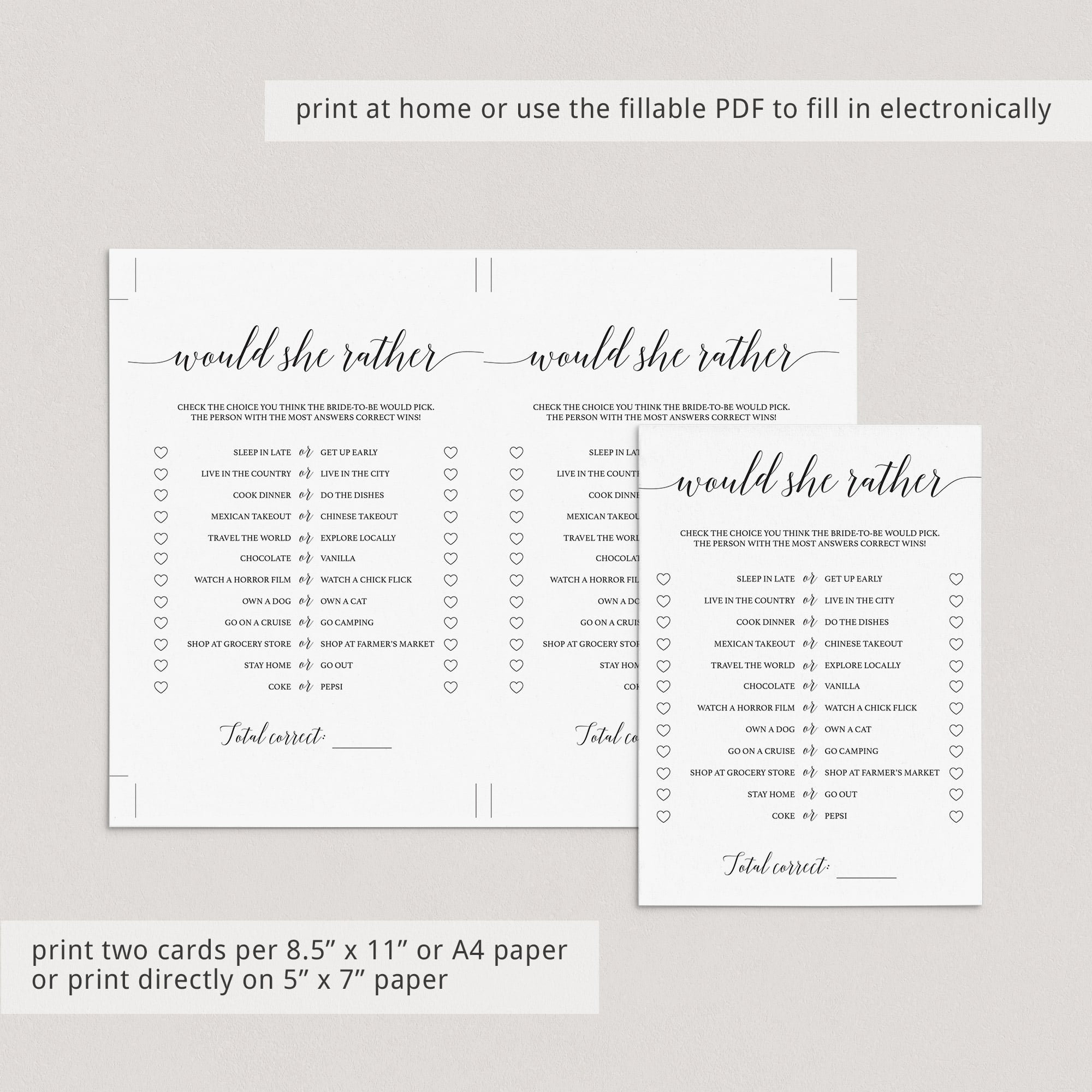 For an in-person bridal shower, download and print the games as many times as you need. We recommend printing on a nice heavy card stock for highest quality feel. The games have been designed in black and white. You can print on kraft paper to create a rustic look or print on colored cardstock for beautiful results. Print right from your computer in a matter of minutes or have the games printed at your favorite print shop.