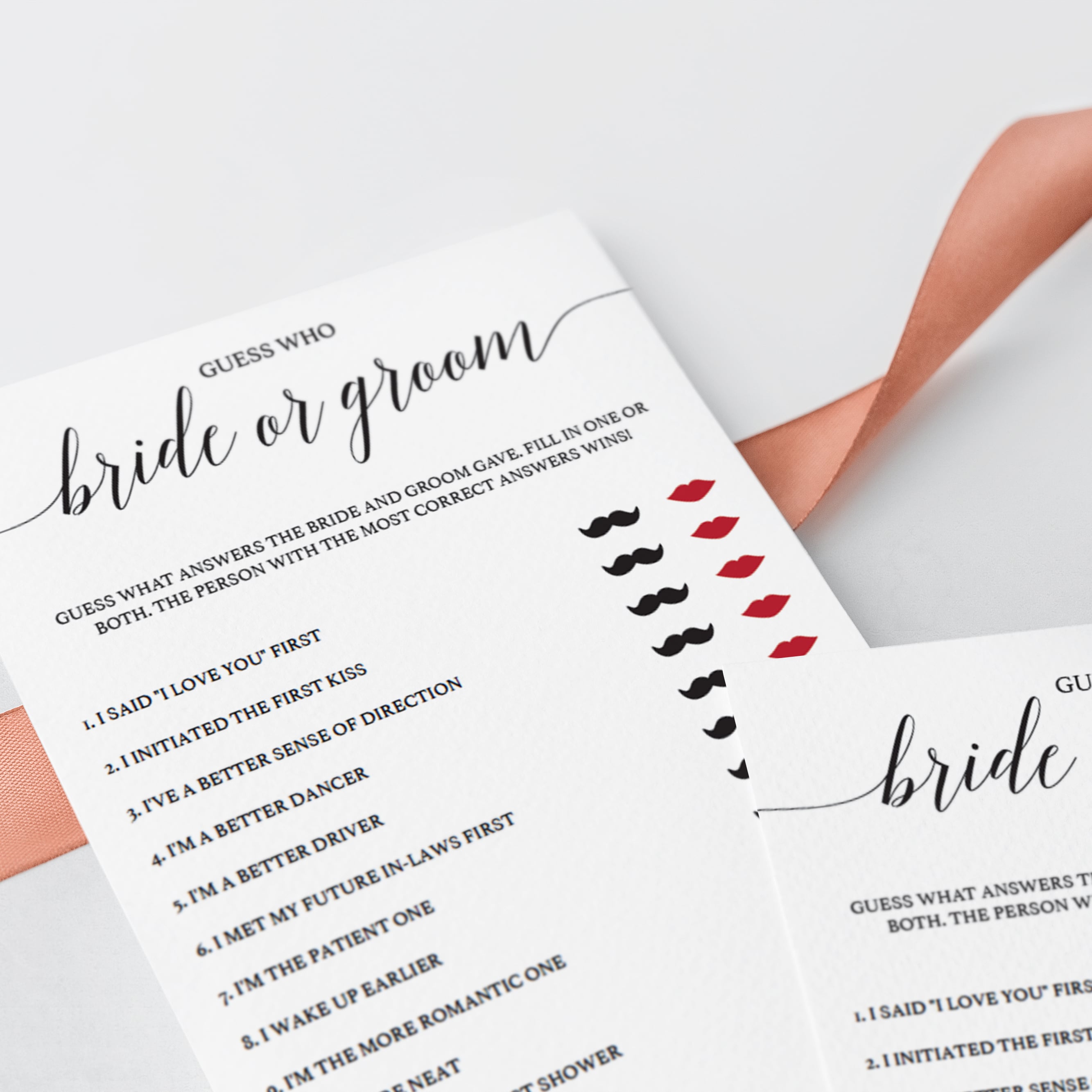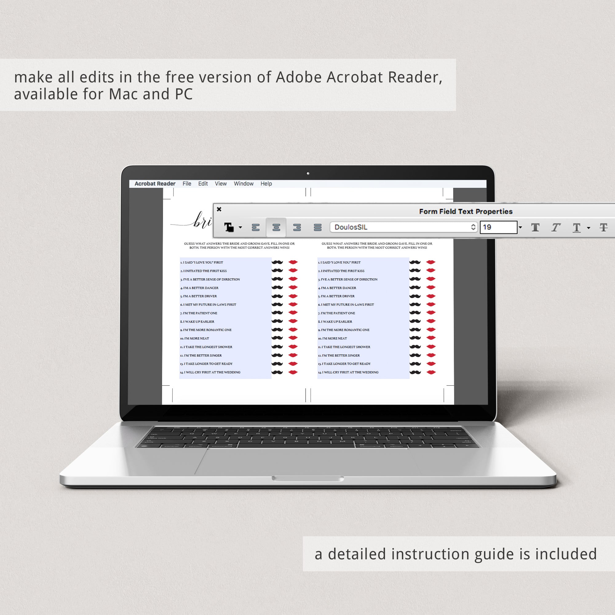 The games Bride or Groom and Mad Libs are editable in Adobe Acrobat Reader, so that you can personalize the games (please check the photos to see what parts can be edited).