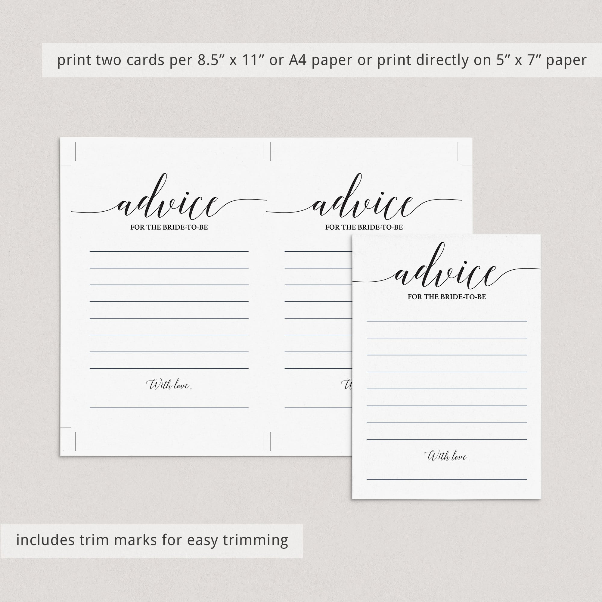 The bridal advice card has been designed in black and white. You can print on kraft paper to create a rustic look or print on colored cardstock for beautiful results. A detailed instruction guide with tips & tricks on editing, trimming, paper choices and more is included.