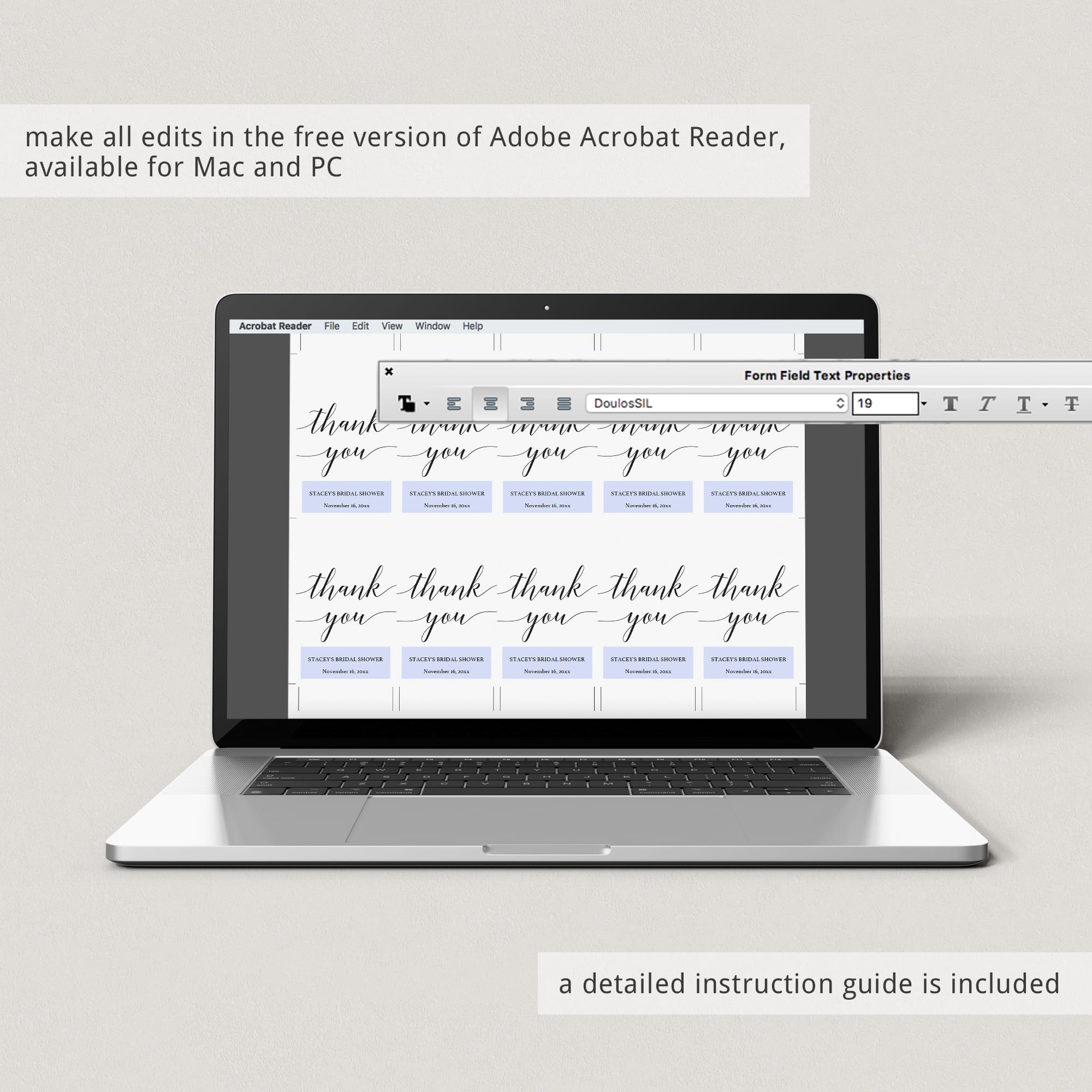 Thank your guests for coming with this elegant bridal shower thank you tag with calligraphy font. The bridal shower tag is an editable template. Easily edit the text yourself in the free version of Adobe Acrobat Reader and personalize the tag with your own words.