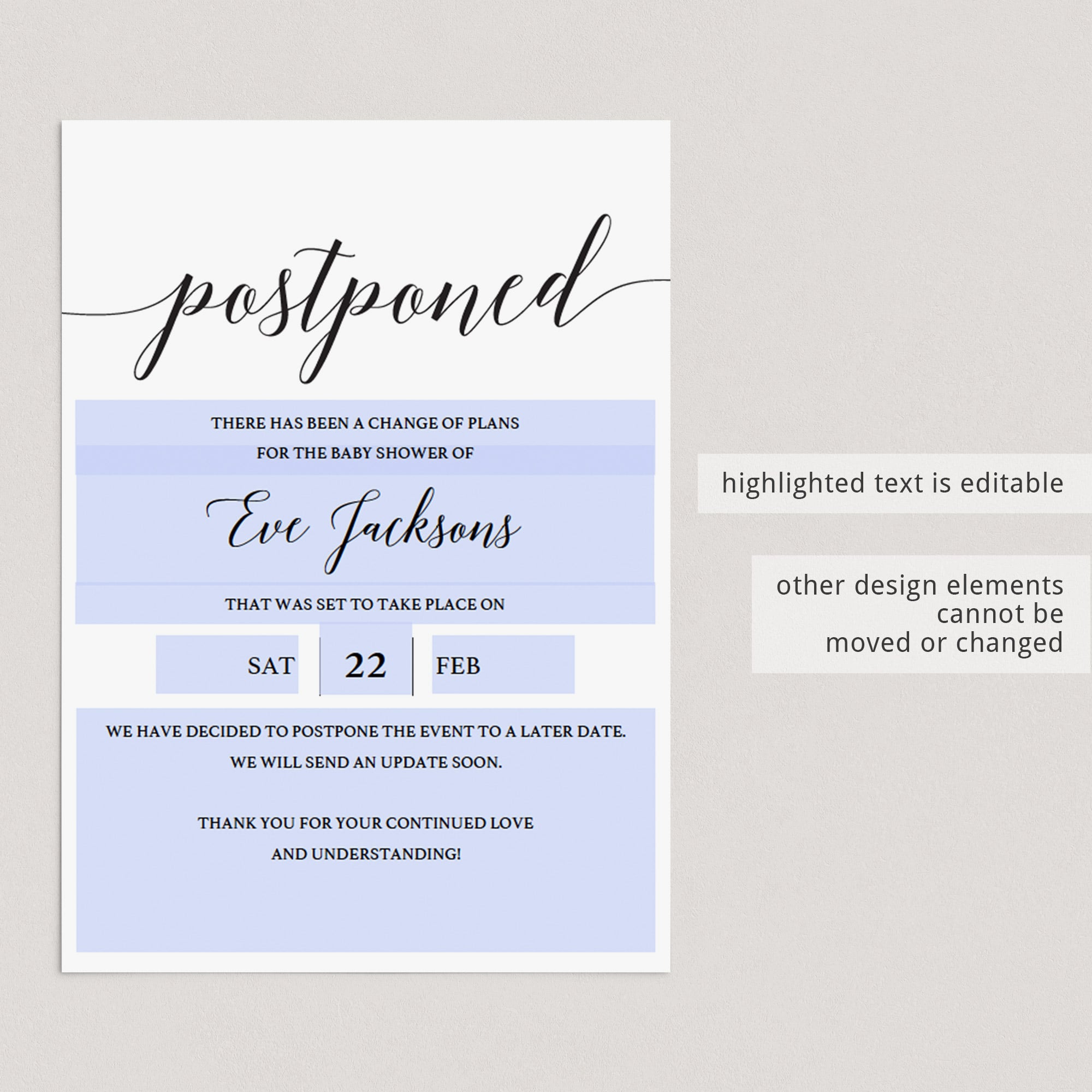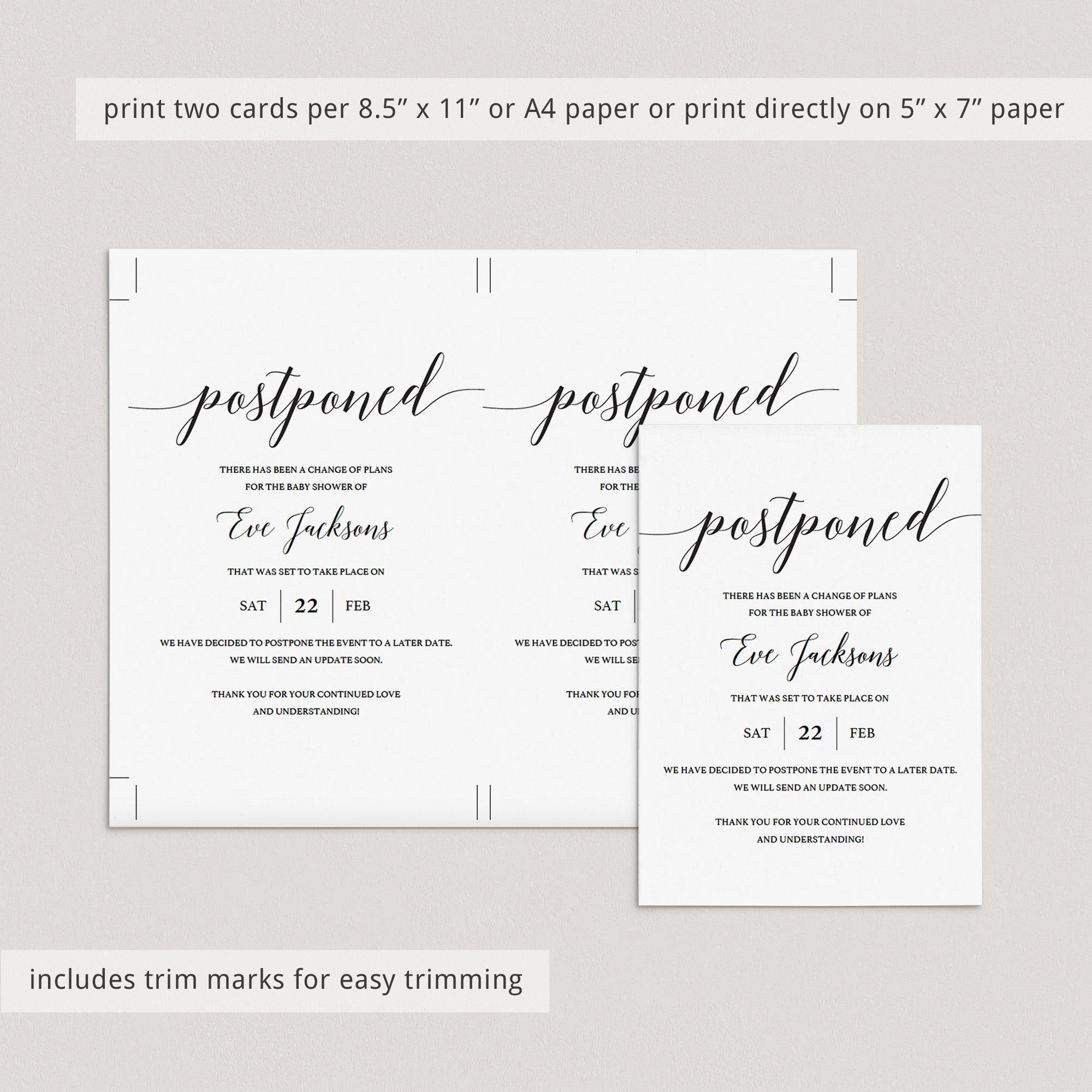 And if you don't want to print the cards yourself, have them printed at your favorite print shop or use the included digital postponed announcement template to inform your guests by email.