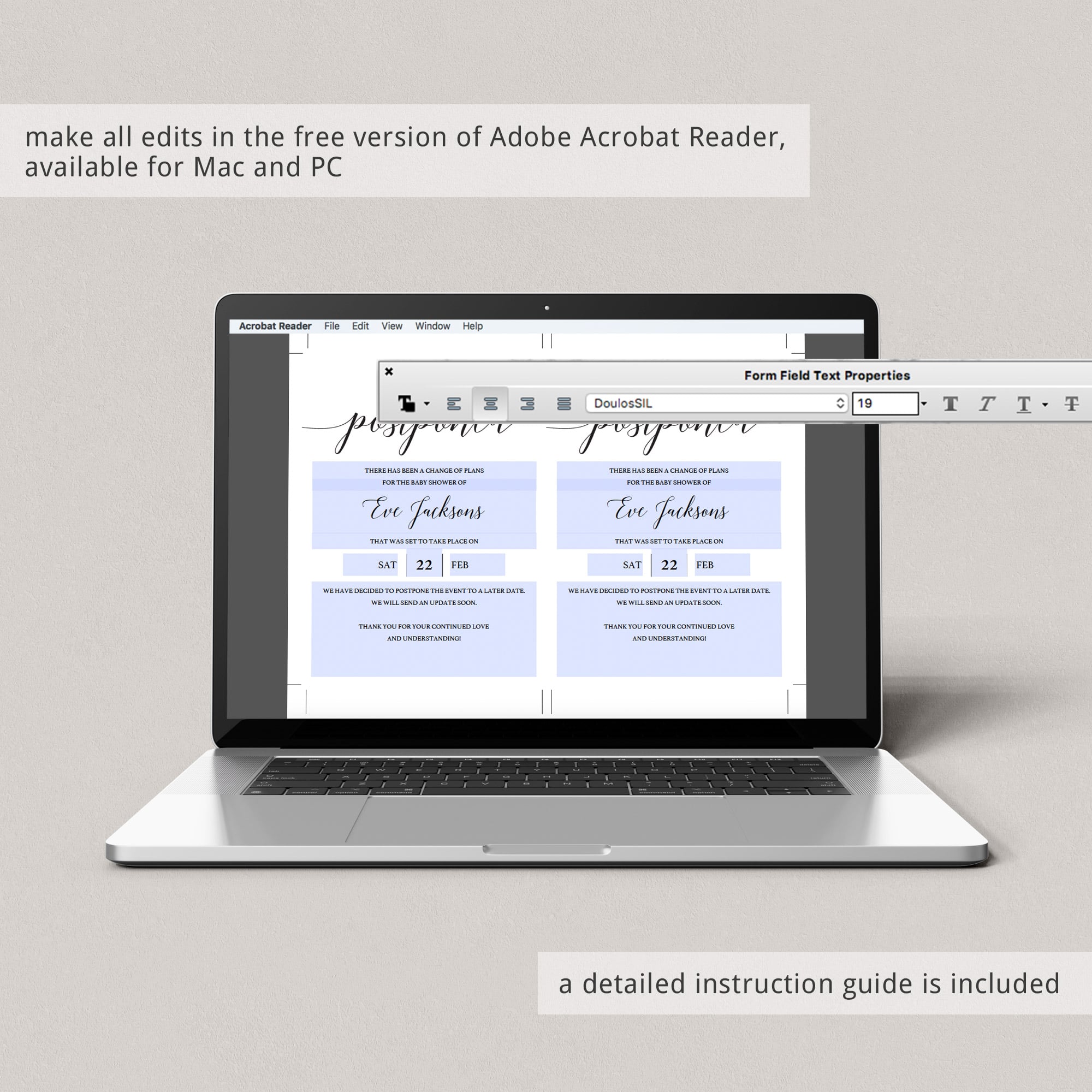 The Postponed Baby Shower announcement card is editable in the free version of Adobe Acrobat Reader. After downloading the file, fill in your text and print the cards in just minutes.