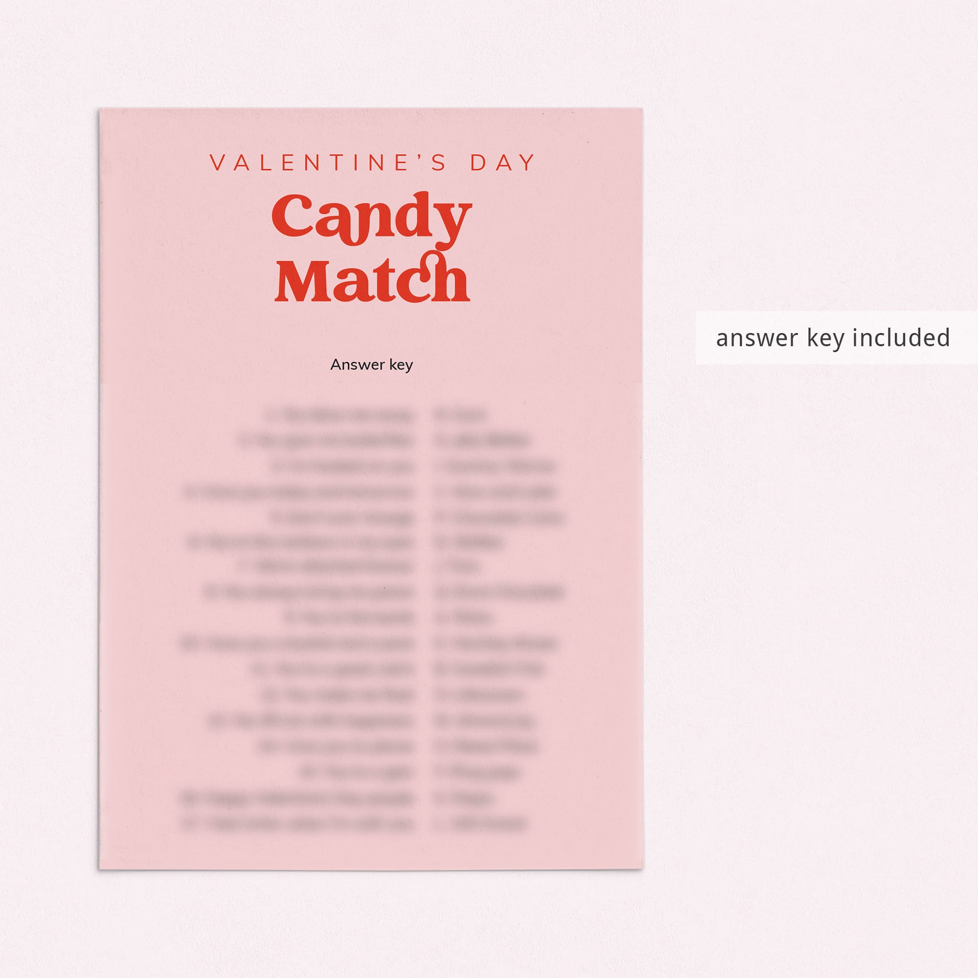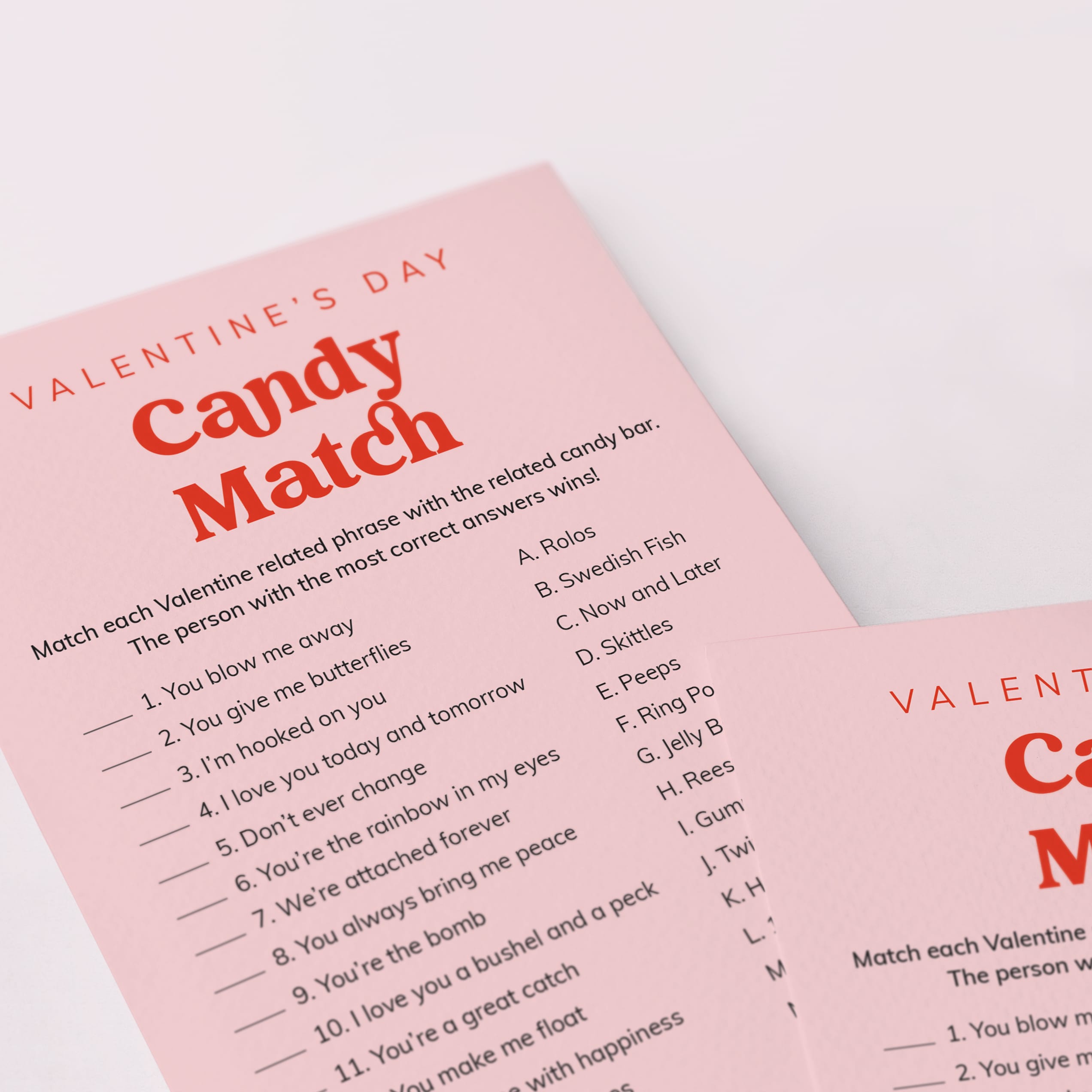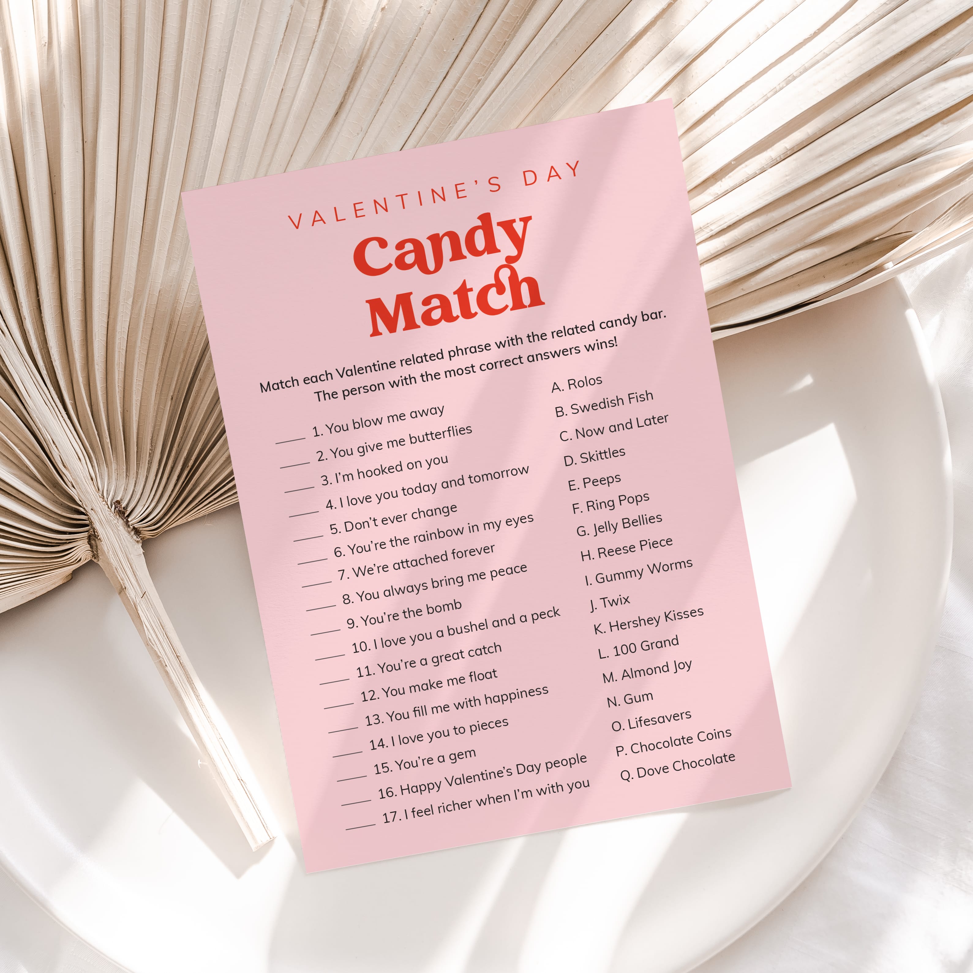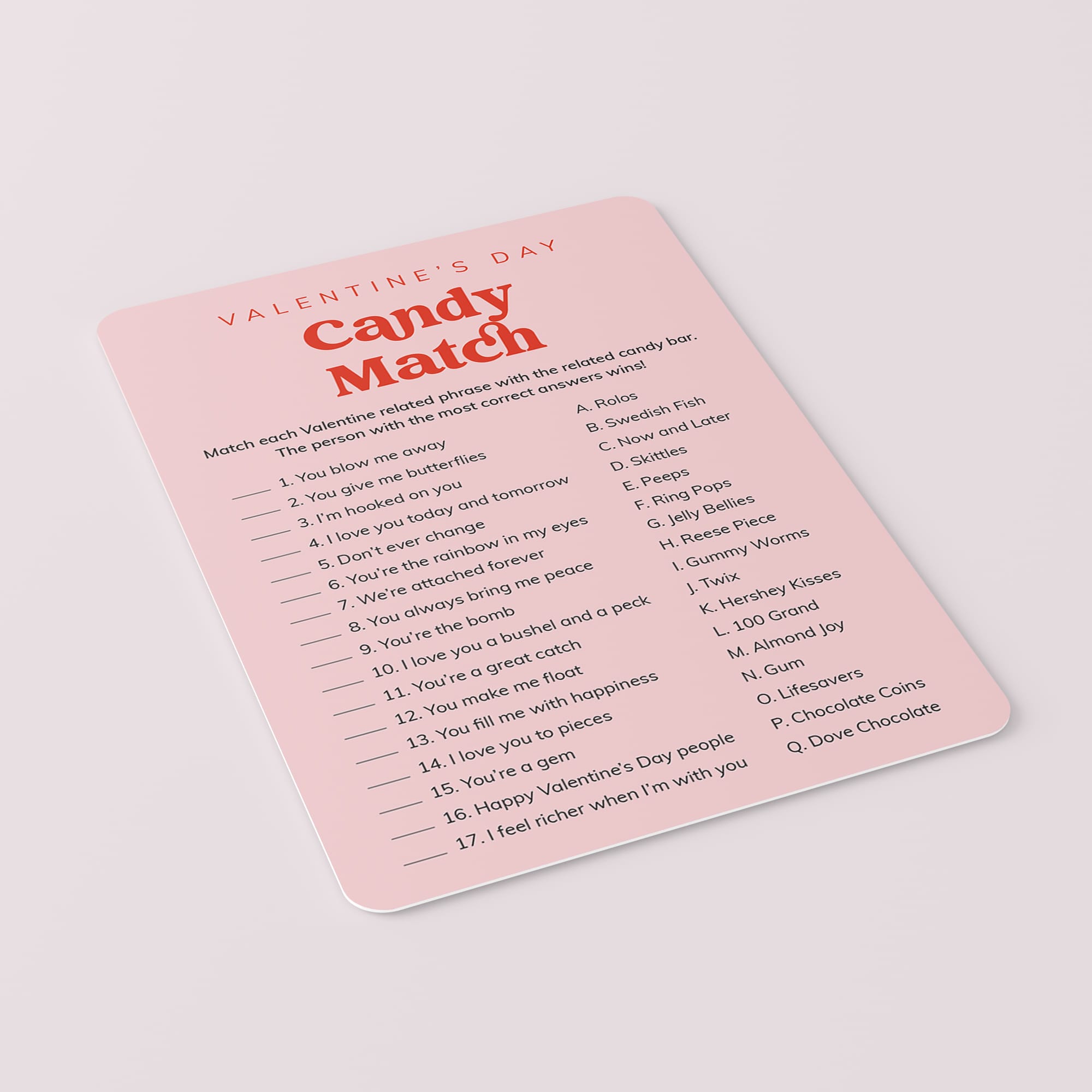 This vibrant Pink and Red Candy Match game has a list of 17 candies and Valentine's-related sayings that go along with each candy. For example, “We're attached forever” is a match with a “Twix”. The person with the most correct answers wins some tasty treats.