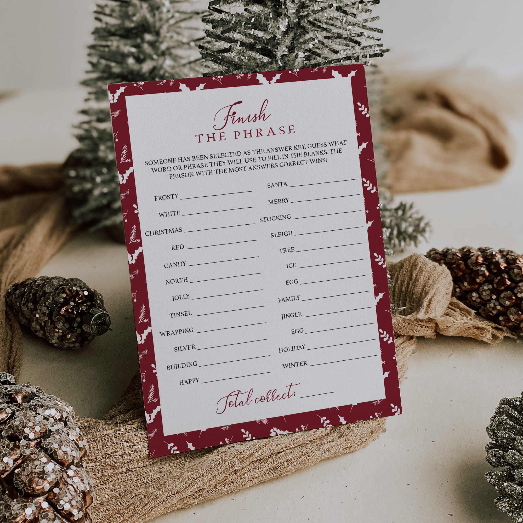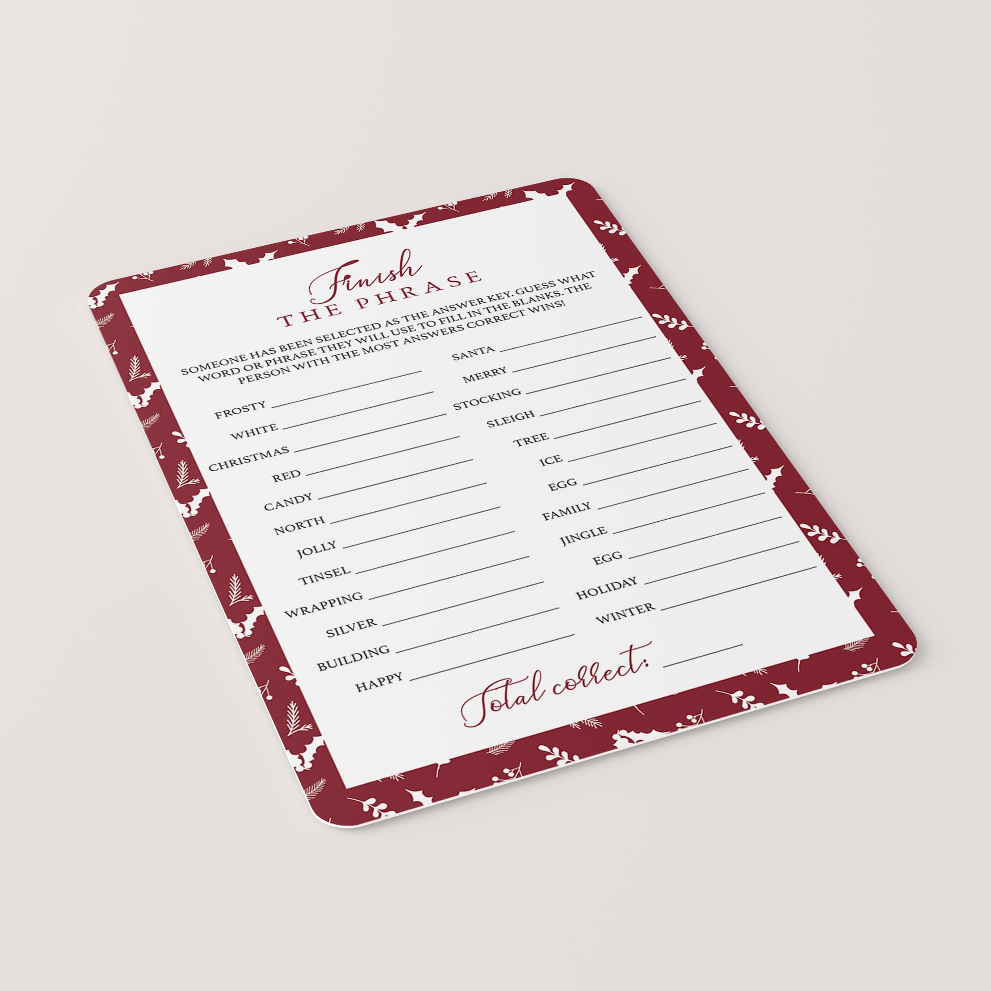 This red and white Christmas Finish The Phrase game is an instant download, so simply download and print the cards as many times as you need. Print at the comfort of your home or order the games from a local or online print shop.