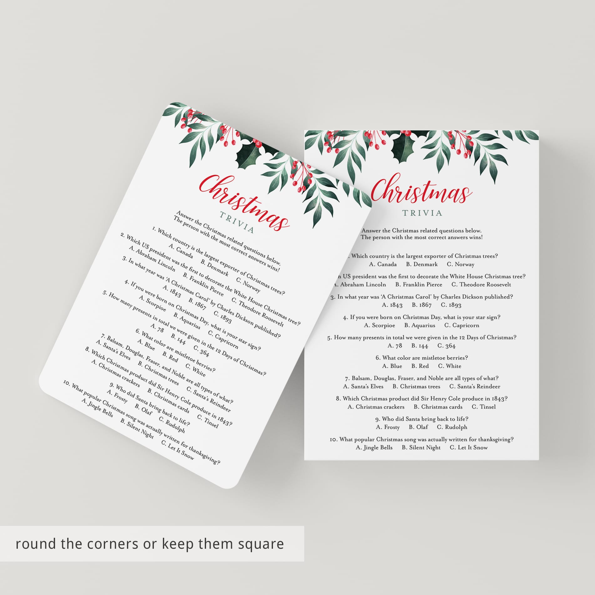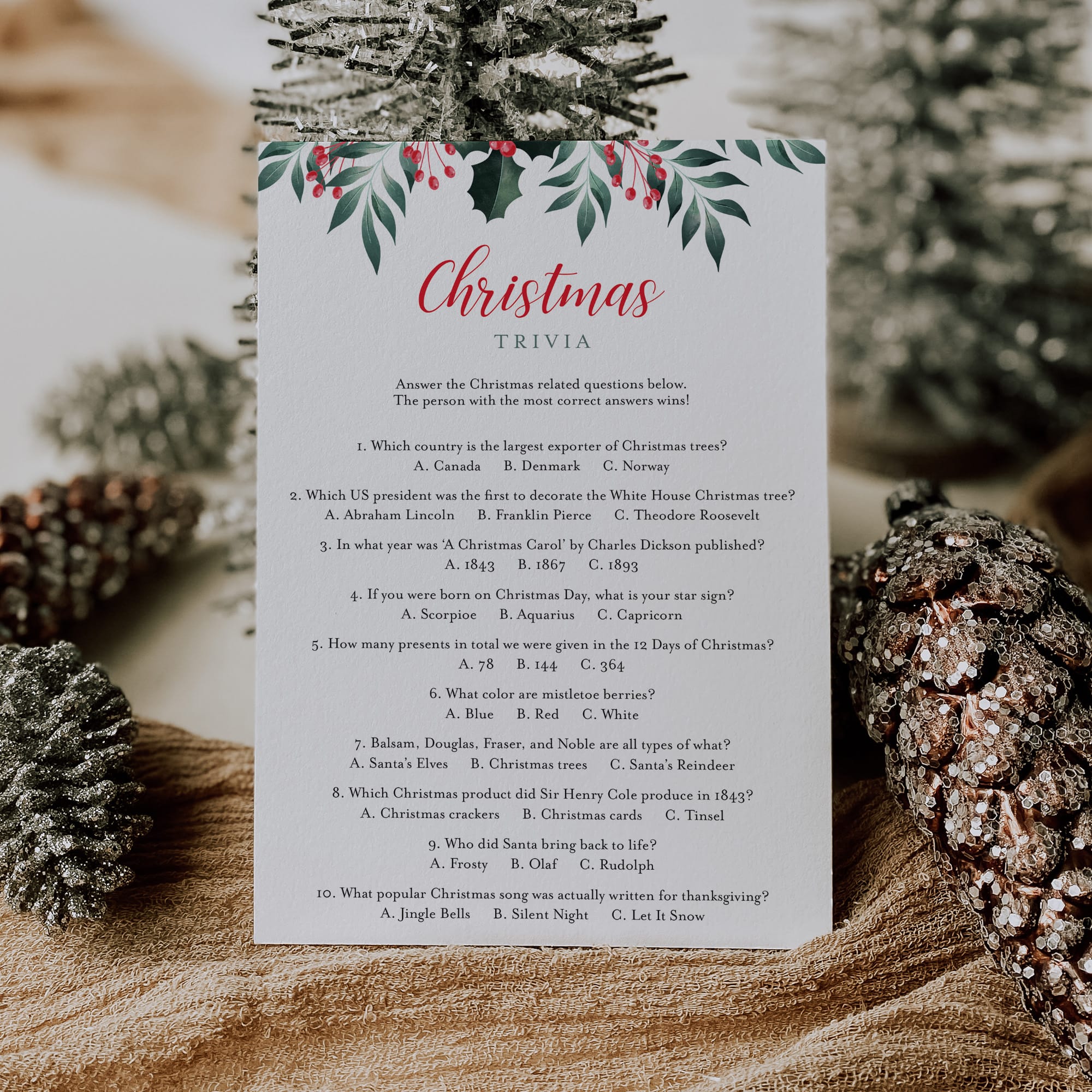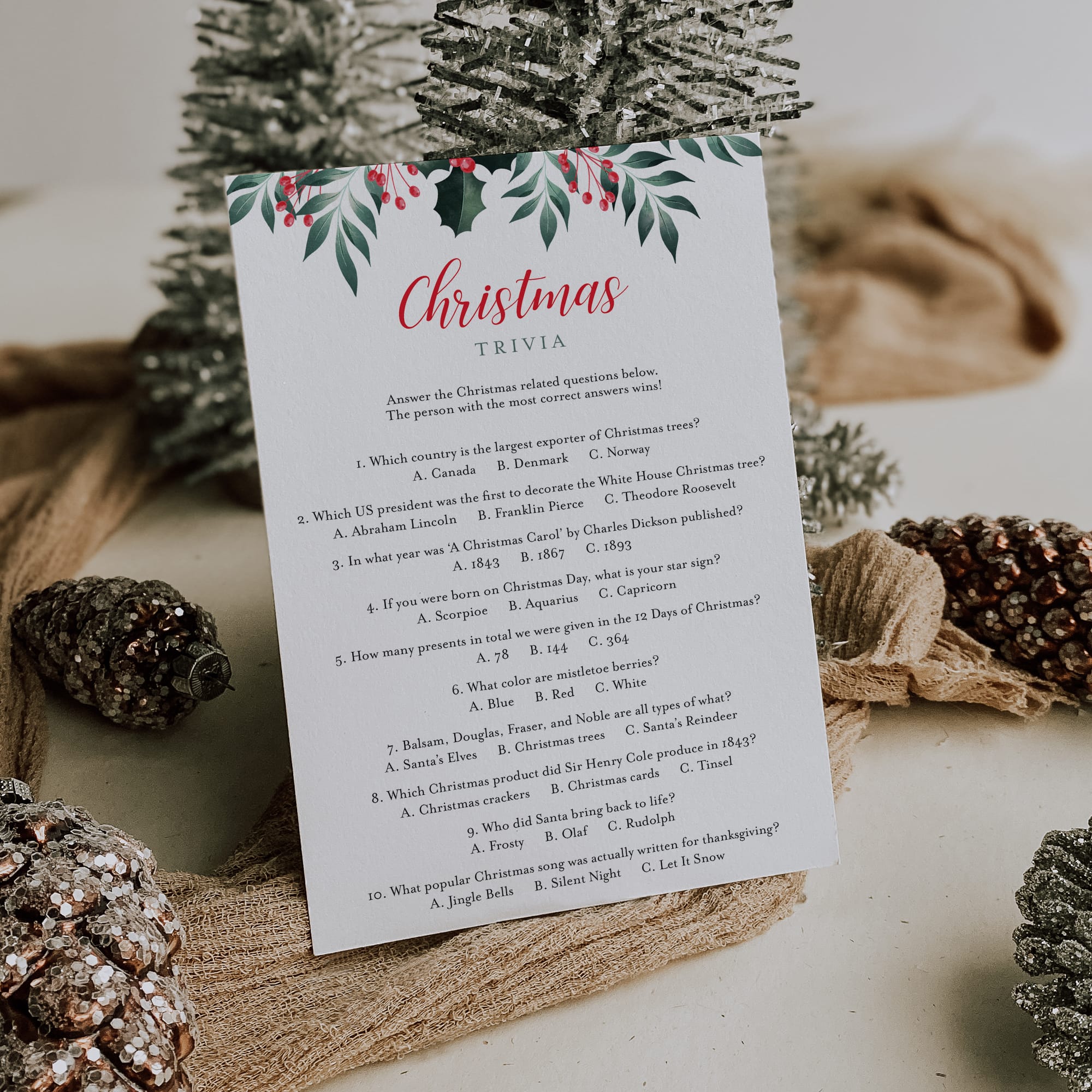 Are you hosting a Christmas party? Use this greenery Multiple Choice Christmas Quiz with to test your guests Christmas knowledge. Which country is the largest exporter of Christmas trees? And what popular Christmas song was actually written for Thanksgiving? Play this Christmas Quiz to find out! It’s a great challenging game to play at your Christmas party.