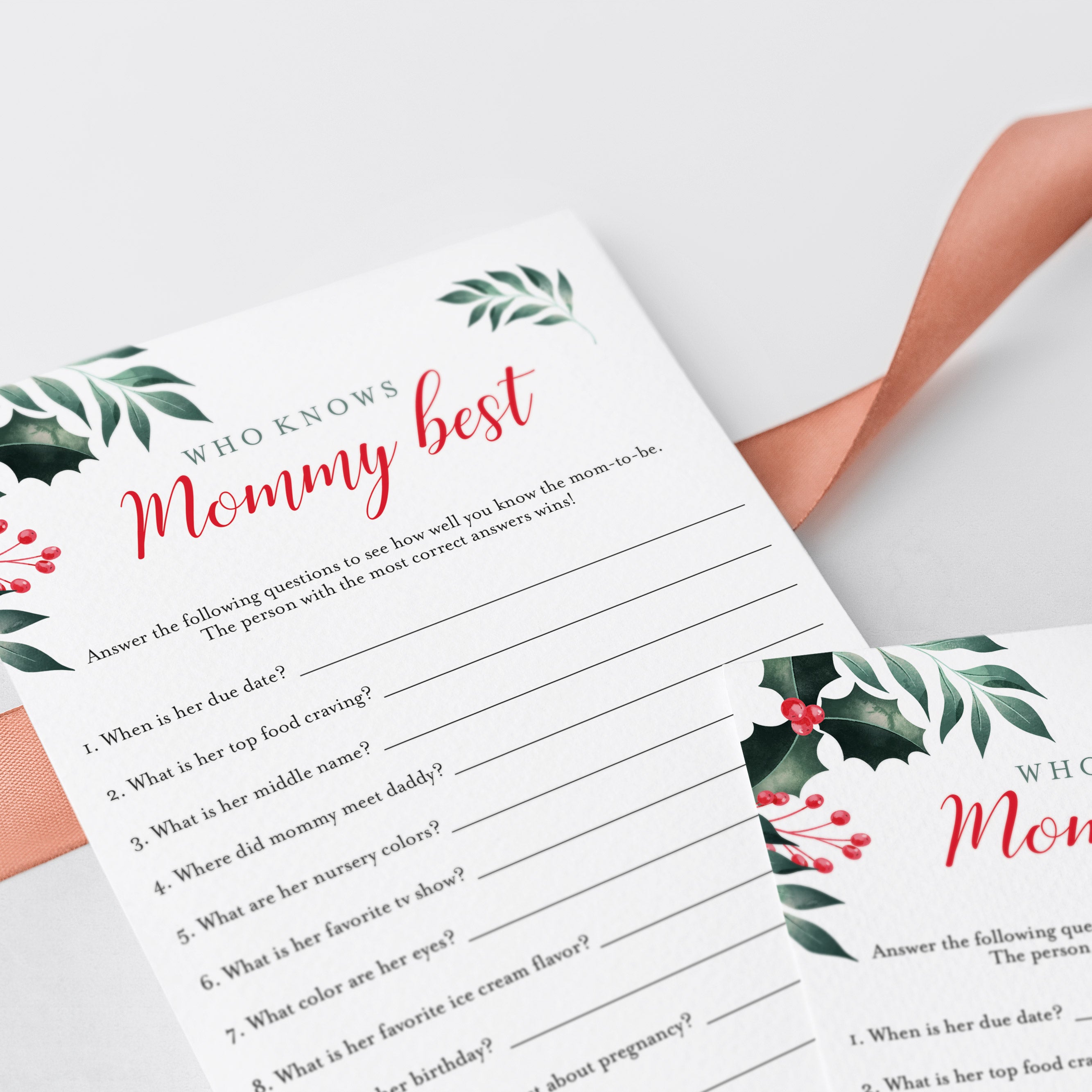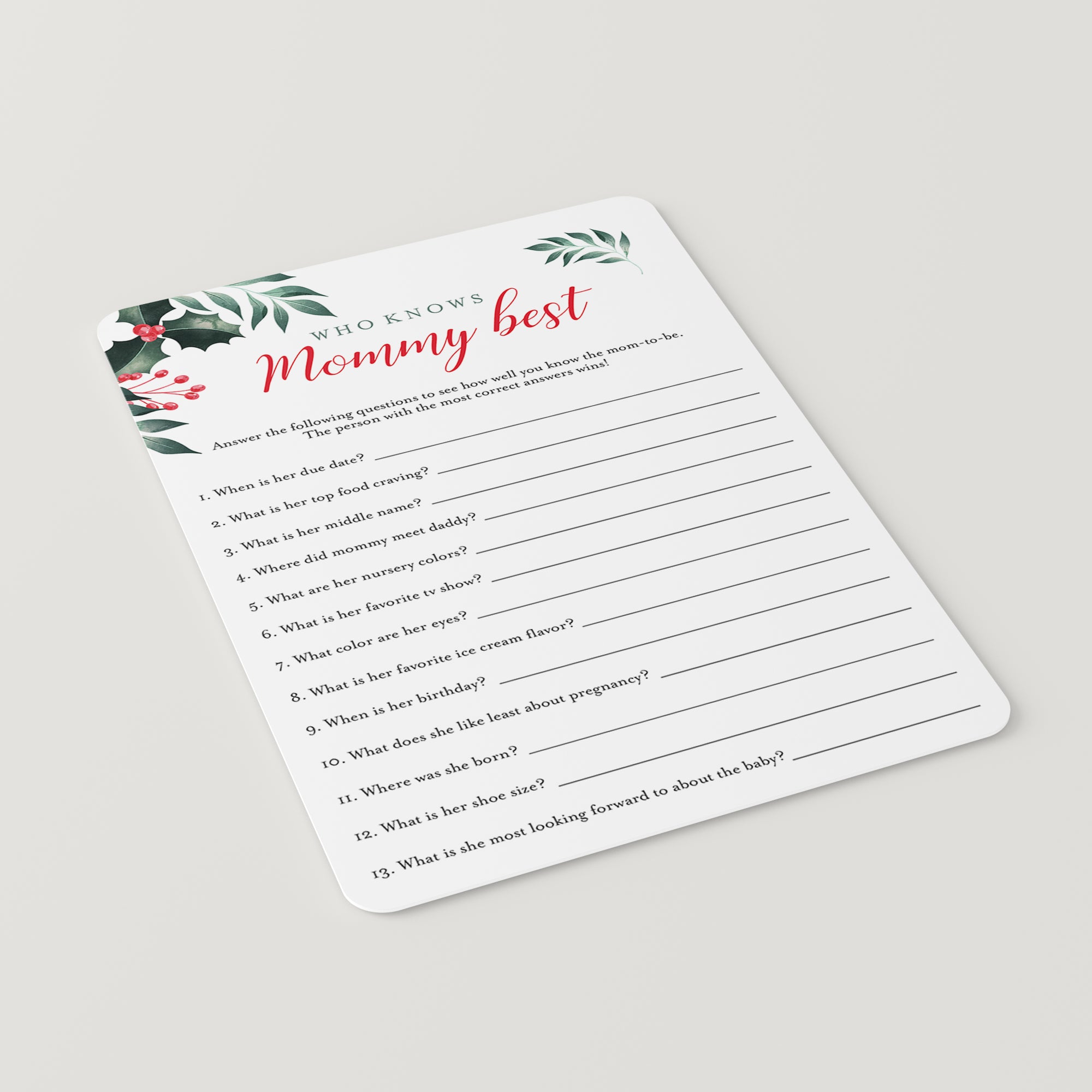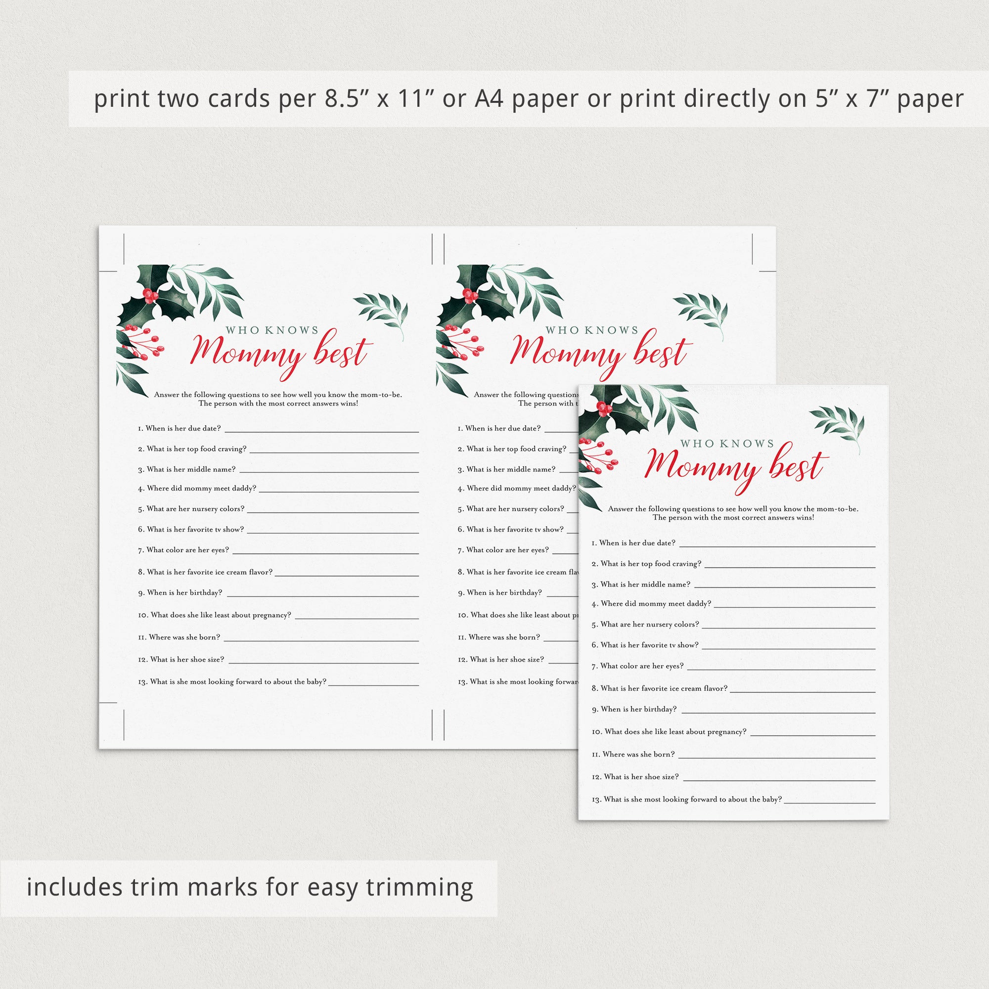 Test your guests how good they know the mommy-to-be and play ‘Who knows mommy best’ with these gorgeous Christmas baby shower game cards. The watercolor Christmas holly and red berries will ensure that you have those special holiday vibes at your party. This mommy trivia is a great way to bring disparate people together and to put them all in a party mood.