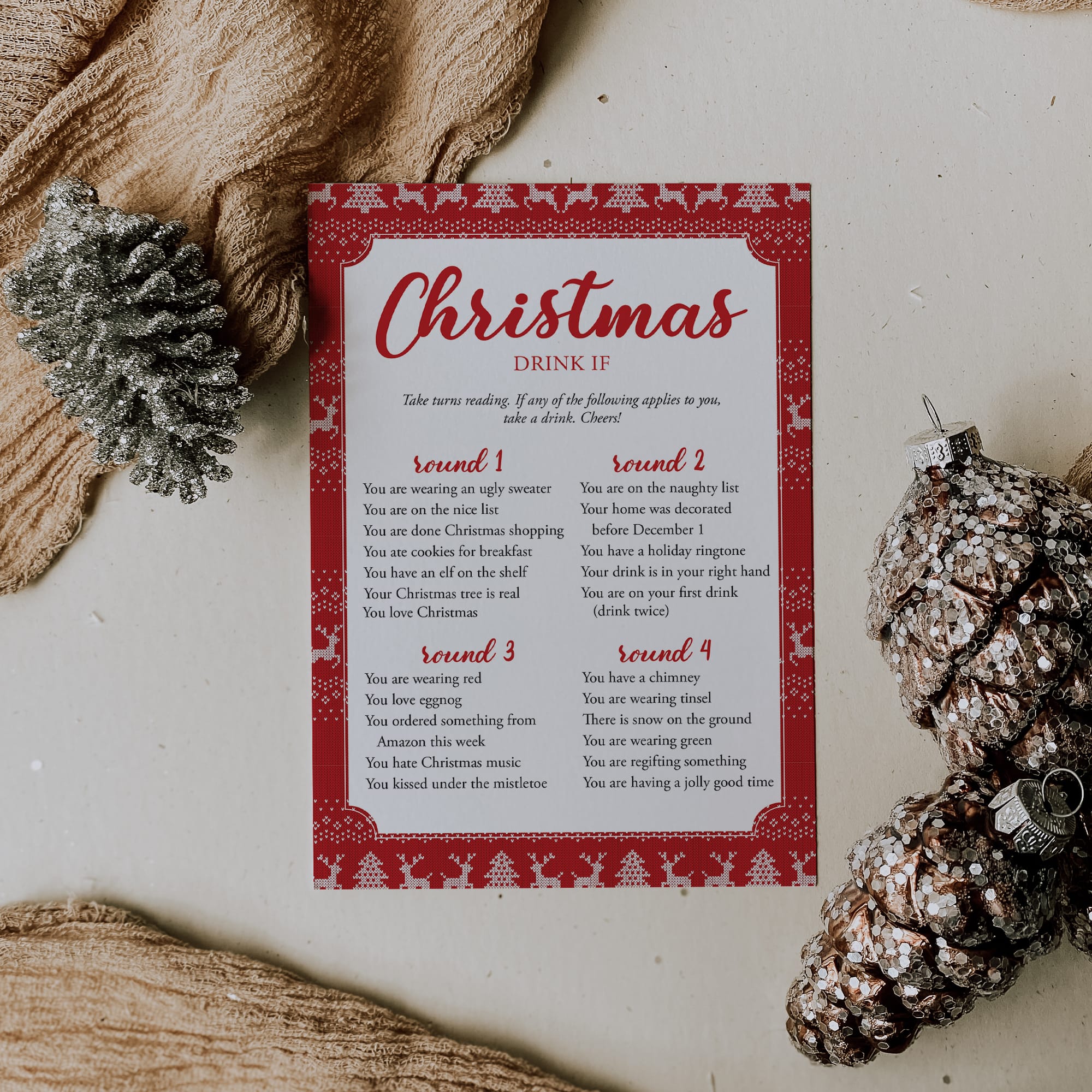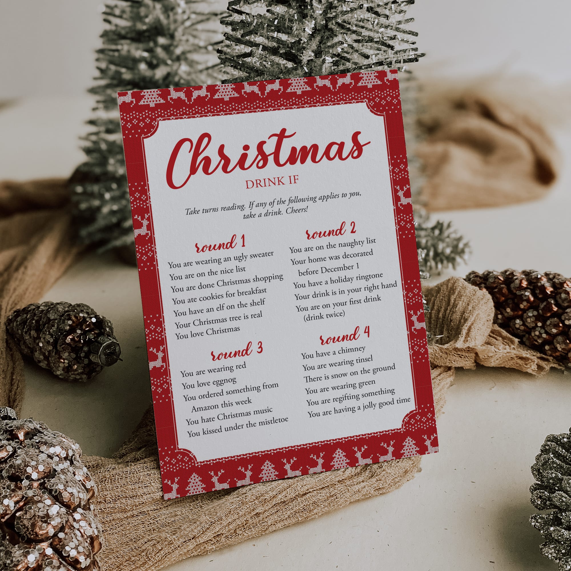 Are you hosting a Christmas Party? Grab a drink and play this hilarious Christmas Drink If game! Lots of fun and laughter guaranteed.