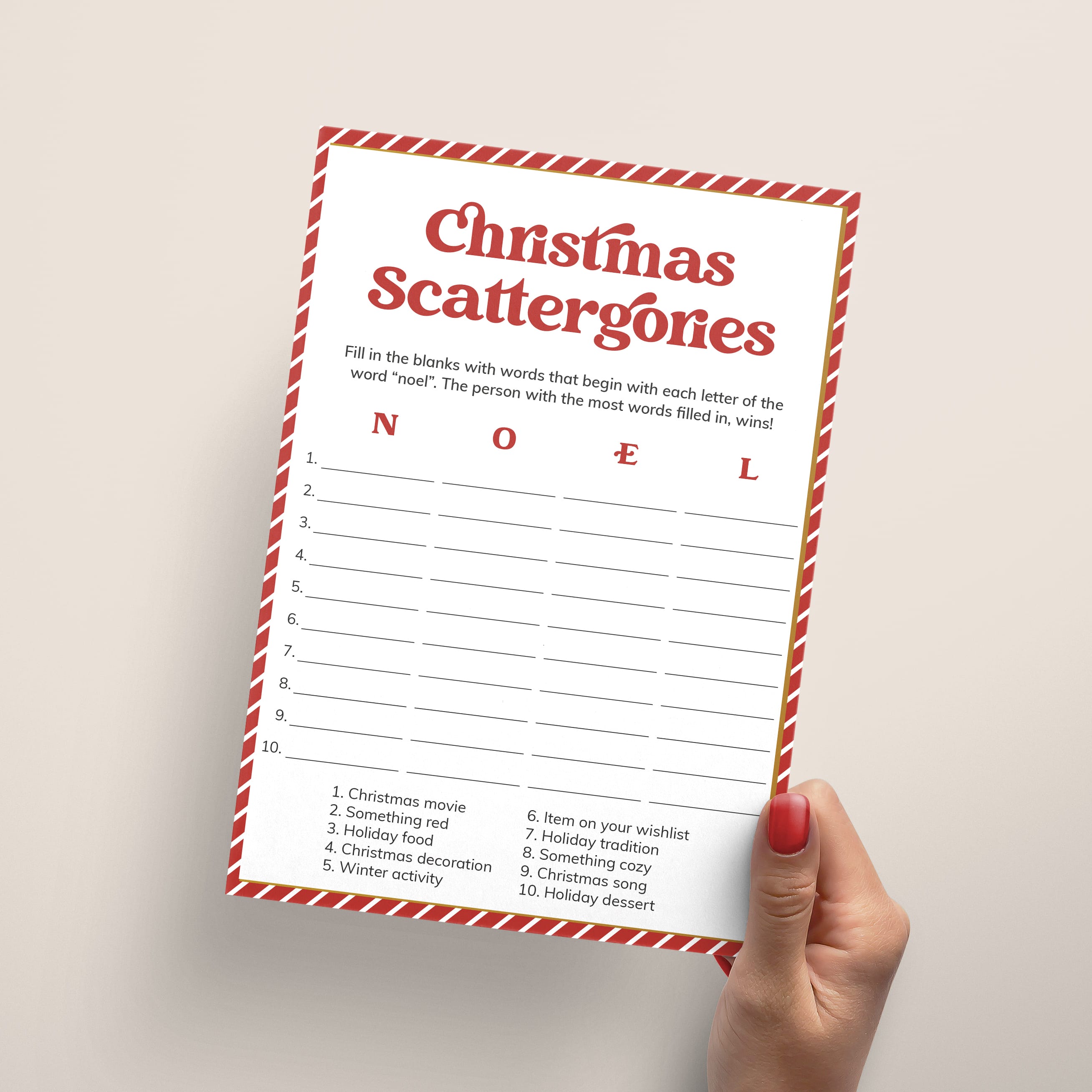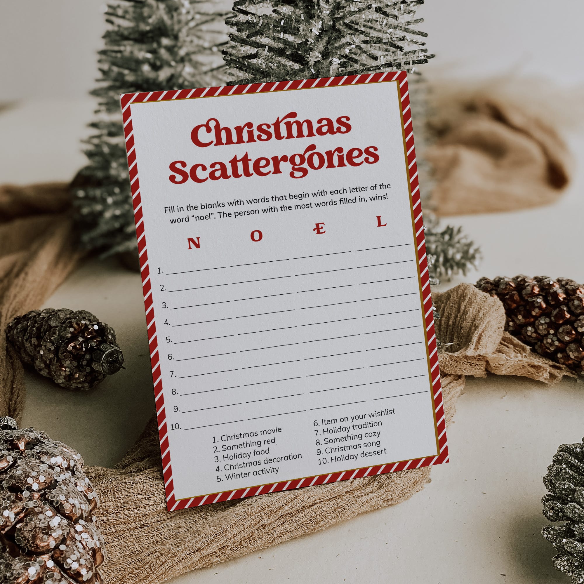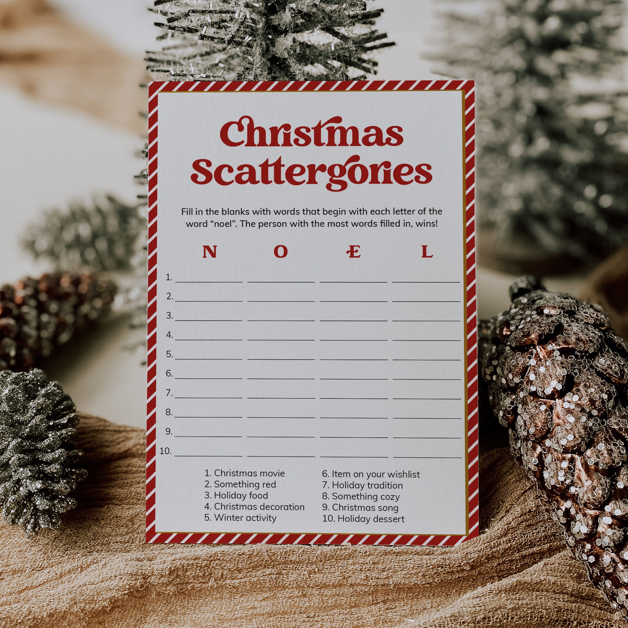 How many words can you fill in with the letters "N", "O", "E" and "L"? Play Christmas Scattergories with family and friends with this classic game card designed with a nostalgic red & white striped border and a bold vintage font.